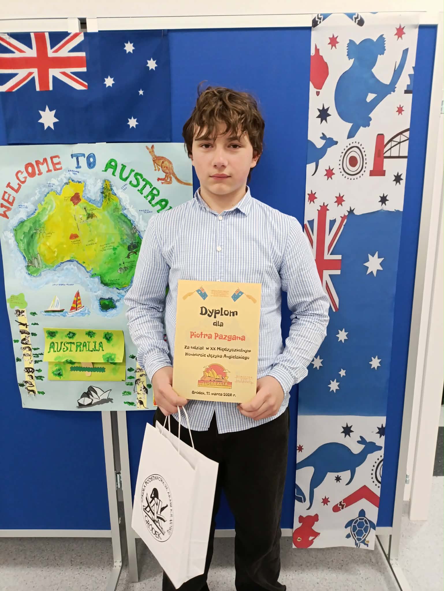 W dniu 31.03. w Szkole Podstawowej w Gródku odbył się XX Międzyszkolny konkurs języka angielskiego pod hasłem „Australia and New Zealand”. Naszą szkołę reprezentował Piotr Pazgan z klasy VI, który wcześniej wygrał klasowe eliminacje do konkursu. Piotr musiał się wykazać świetną znajomością języka angielskiego oraz zaprezentować opis wcześniej wylosowanego obrazka. Dodatkowo na koniec zmagań czekał na niego quiz wiedzy kulturoznawczej na temat krajów anglojęzycznych – w tym roku były to Australia i Nowa Zelandia.