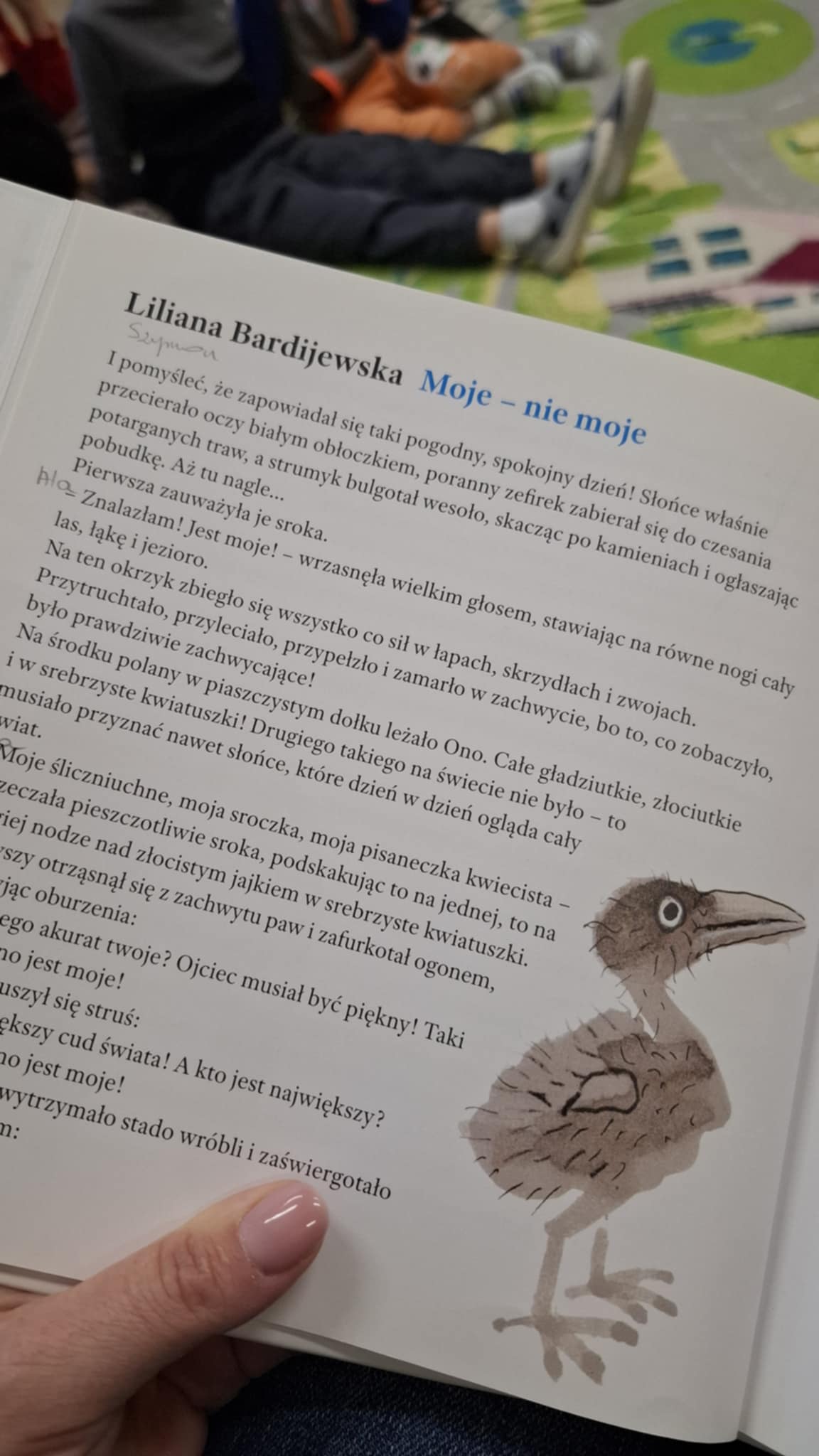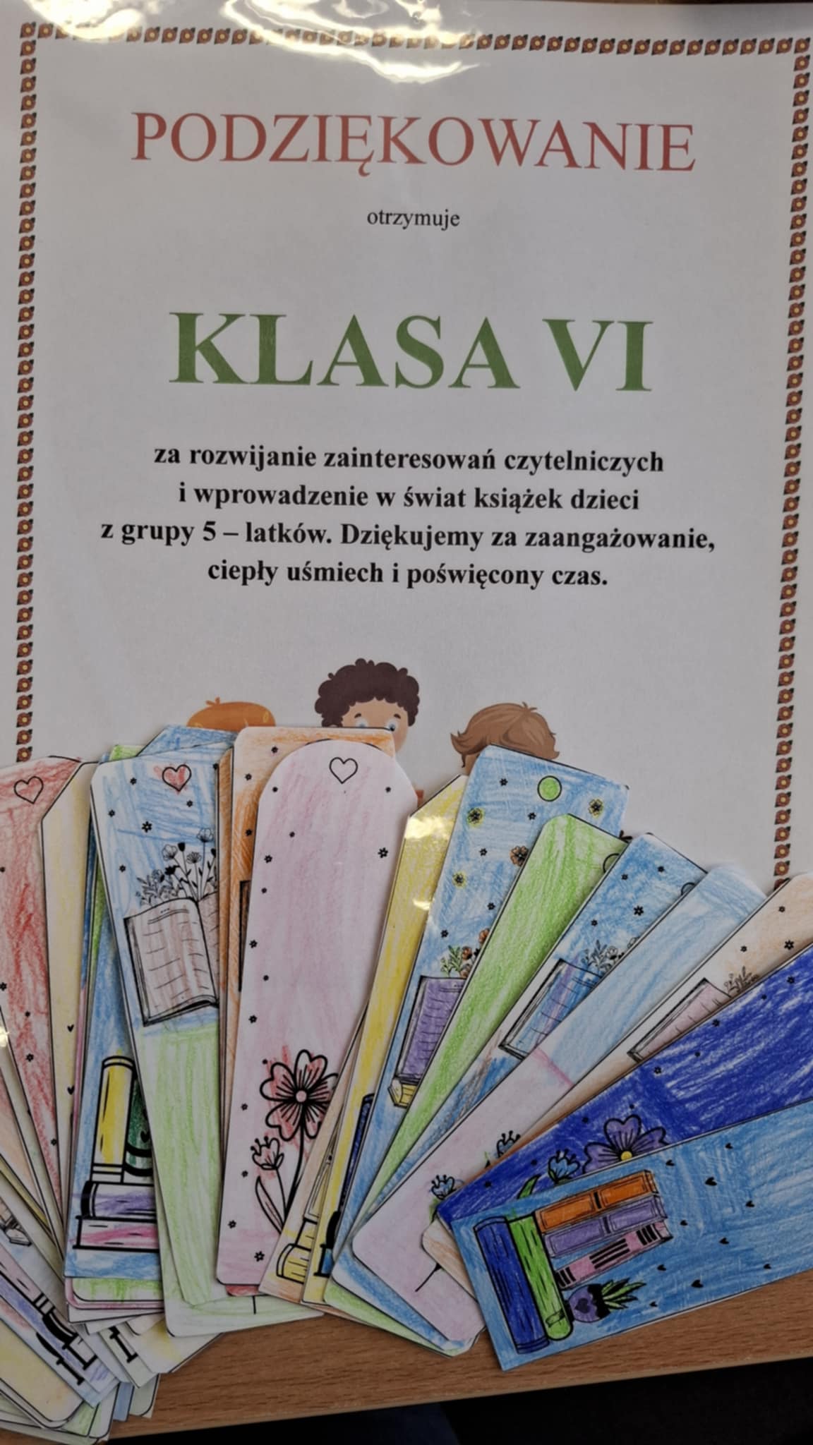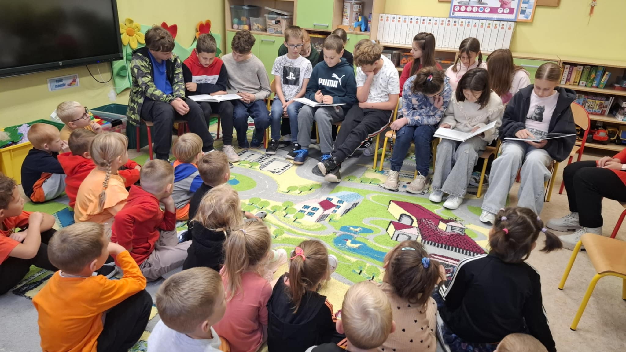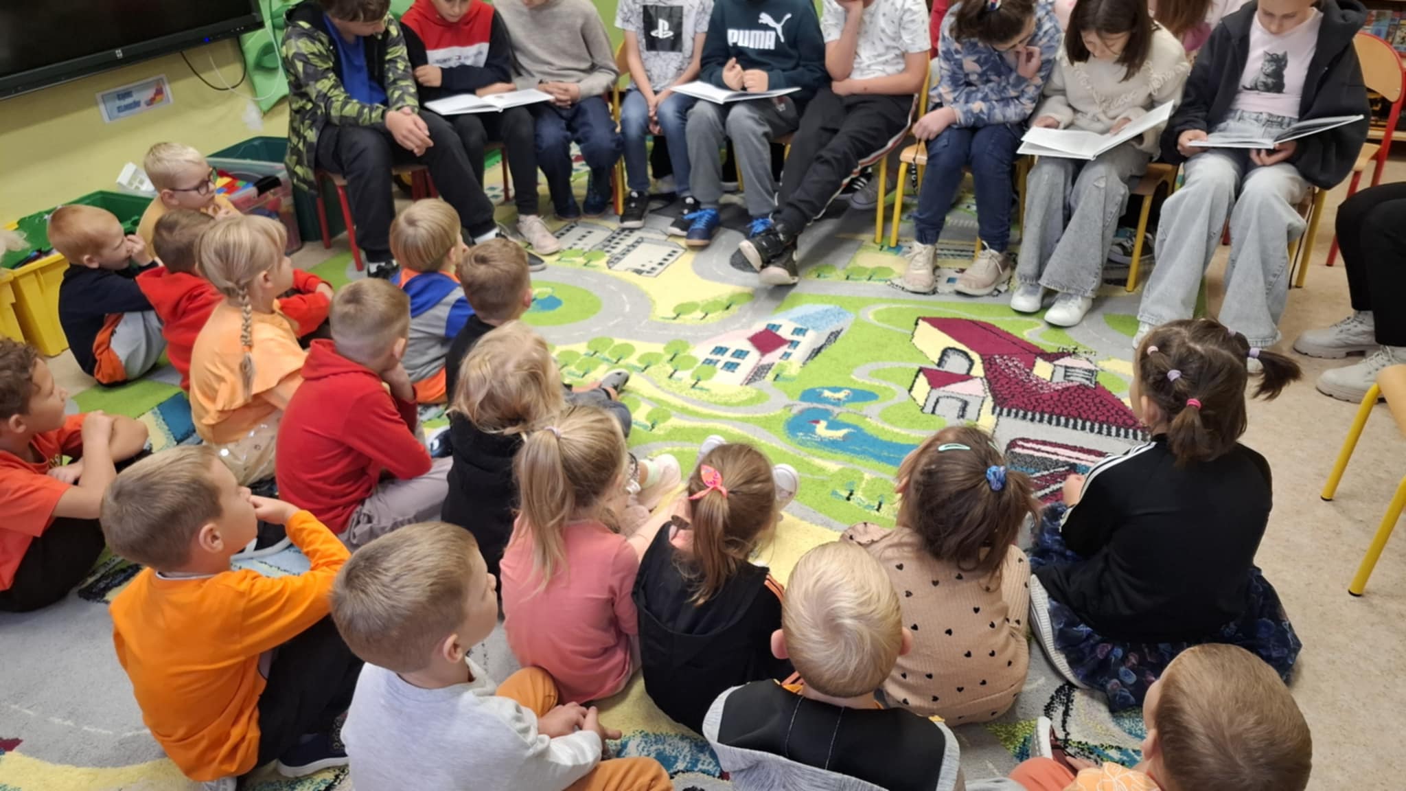 Z okazji Dnia Głośnego Czytania klasa 6 przygotowała bajkę pt: Moje- nie moje. Przeczytali ją z podziałem na rolę dla grupy 5-latków. Dzieci słuchały z zainteresowaniem a starsi koledzy z klasy 6 czytali z dużym zaangażowaniem:)