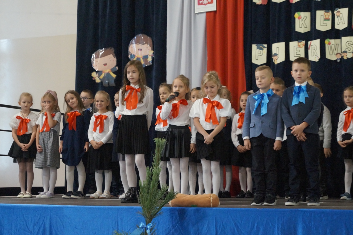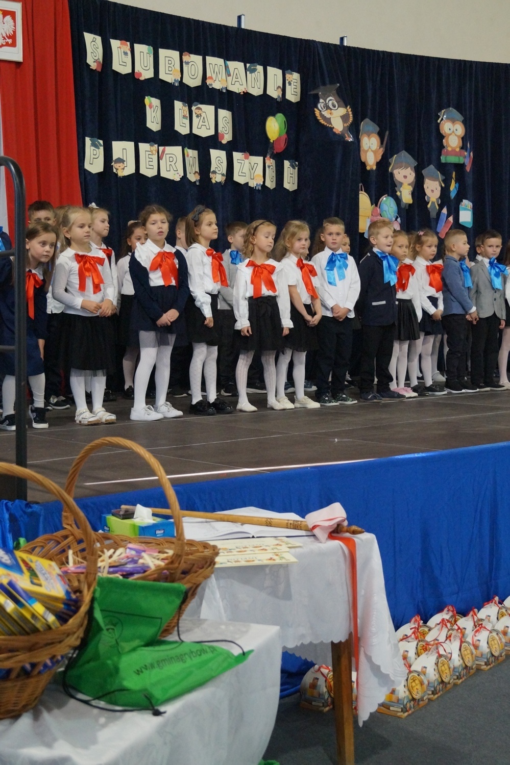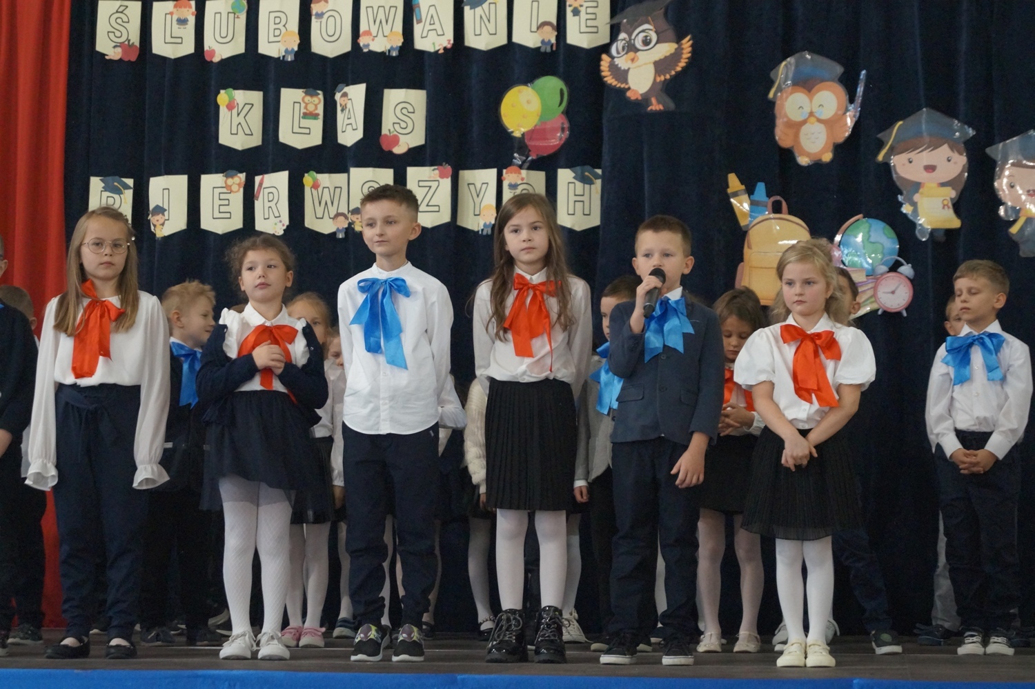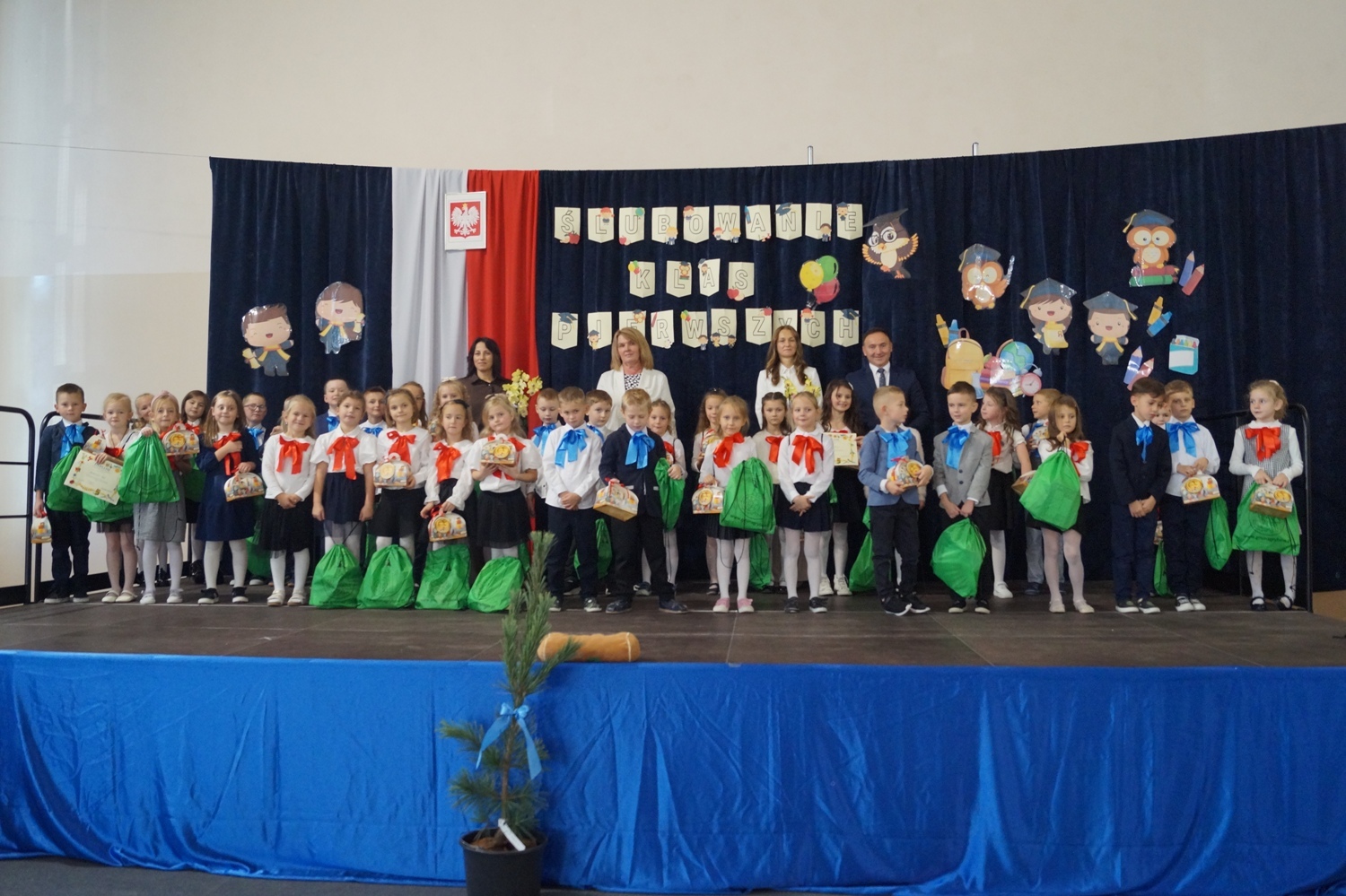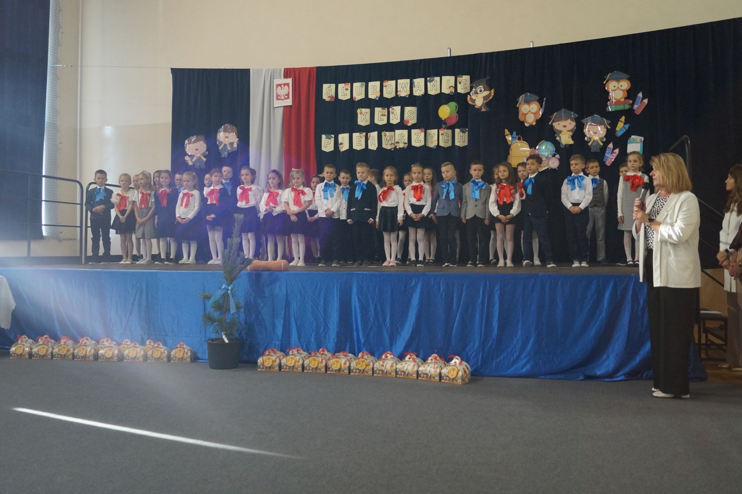 To wielkie wydarzenie rozpoczęła p. Dyrektor Urszula Ząber witając gości: Wójta Gminy Grybów p. Jacka Migacza, Grono Pedagogiczne, rodziców, społeczność szkolną oraz głównych bohaterów - Pierwszoklasistów. Obie klasy zaprezentowały swoje talenty recytatorskie, umiejętności wokalne i na sam koniec nie zabrakło żywiołowego tańca. Po tak obszernym i wymagającym zaprezentowaniu się z wielką radością dzieci zostały przyjęte do grona Uczniów Naszej Szkoły. Po uroczystym Ślubowaniu i Pasowaniu zaproszeni goście, rodzice i dzieci dokonali wspólnego sadzenia drzewa - symbolizującego Ich pobyt w szkole. Następnie udali się do sal i zasiedli z rodzicami do słodkiego poczęstunku.