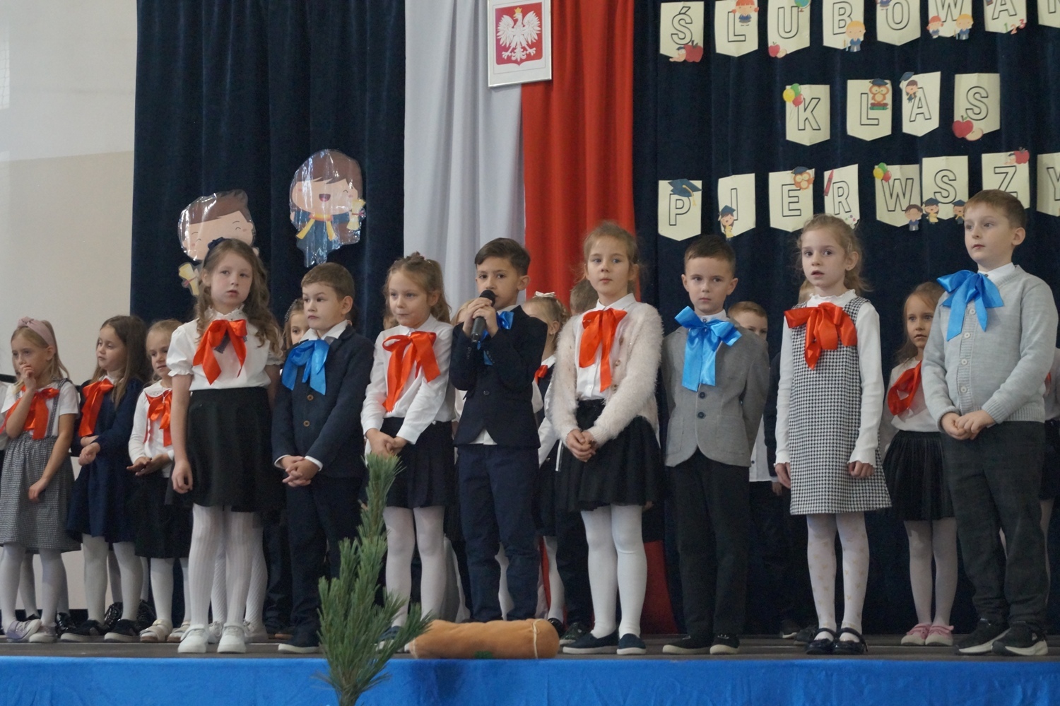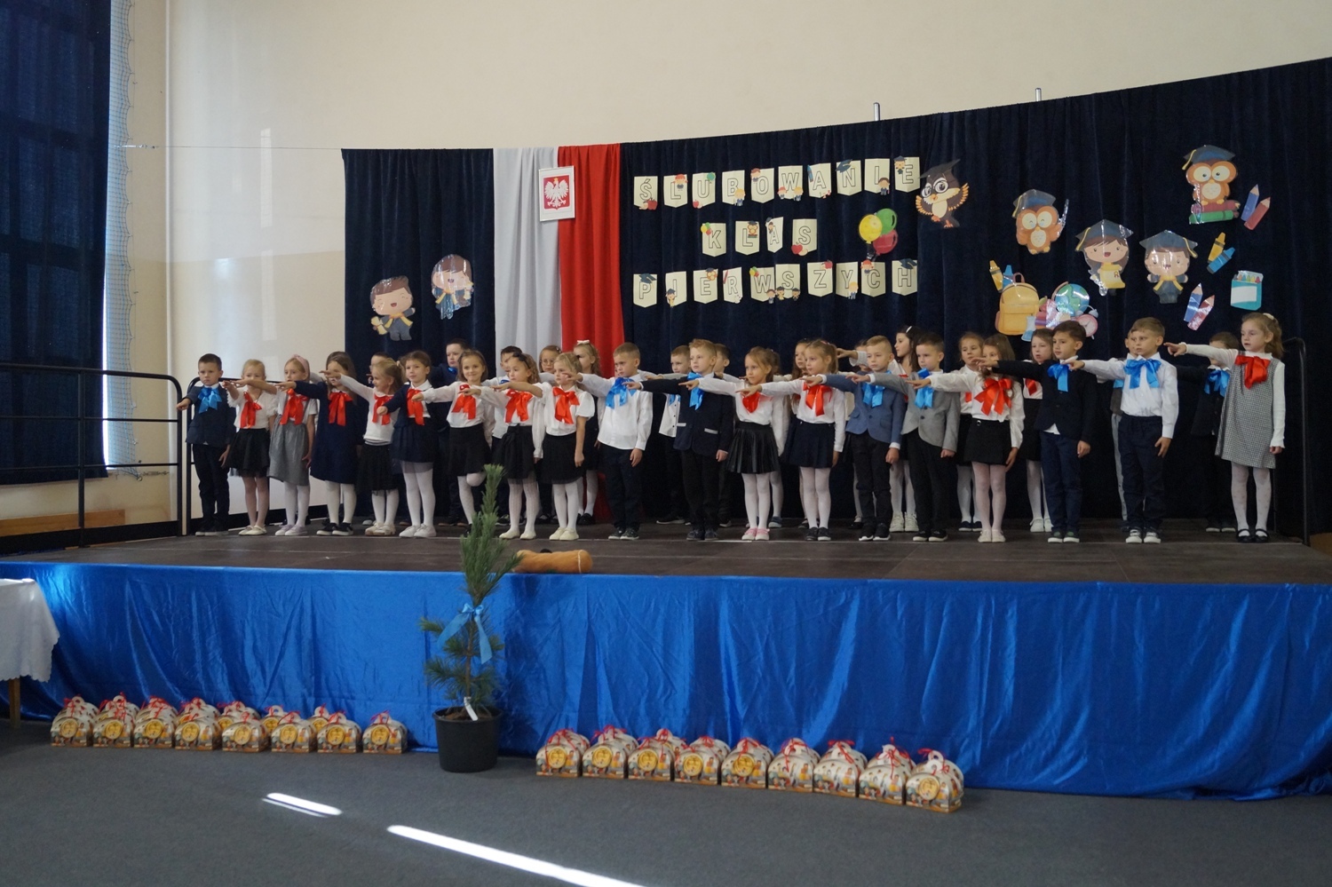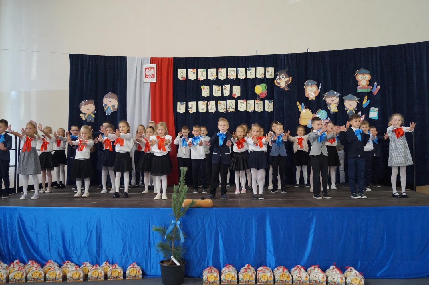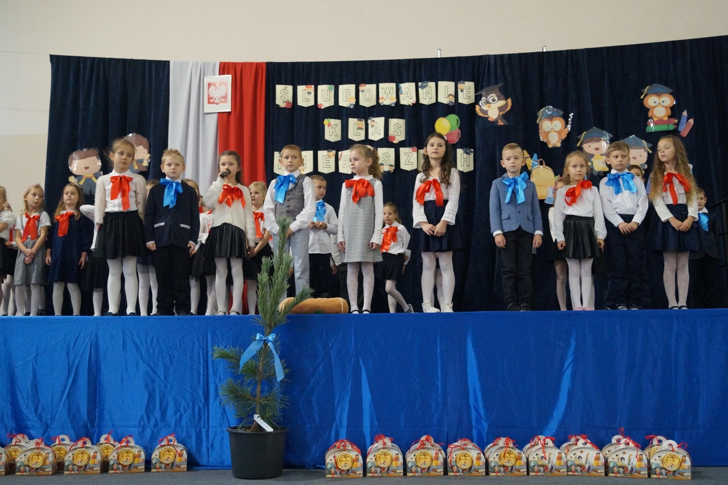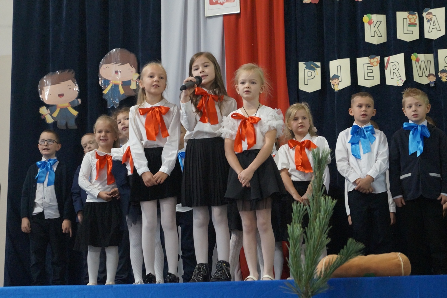 To wielkie wydarzenie rozpoczęła p. Dyrektor Urszula Ząber witając gości: Wójta Gminy Grybów p. Jacka Migacza, Grono Pedagogiczne, rodziców, społeczność szkolną oraz głównych bohaterów - Pierwszoklasistów. Obie klasy zaprezentowały swoje talenty recytatorskie, umiejętności wokalne i na sam koniec nie zabrakło żywiołowego tańca. Po tak obszernym i wymagającym zaprezentowaniu się z wielką radością dzieci zostały przyjęte do grona Uczniów Naszej Szkoły. Po uroczystym Ślubowaniu i Pasowaniu zaproszeni goście, rodzice i dzieci dokonali wspólnego sadzenia drzewa - symbolizującego Ich pobyt w szkole. Następnie udali się do sal i zasiedli z rodzicami do słodkiego poczęstunku.