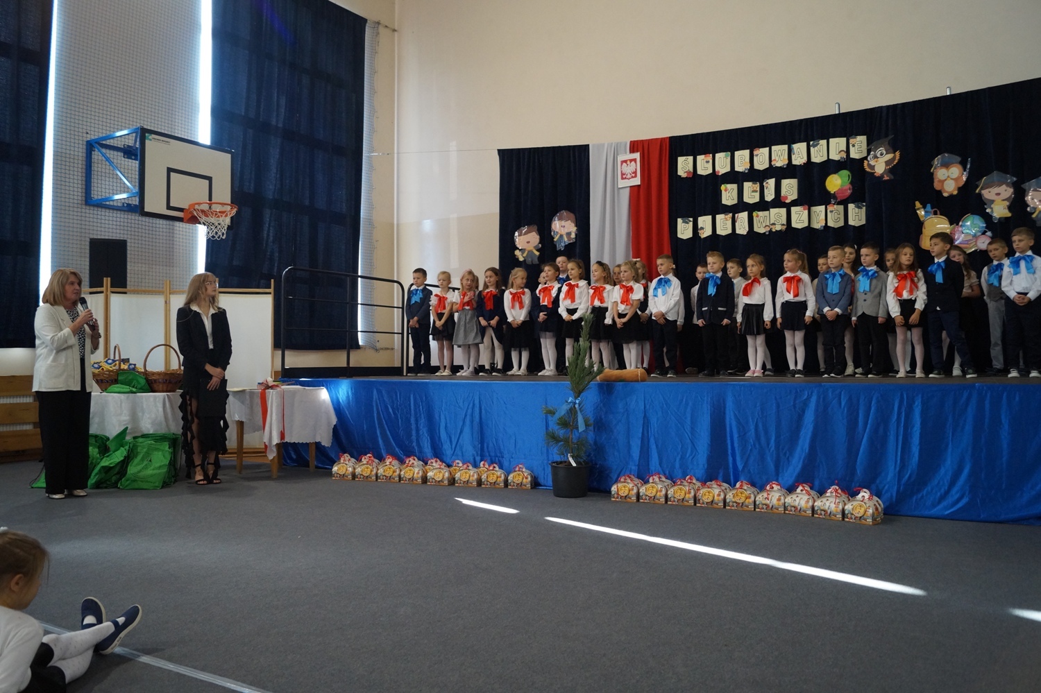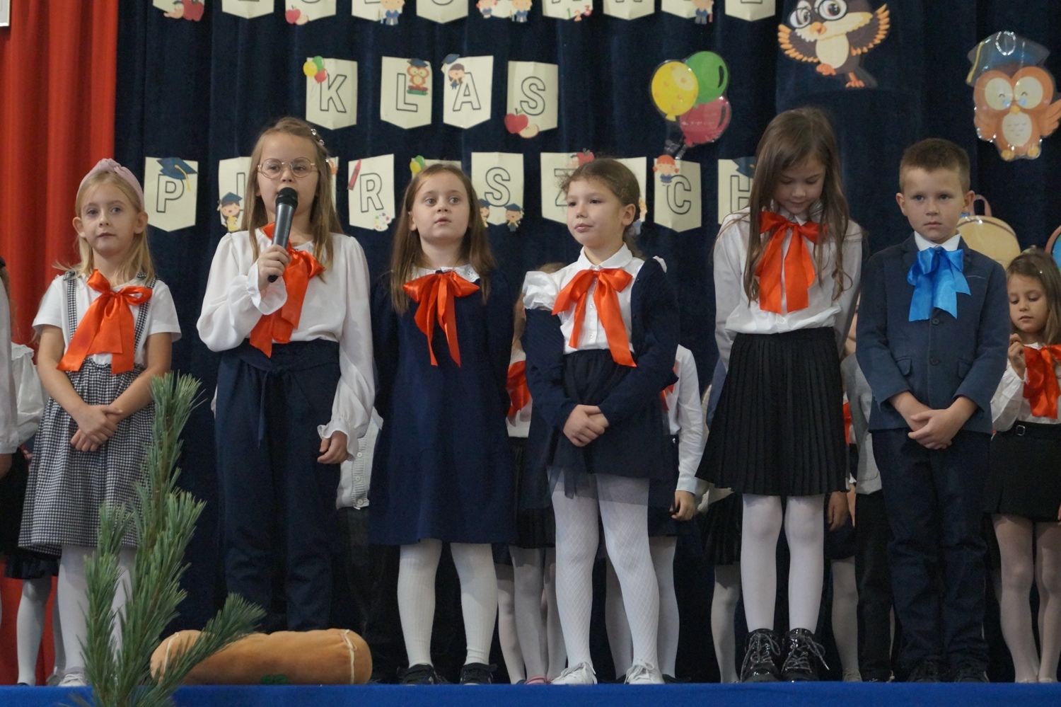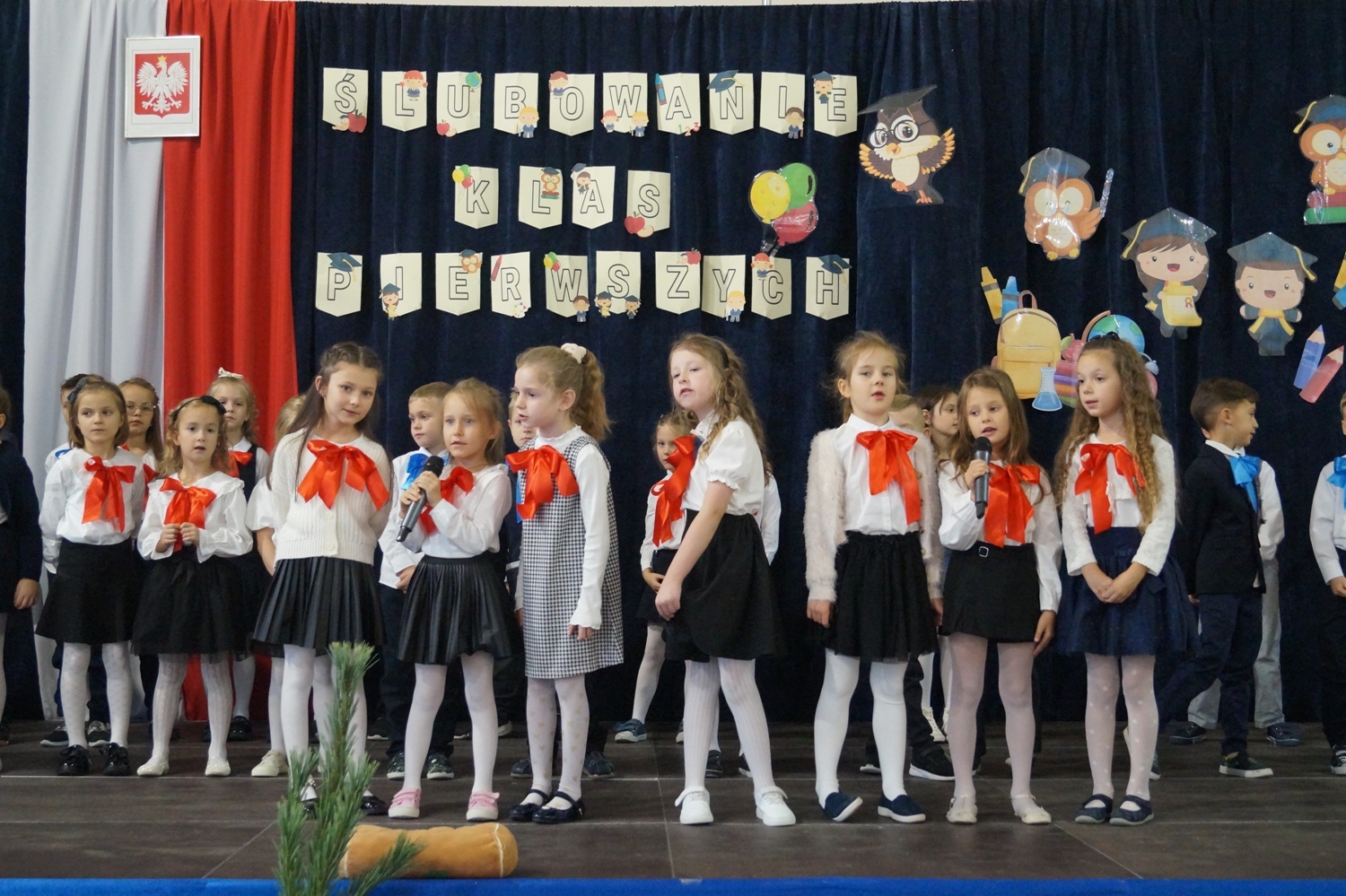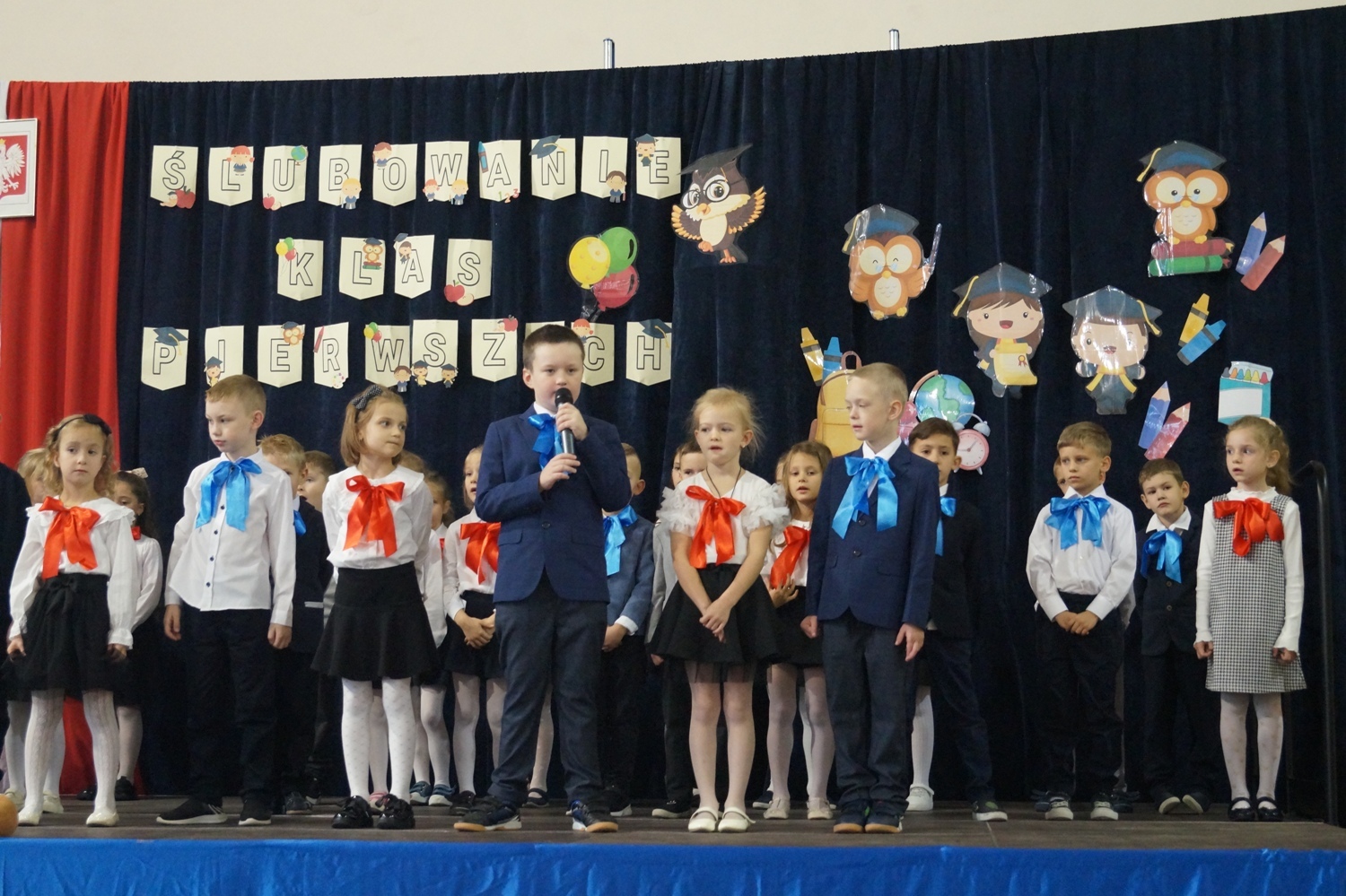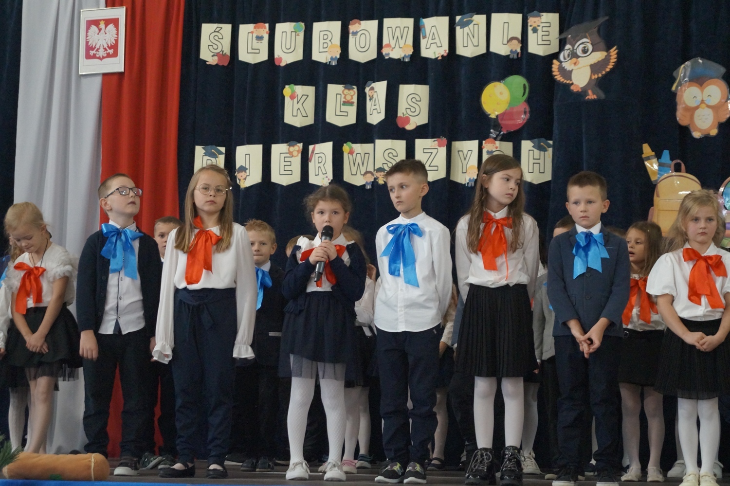 To wielkie wydarzenie rozpoczęła p. Dyrektor Urszula Ząber witając gości: Wójta Gminy Grybów p. Jacka Migacza, Grono Pedagogiczne, rodziców, społeczność szkolną oraz głównych bohaterów - Pierwszoklasistów. Obie klasy zaprezentowały swoje talenty recytatorskie, umiejętności wokalne i na sam koniec nie zabrakło żywiołowego tańca. Po tak obszernym i wymagającym zaprezentowaniu się z wielką radością dzieci zostały przyjęte do grona Uczniów Naszej Szkoły. Po uroczystym Ślubowaniu i Pasowaniu zaproszeni goście, rodzice i dzieci dokonali wspólnego sadzenia drzewa - symbolizującego Ich pobyt w szkole. Następnie udali się do sal i zasiedli z rodzicami do słodkiego poczęstunku.