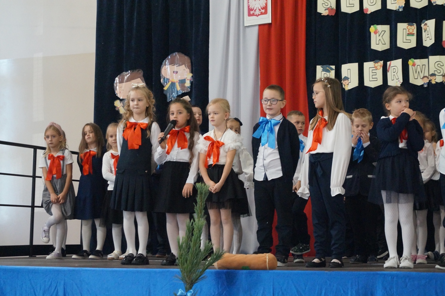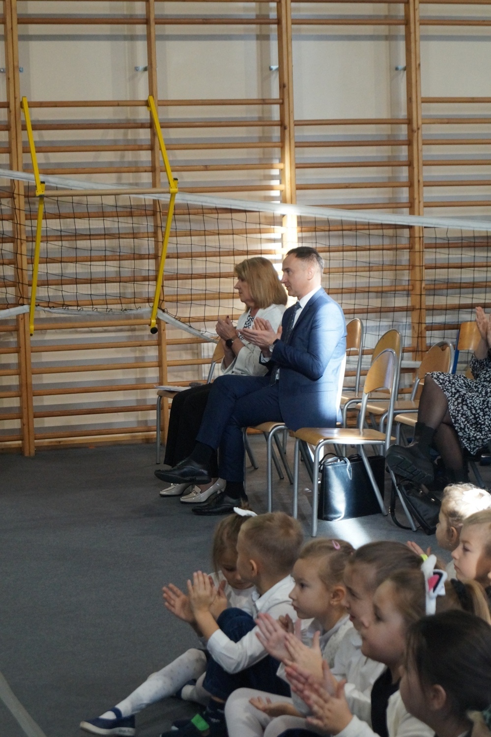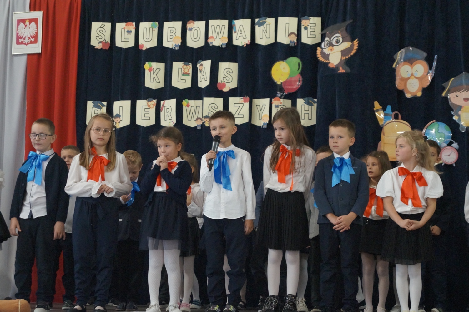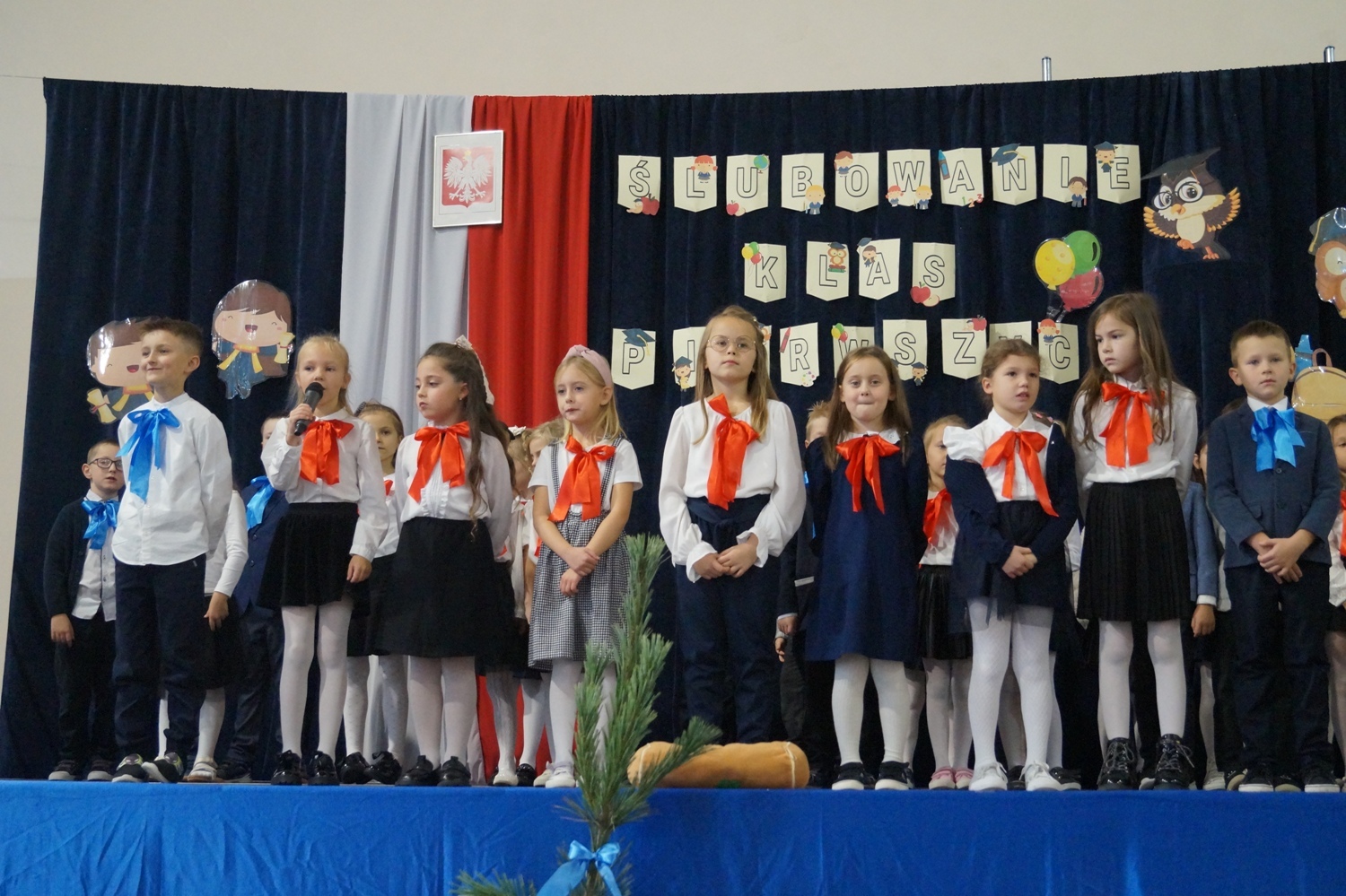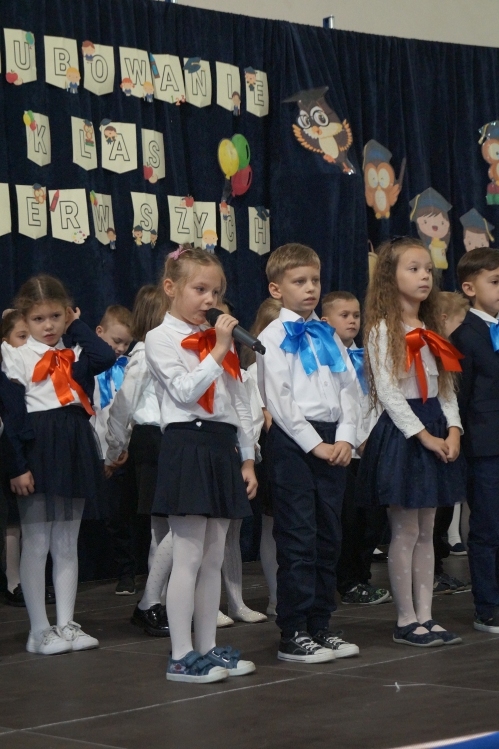 To wielkie wydarzenie rozpoczęła p. Dyrektor Urszula Ząber witając gości: Wójta Gminy Grybów p. Jacka Migacza, Grono Pedagogiczne, rodziców, społeczność szkolną oraz głównych bohaterów - Pierwszoklasistów. Obie klasy zaprezentowały swoje talenty recytatorskie, umiejętności wokalne i na sam koniec nie zabrakło żywiołowego tańca. Po tak obszernym i wymagającym zaprezentowaniu się z wielką radością dzieci zostały przyjęte do grona Uczniów Naszej Szkoły. Po uroczystym Ślubowaniu i Pasowaniu zaproszeni goście, rodzice i dzieci dokonali wspólnego sadzenia drzewa - symbolizującego Ich pobyt w szkole. Następnie udali się do sal i zasiedli z rodzicami do słodkiego poczęstunku.