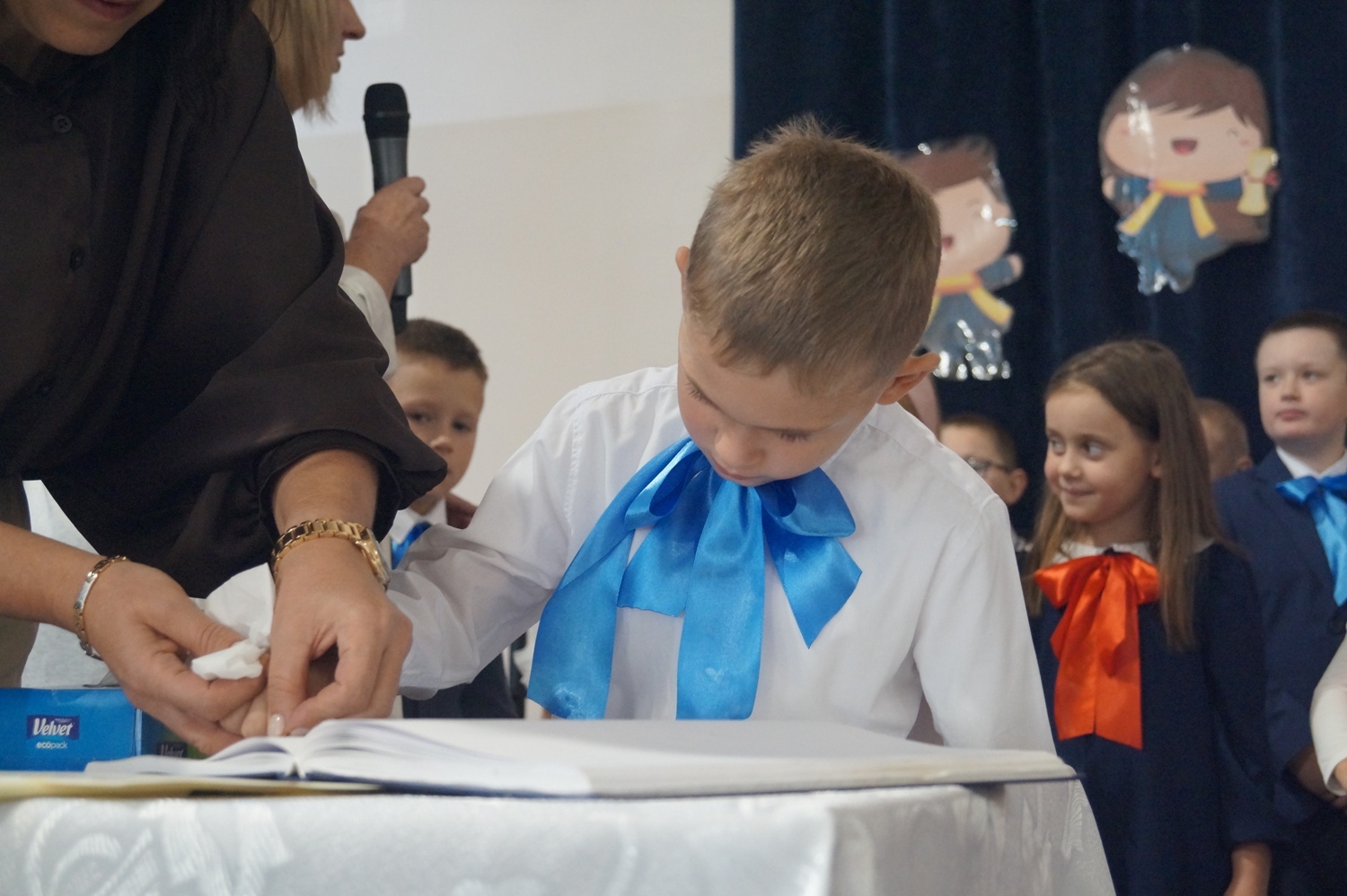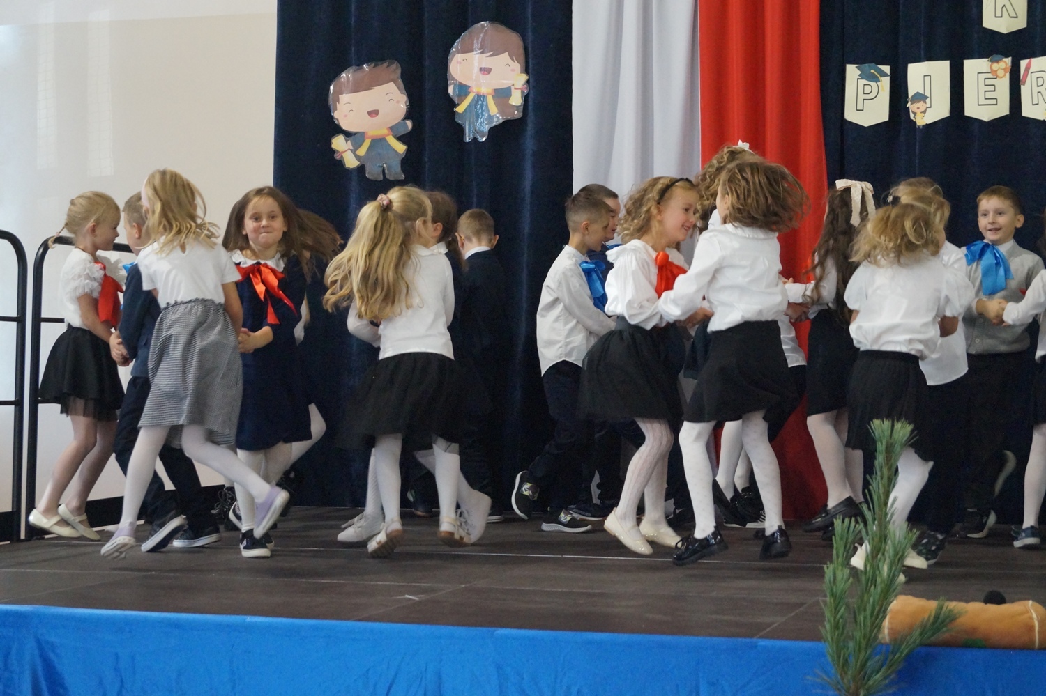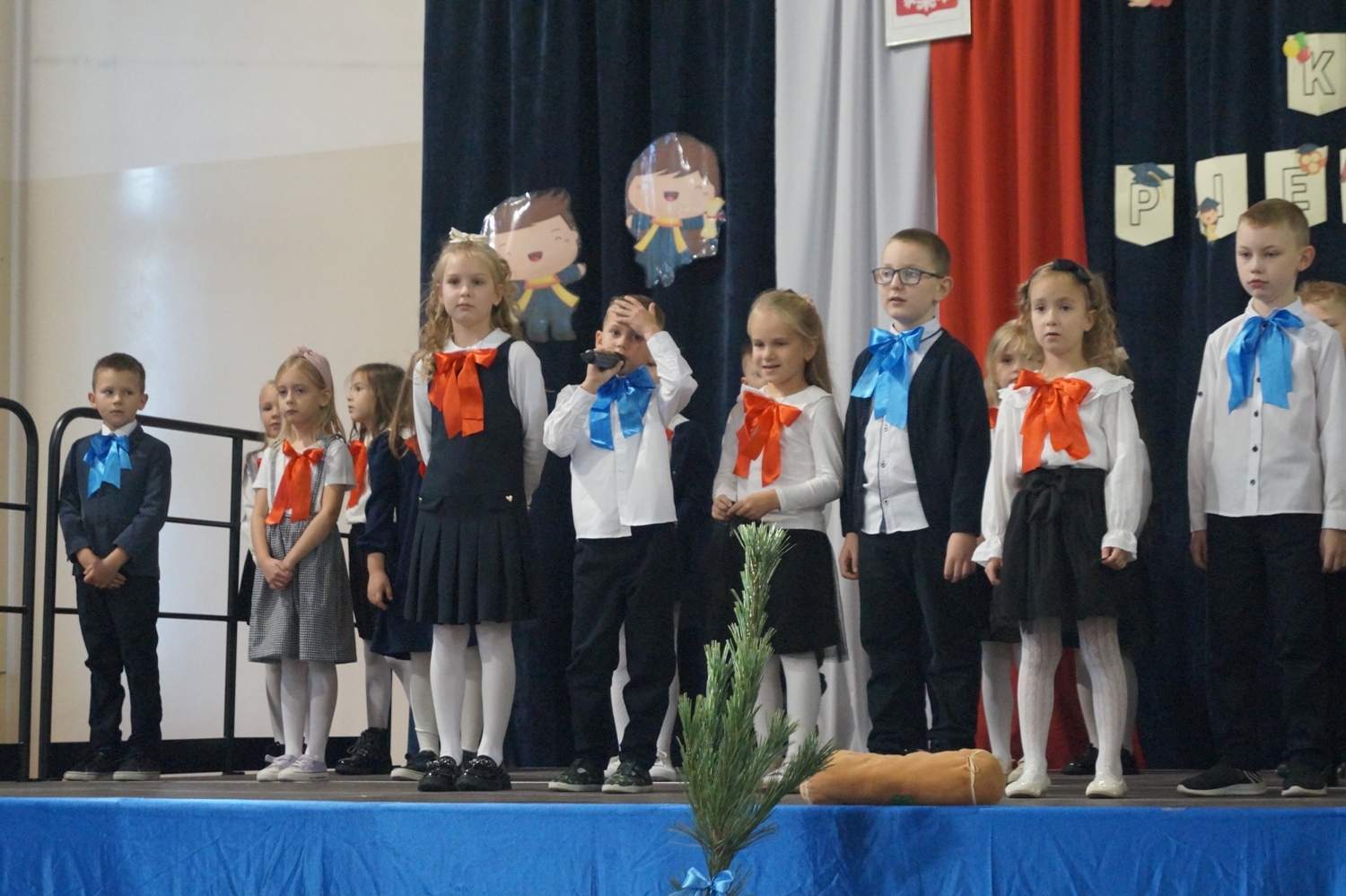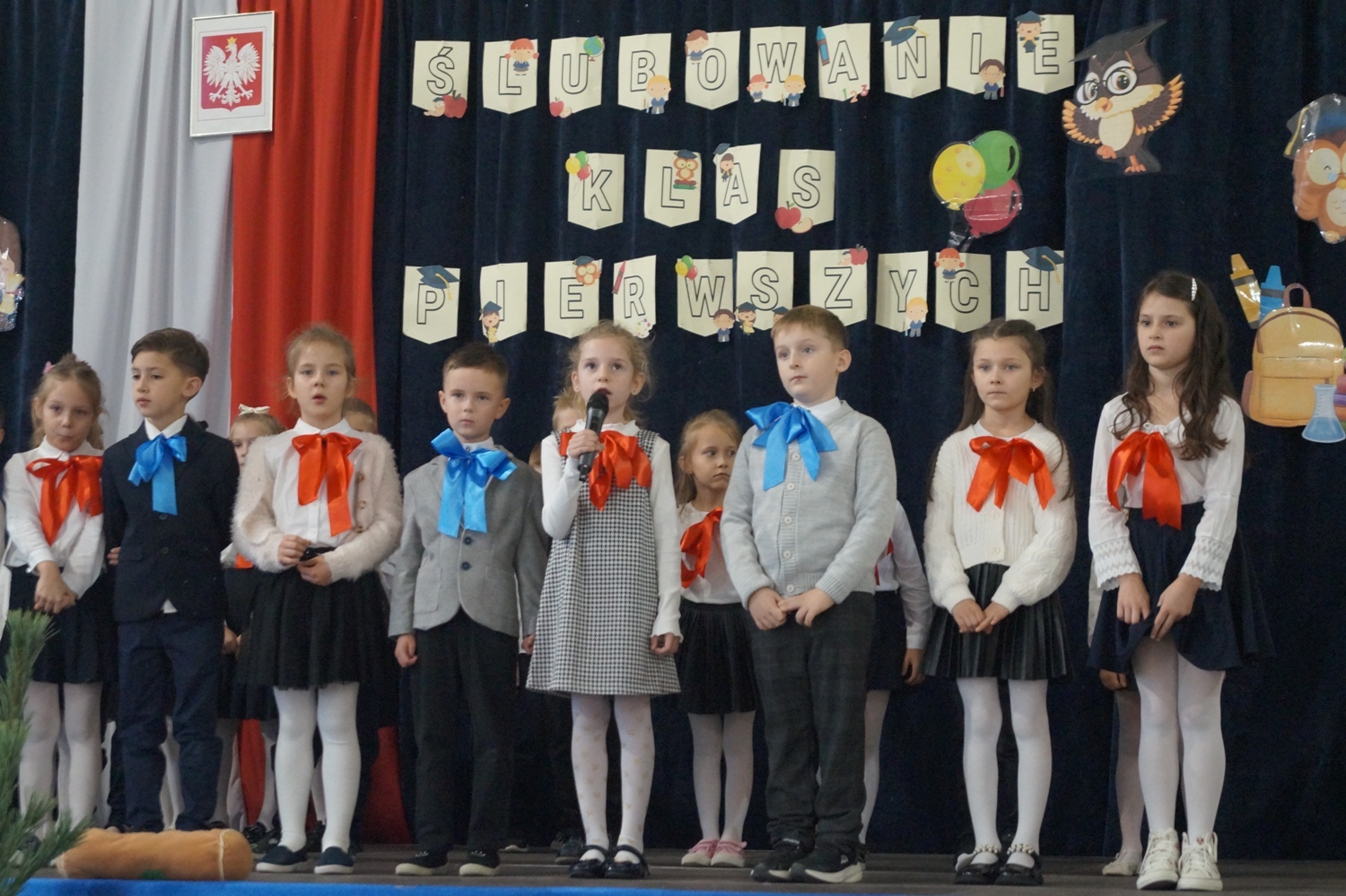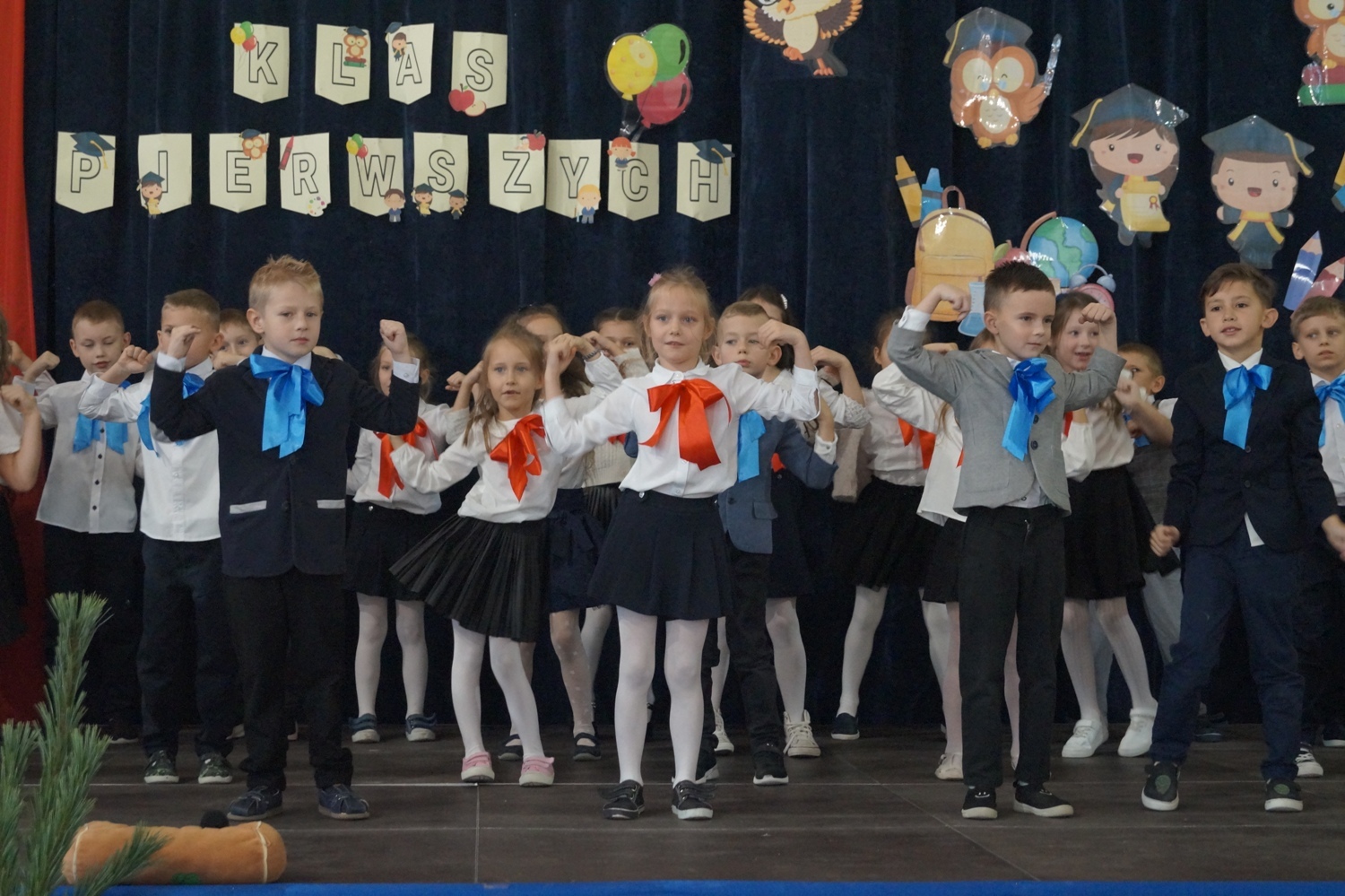 To wielkie wydarzenie rozpoczęła p. Dyrektor Urszula Ząber witając gości: Wójta Gminy Grybów p. Jacka Migacza, Grono Pedagogiczne, rodziców, społeczność szkolną oraz głównych bohaterów - Pierwszoklasistów. Obie klasy zaprezentowały swoje talenty recytatorskie, umiejętności wokalne i na sam koniec nie zabrakło żywiołowego tańca. Po tak obszernym i wymagającym zaprezentowaniu się z wielką radością dzieci zostały przyjęte do grona Uczniów Naszej Szkoły. Po uroczystym Ślubowaniu i Pasowaniu zaproszeni goście, rodzice i dzieci dokonali wspólnego sadzenia drzewa - symbolizującego Ich pobyt w szkole. Następnie udali się do sal i zasiedli z rodzicami do słodkiego poczęstunku.