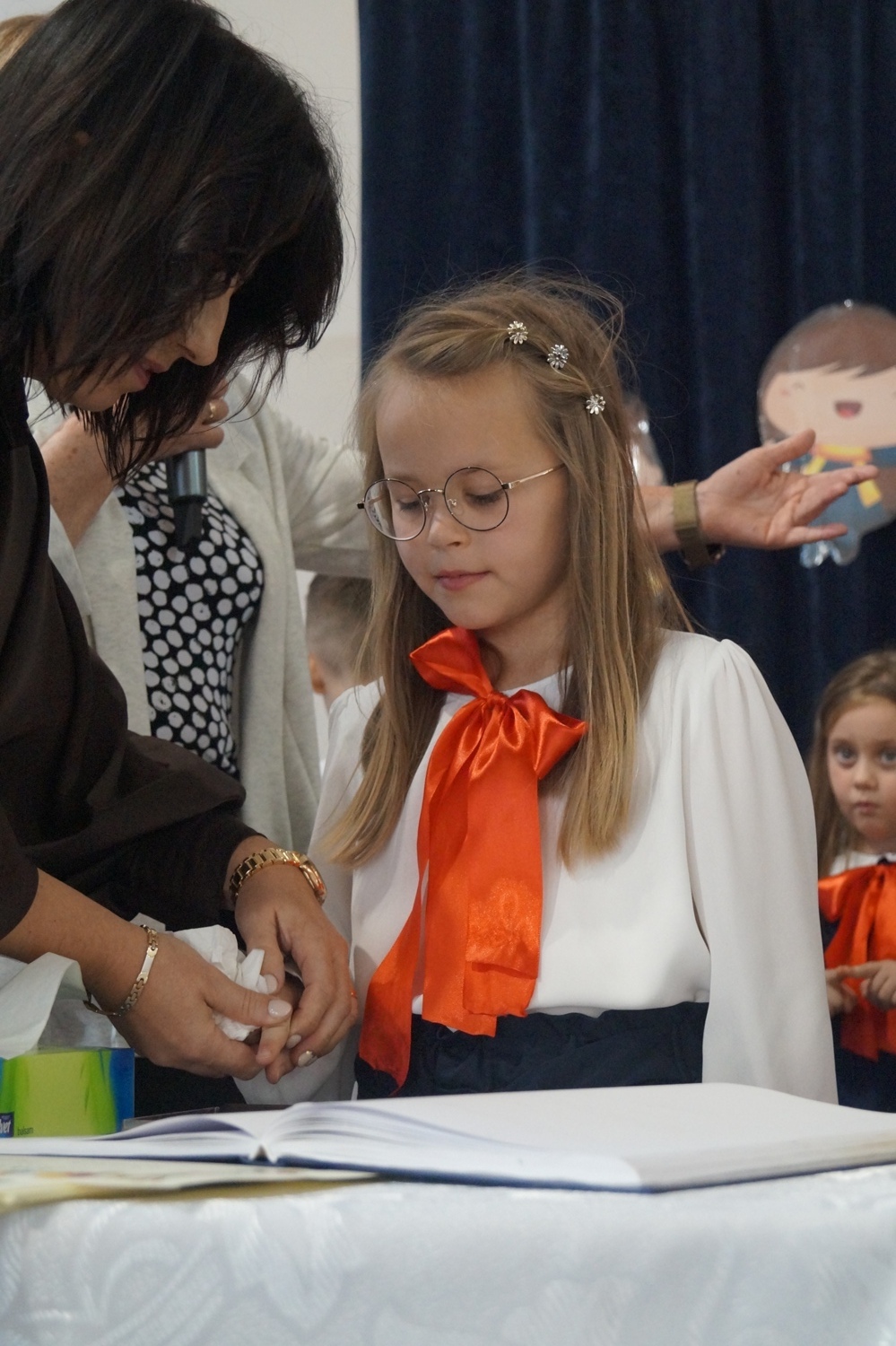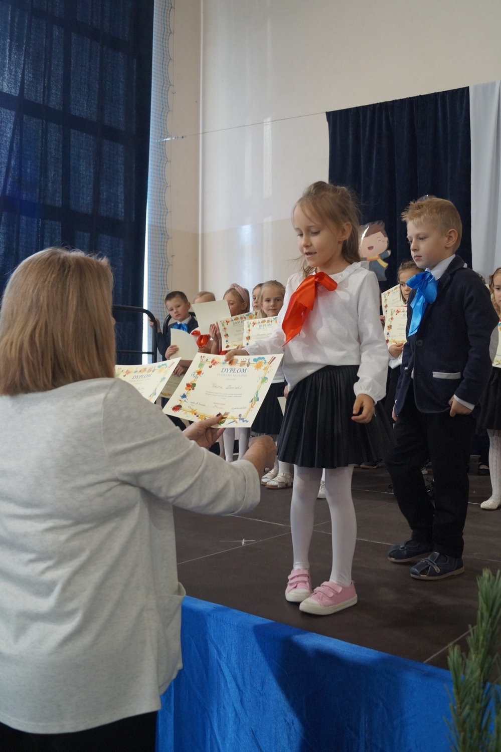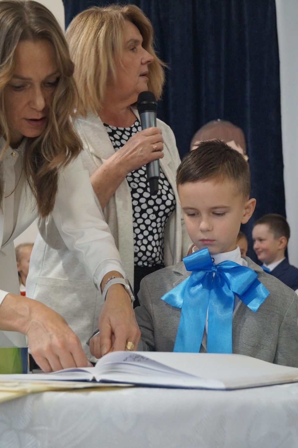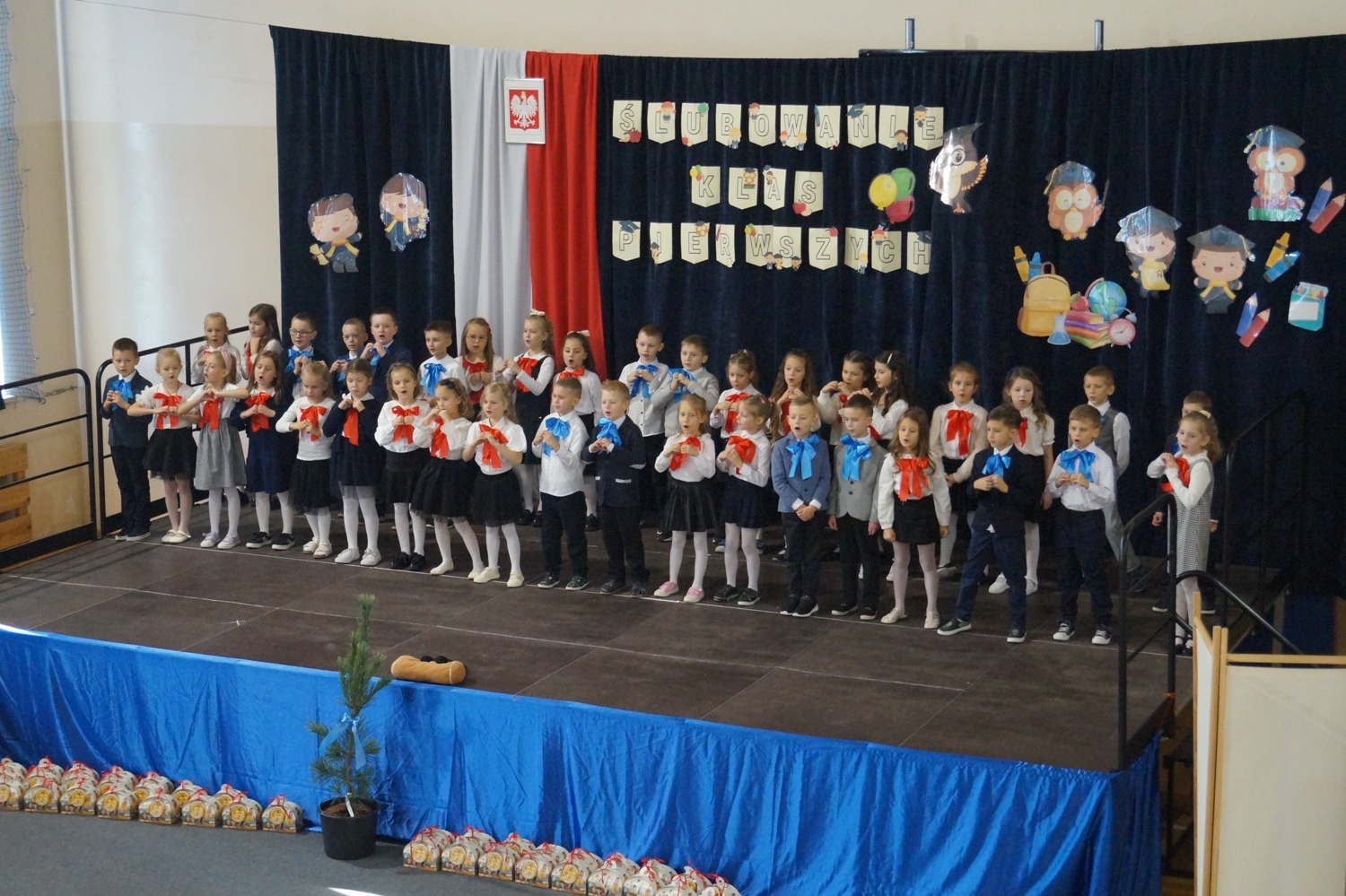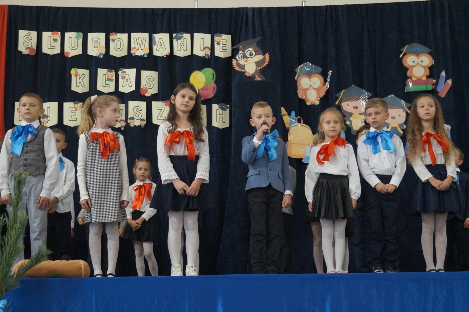 To wielkie wydarzenie rozpoczęła p. Dyrektor Urszula Ząber witając gości: Wójta Gminy Grybów p. Jacka Migacza, Grono Pedagogiczne, rodziców, społeczność szkolną oraz głównych bohaterów - Pierwszoklasistów. Obie klasy zaprezentowały swoje talenty recytatorskie, umiejętności wokalne i na sam koniec nie zabrakło żywiołowego tańca. Po tak obszernym i wymagającym zaprezentowaniu się z wielką radością dzieci zostały przyjęte do grona Uczniów Naszej Szkoły. Po uroczystym Ślubowaniu i Pasowaniu zaproszeni goście, rodzice i dzieci dokonali wspólnego sadzenia drzewa - symbolizującego Ich pobyt w szkole. Następnie udali się do sal i zasiedli z rodzicami do słodkiego poczęstunku.