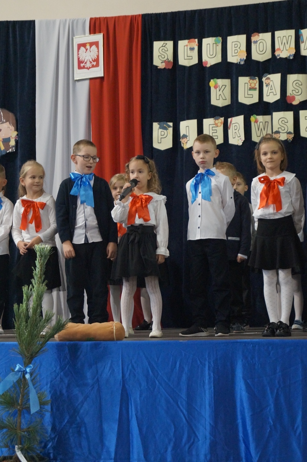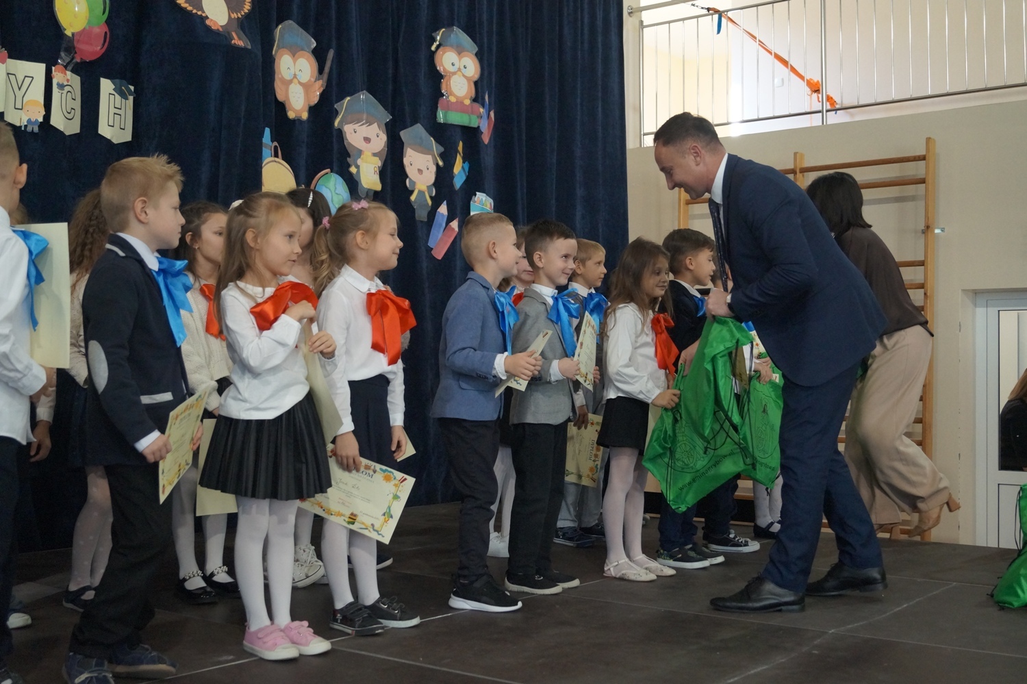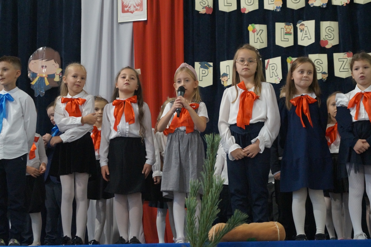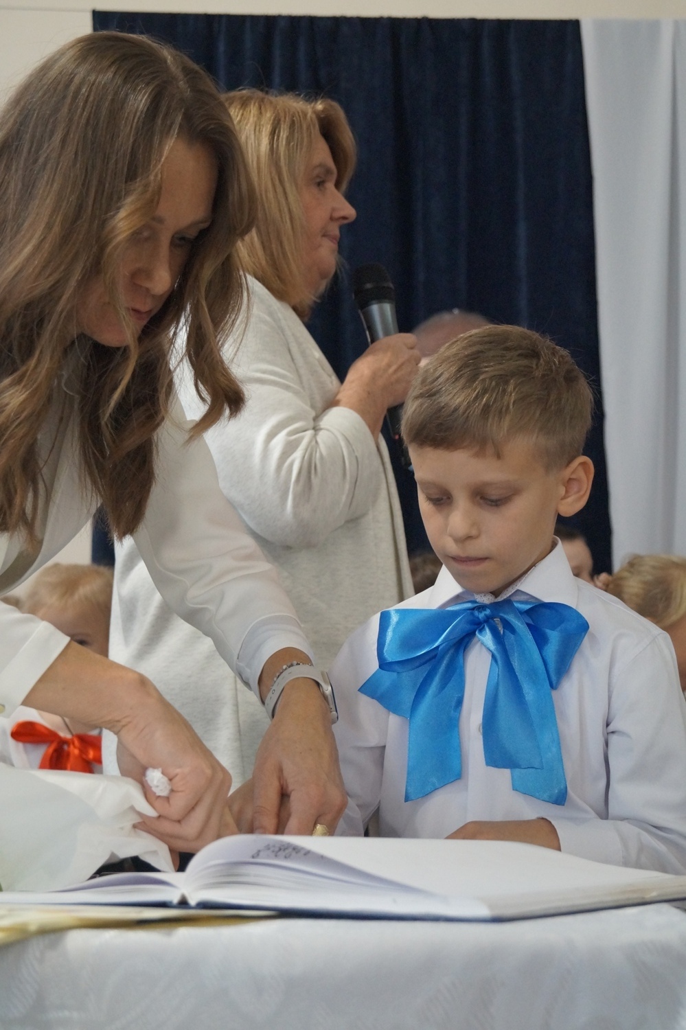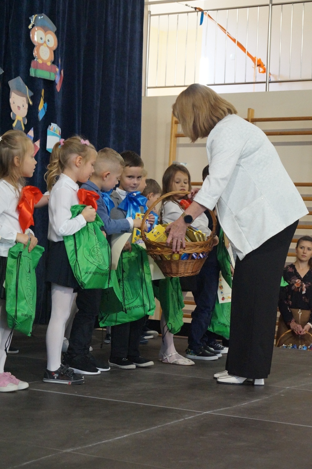To wielkie wydarzenie rozpoczęła p. Dyrektor Urszula Ząber witając gości: Wójta Gminy Grybów p. Jacka Migacza, Grono Pedagogiczne, rodziców, społeczność szkolną oraz głównych bohaterów - Pierwszoklasistów. Obie klasy zaprezentowały swoje talenty recytatorskie, umiejętności wokalne i na sam koniec nie zabrakło żywiołowego tańca. Po tak obszernym i wymagającym zaprezentowaniu się z wielką radością dzieci zostały przyjęte do grona Uczniów Naszej Szkoły. Po uroczystym Ślubowaniu i Pasowaniu zaproszeni goście, rodzice i dzieci dokonali wspólnego sadzenia drzewa - symbolizującego Ich pobyt w szkole. Następnie udali się do sal i zasiedli z rodzicami do słodkiego poczęstunku.