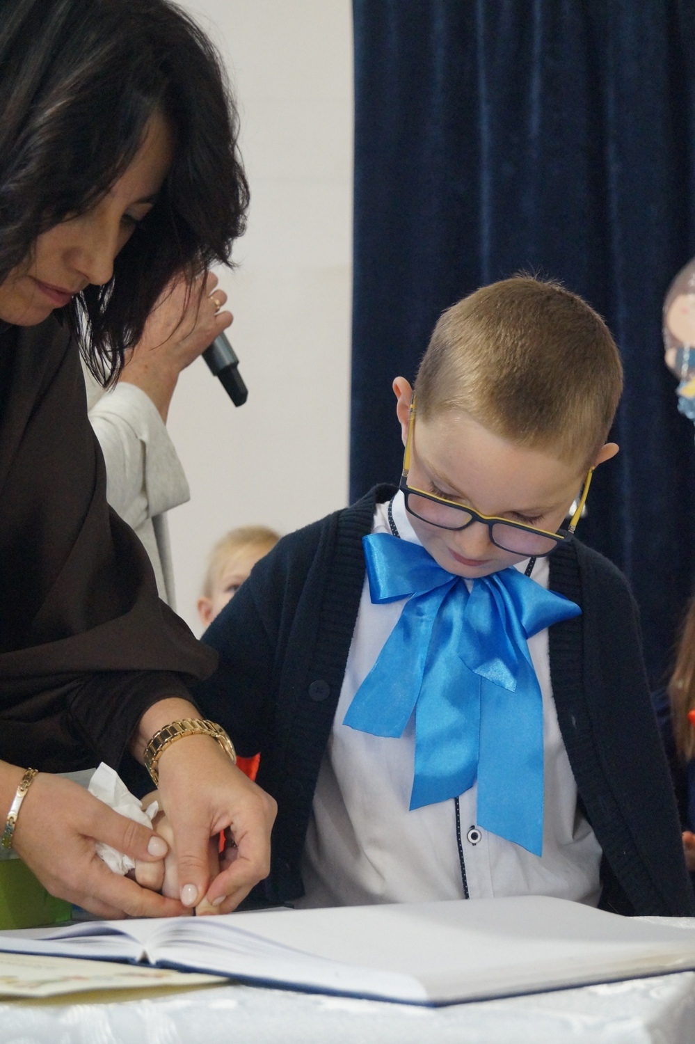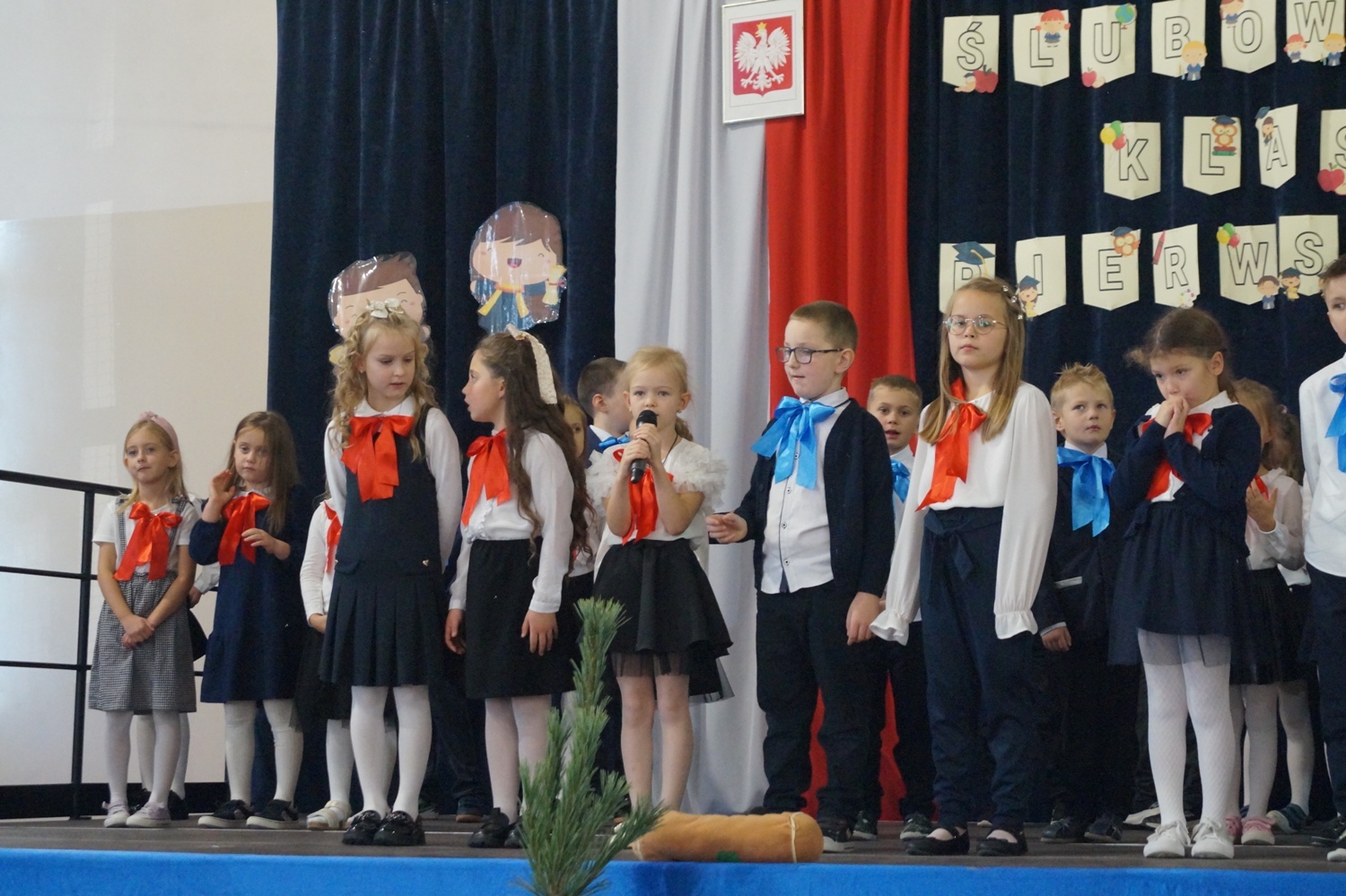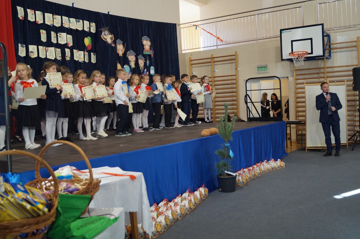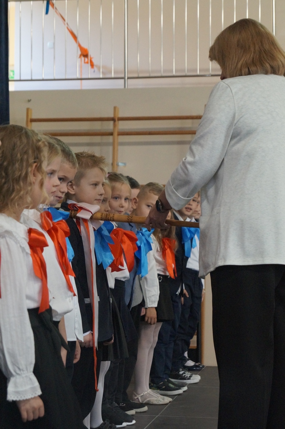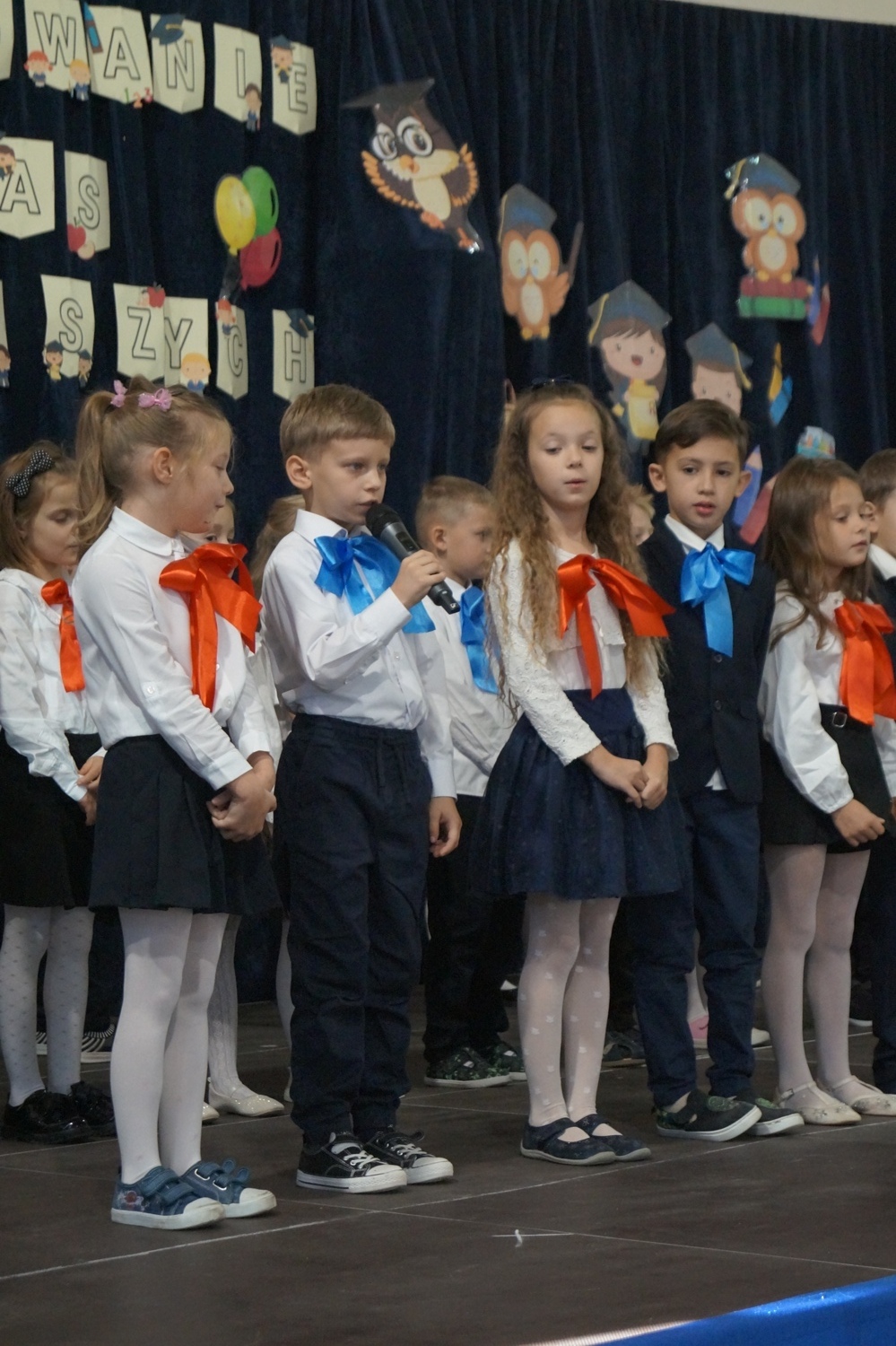 To wielkie wydarzenie rozpoczęła p. Dyrektor Urszula Ząber witając gości: Wójta Gminy Grybów p. Jacka Migacza, Grono Pedagogiczne, rodziców, społeczność szkolną oraz głównych bohaterów - Pierwszoklasistów. Obie klasy zaprezentowały swoje talenty recytatorskie, umiejętności wokalne i na sam koniec nie zabrakło żywiołowego tańca. Po tak obszernym i wymagającym zaprezentowaniu się z wielką radością dzieci zostały przyjęte do grona Uczniów Naszej Szkoły. Po uroczystym Ślubowaniu i Pasowaniu zaproszeni goście, rodzice i dzieci dokonali wspólnego sadzenia drzewa - symbolizującego Ich pobyt w szkole. Następnie udali się do sal i zasiedli z rodzicami do słodkiego poczęstunku.