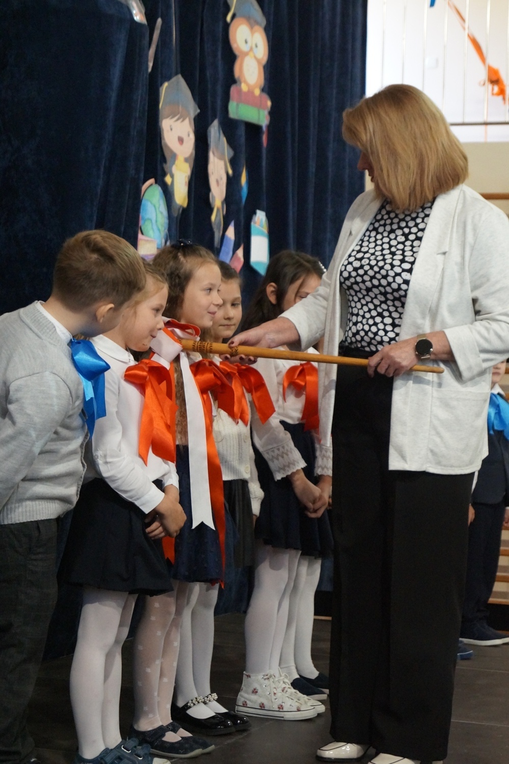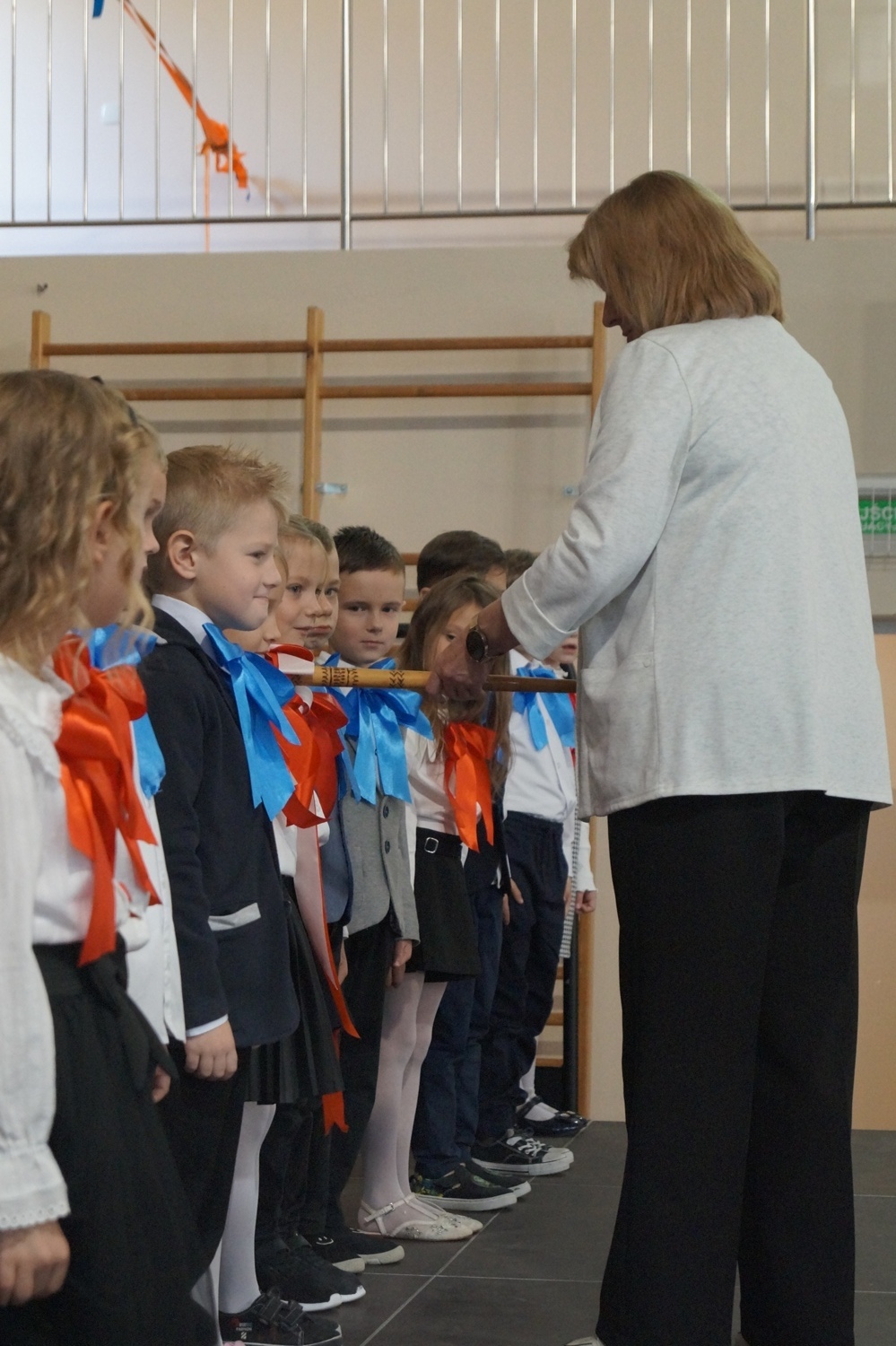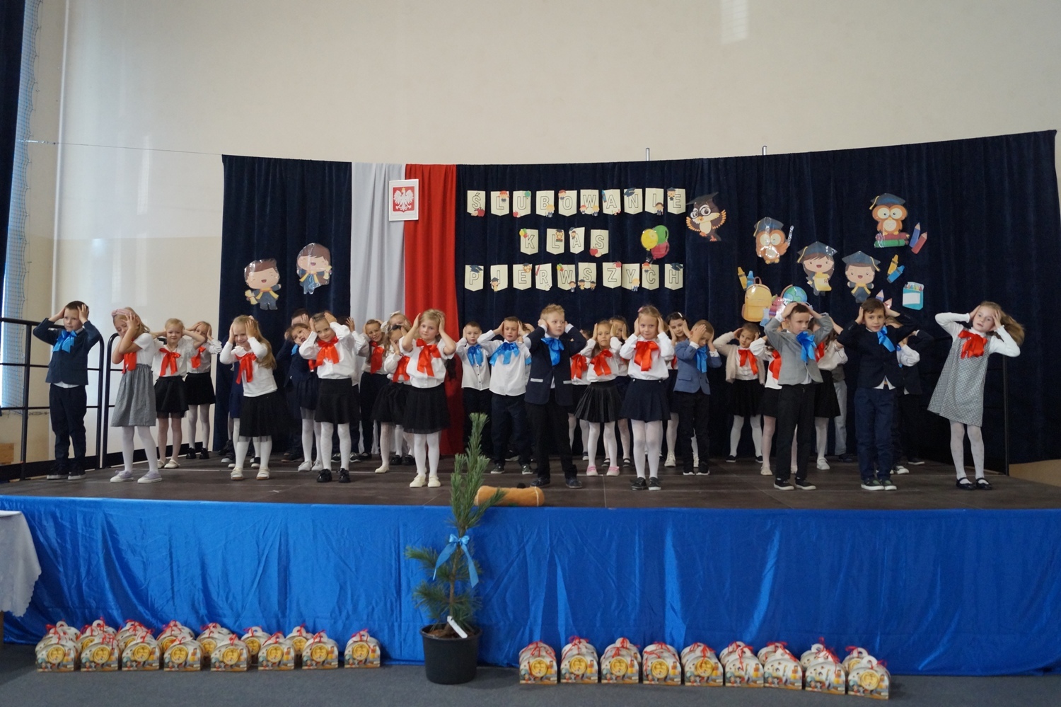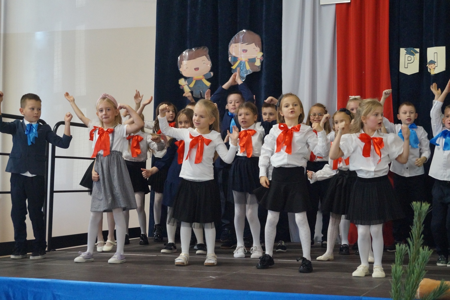 To wielkie wydarzenie rozpoczęła p. Dyrektor Urszula Ząber witając gości: Wójta Gminy Grybów p. Jacka Migacza, Grono Pedagogiczne, rodziców, społeczność szkolną oraz głównych bohaterów - Pierwszoklasistów. Obie klasy zaprezentowały swoje talenty recytatorskie, umiejętności wokalne i na sam koniec nie zabrakło żywiołowego tańca. Po tak obszernym i wymagającym zaprezentowaniu się z wielką radością dzieci zostały przyjęte do grona Uczniów Naszej Szkoły. Po uroczystym Ślubowaniu i Pasowaniu zaproszeni goście, rodzice i dzieci dokonali wspólnego sadzenia drzewa - symbolizującego Ich pobyt w szkole. Następnie udali się do sal i zasiedli z rodzicami do słodkiego poczęstunku.