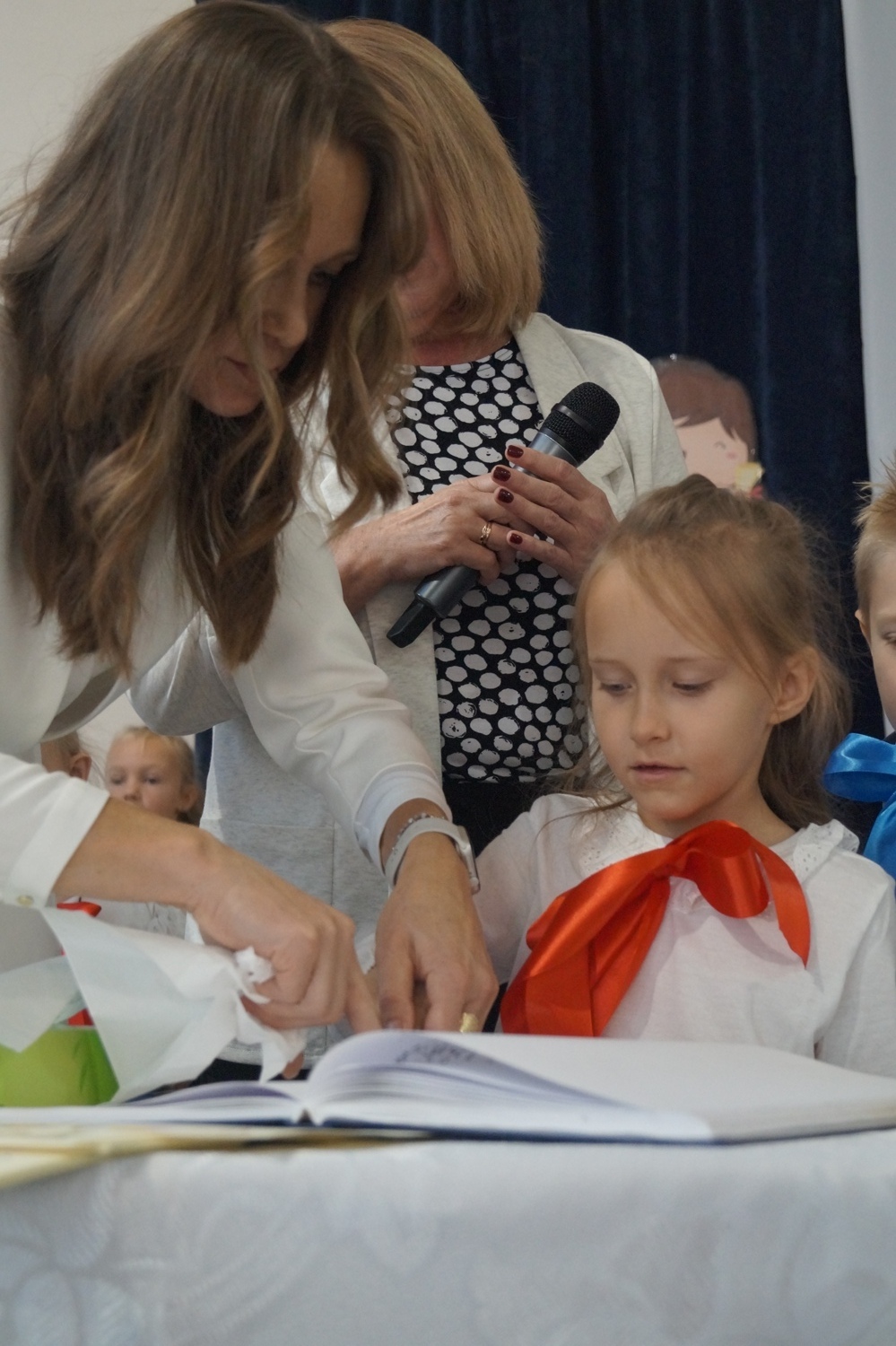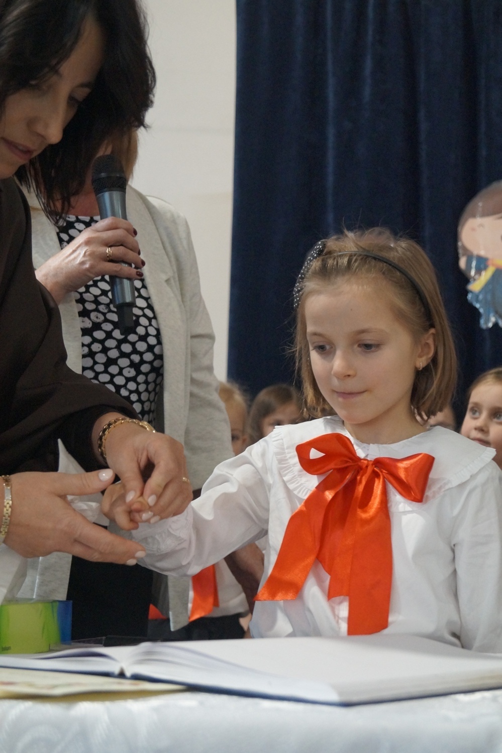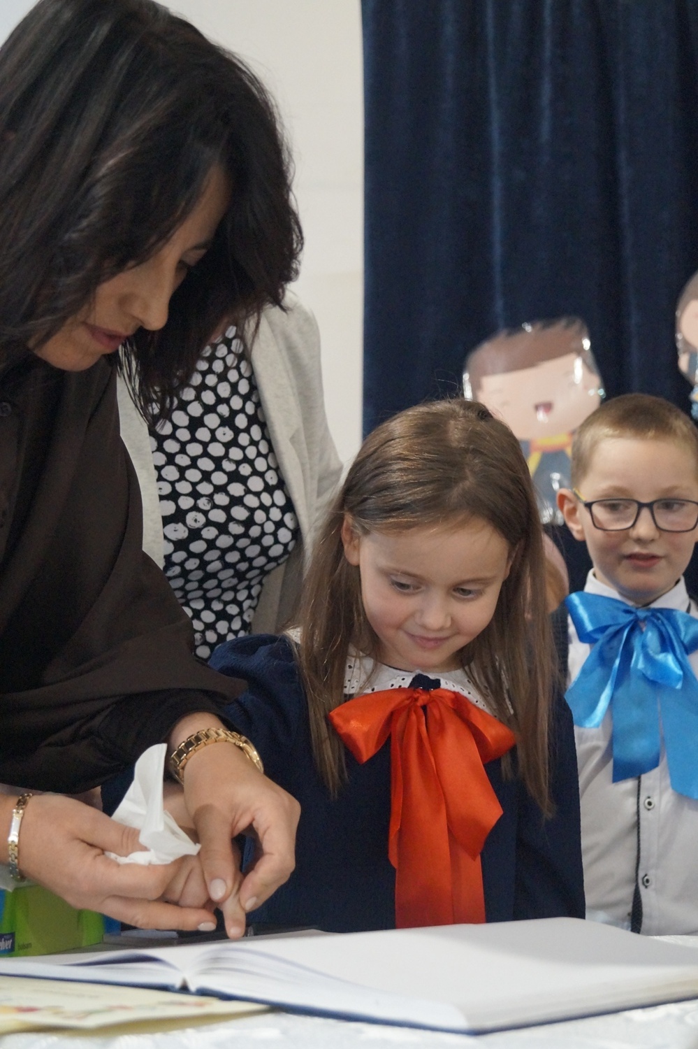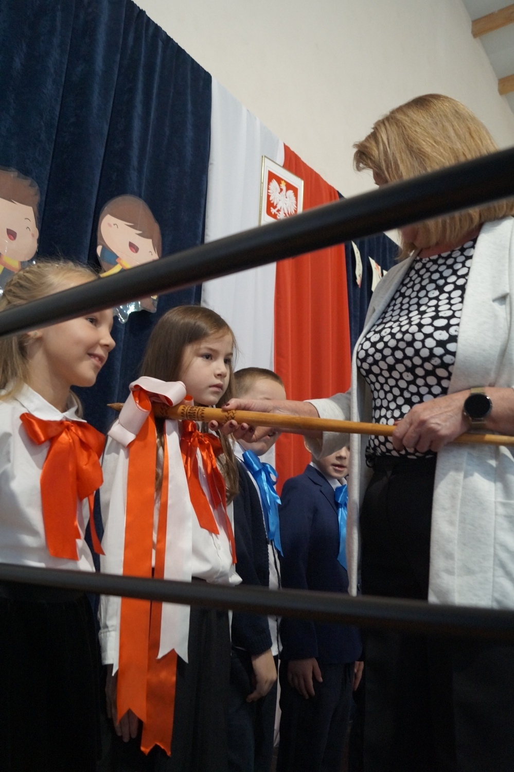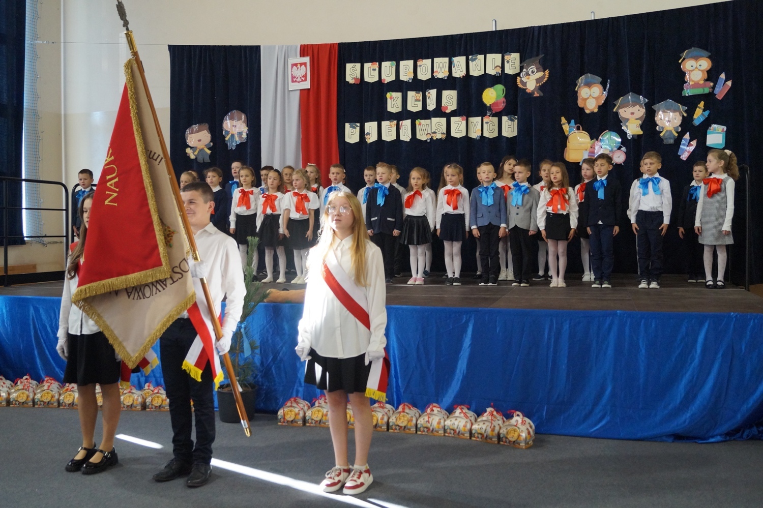 To wielkie wydarzenie rozpoczęła p. Dyrektor Urszula Ząber witając gości: Wójta Gminy Grybów p. Jacka Migacza, Grono Pedagogiczne, rodziców, społeczność szkolną oraz głównych bohaterów - Pierwszoklasistów. Obie klasy zaprezentowały swoje talenty recytatorskie, umiejętności wokalne i na sam koniec nie zabrakło żywiołowego tańca. Po tak obszernym i wymagającym zaprezentowaniu się z wielką radością dzieci zostały przyjęte do grona Uczniów Naszej Szkoły. Po uroczystym Ślubowaniu i Pasowaniu zaproszeni goście, rodzice i dzieci dokonali wspólnego sadzenia drzewa - symbolizującego Ich pobyt w szkole. Następnie udali się do sal i zasiedli z rodzicami do słodkiego poczęstunku.