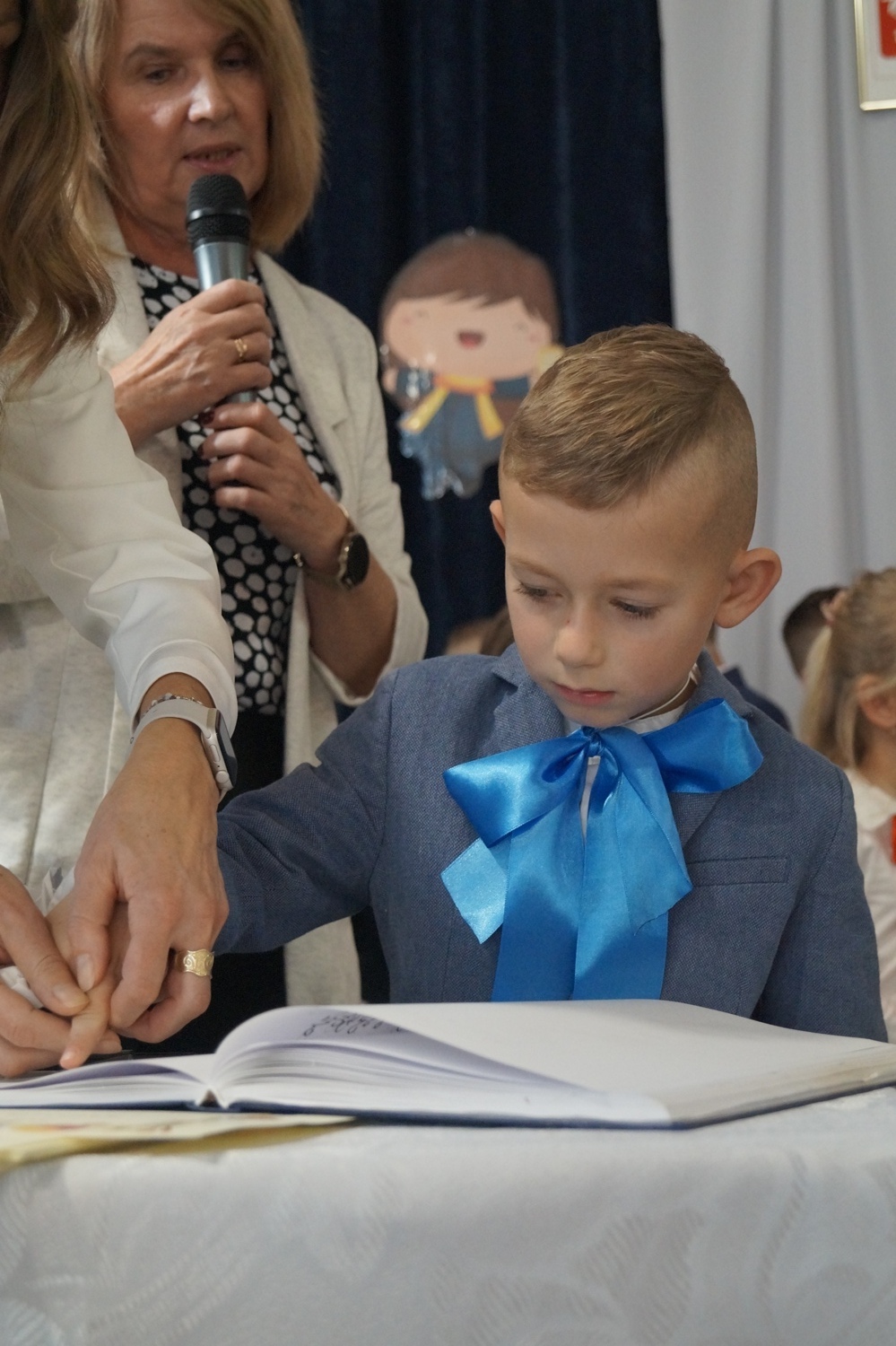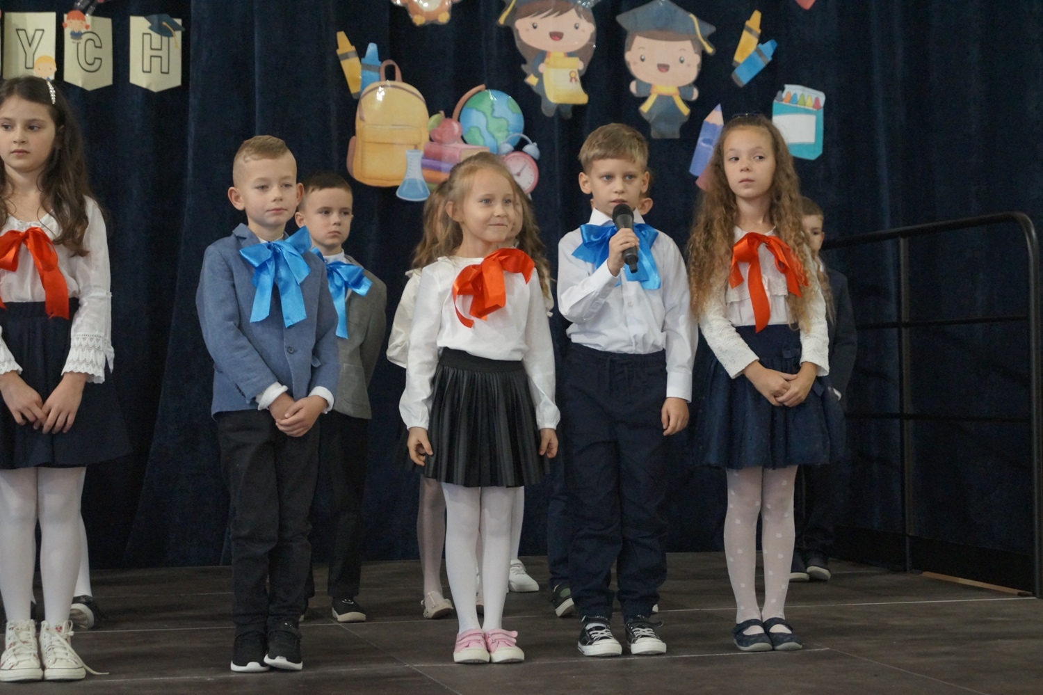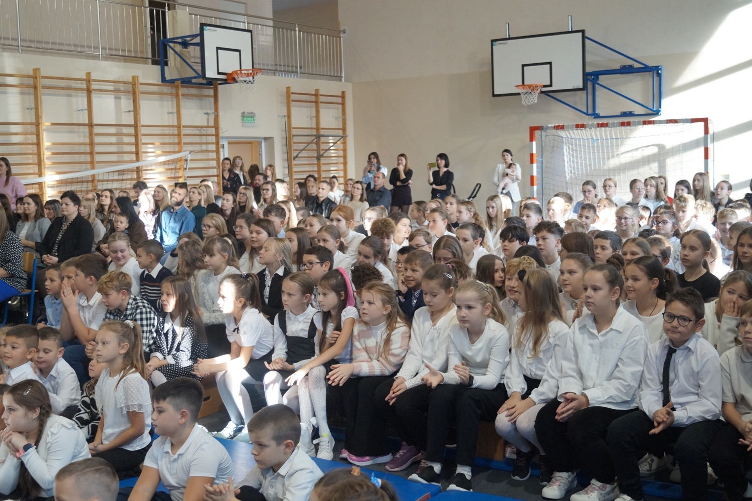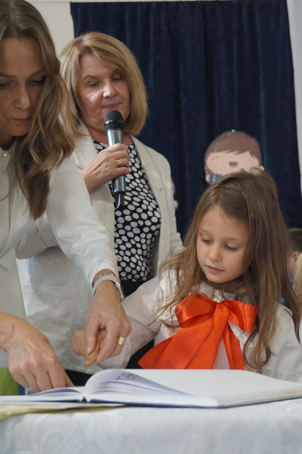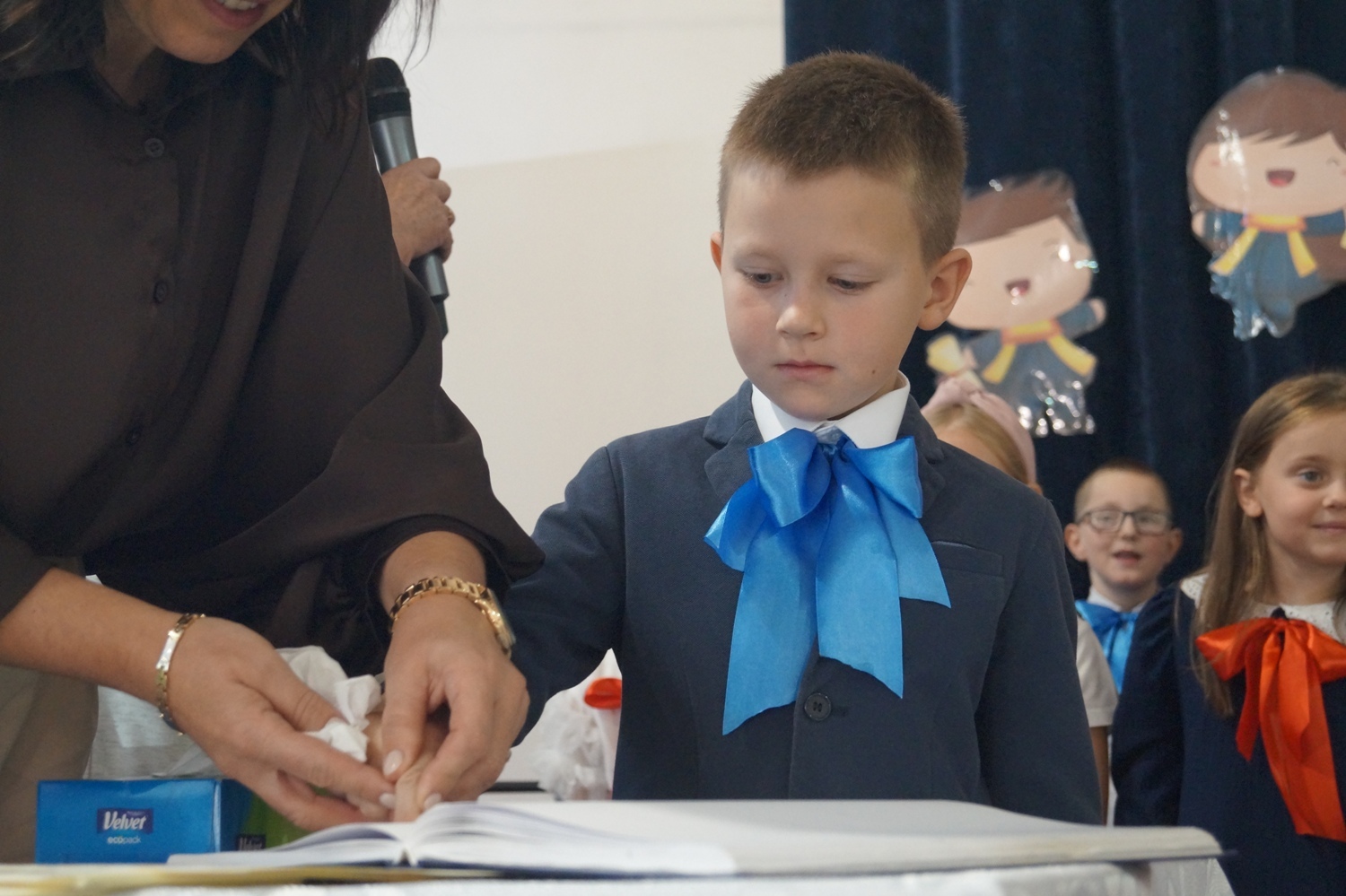 To wielkie wydarzenie rozpoczęła p. Dyrektor Urszula Ząber witając gości: Wójta Gminy Grybów p. Jacka Migacza, Grono Pedagogiczne, rodziców, społeczność szkolną oraz głównych bohaterów - Pierwszoklasistów. Obie klasy zaprezentowały swoje talenty recytatorskie, umiejętności wokalne i na sam koniec nie zabrakło żywiołowego tańca. Po tak obszernym i wymagającym zaprezentowaniu się z wielką radością dzieci zostały przyjęte do grona Uczniów Naszej Szkoły. Po uroczystym Ślubowaniu i Pasowaniu zaproszeni goście, rodzice i dzieci dokonali wspólnego sadzenia drzewa - symbolizującego Ich pobyt w szkole. Następnie udali się do sal i zasiedli z rodzicami do słodkiego poczęstunku.