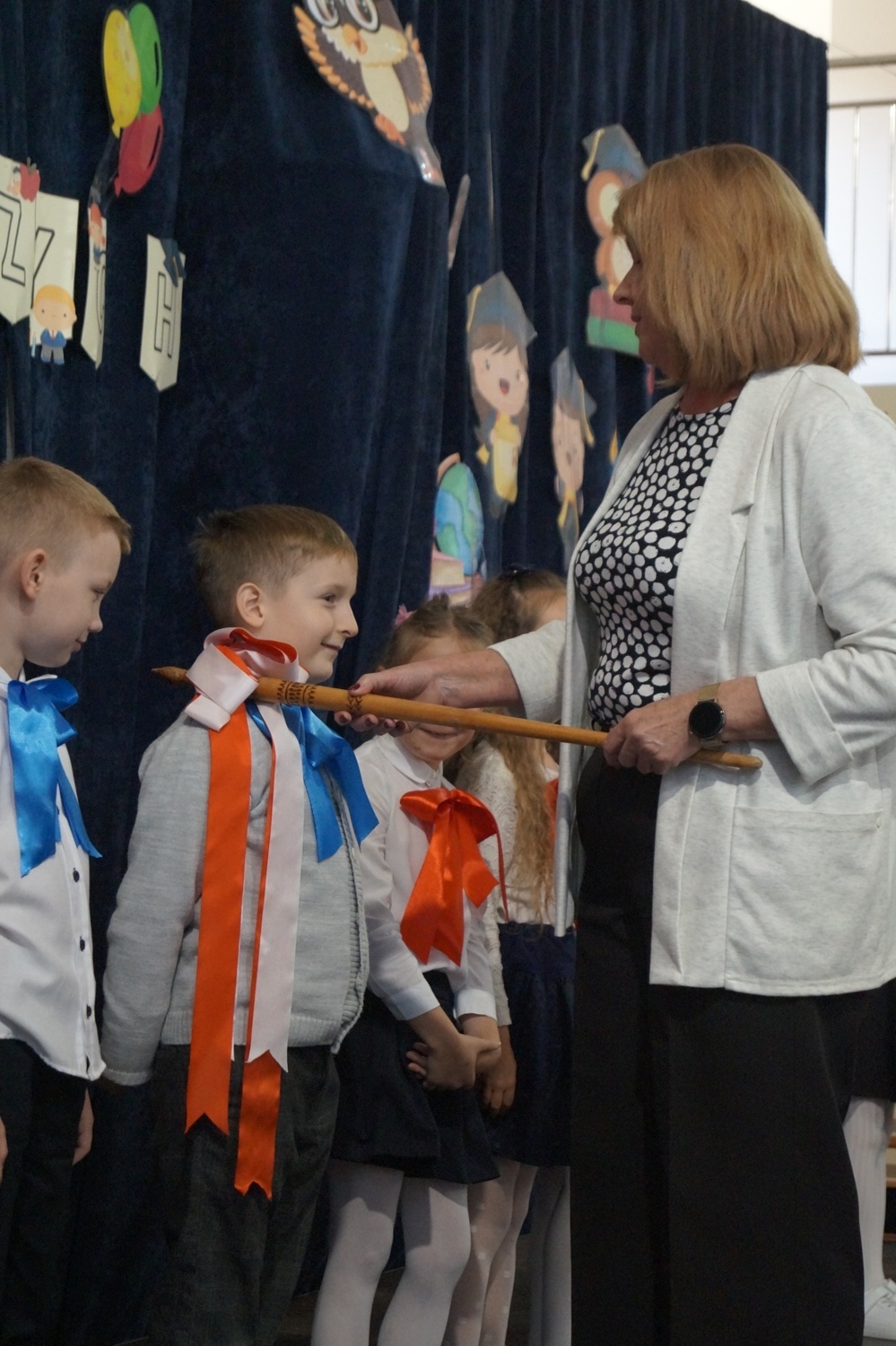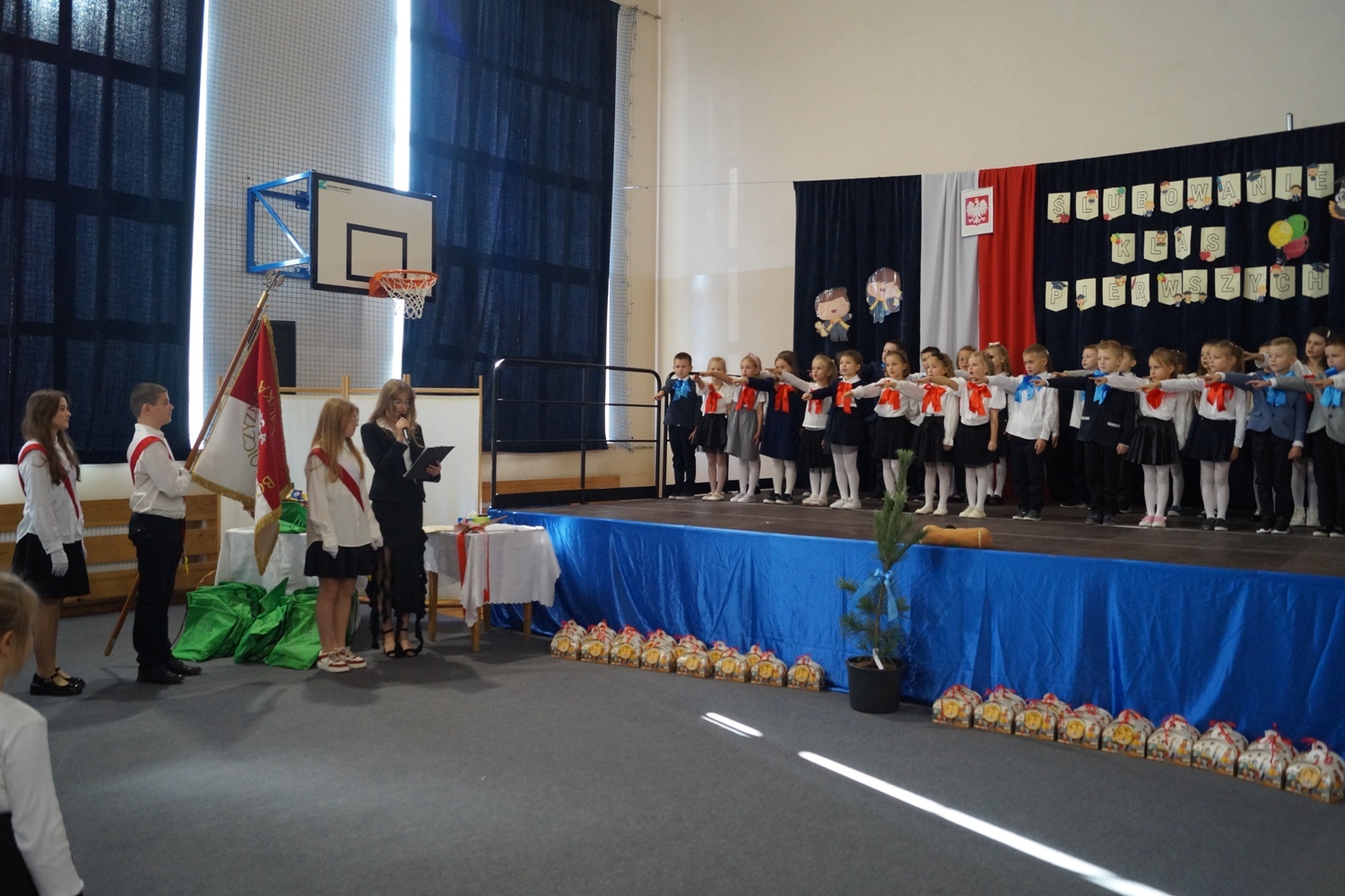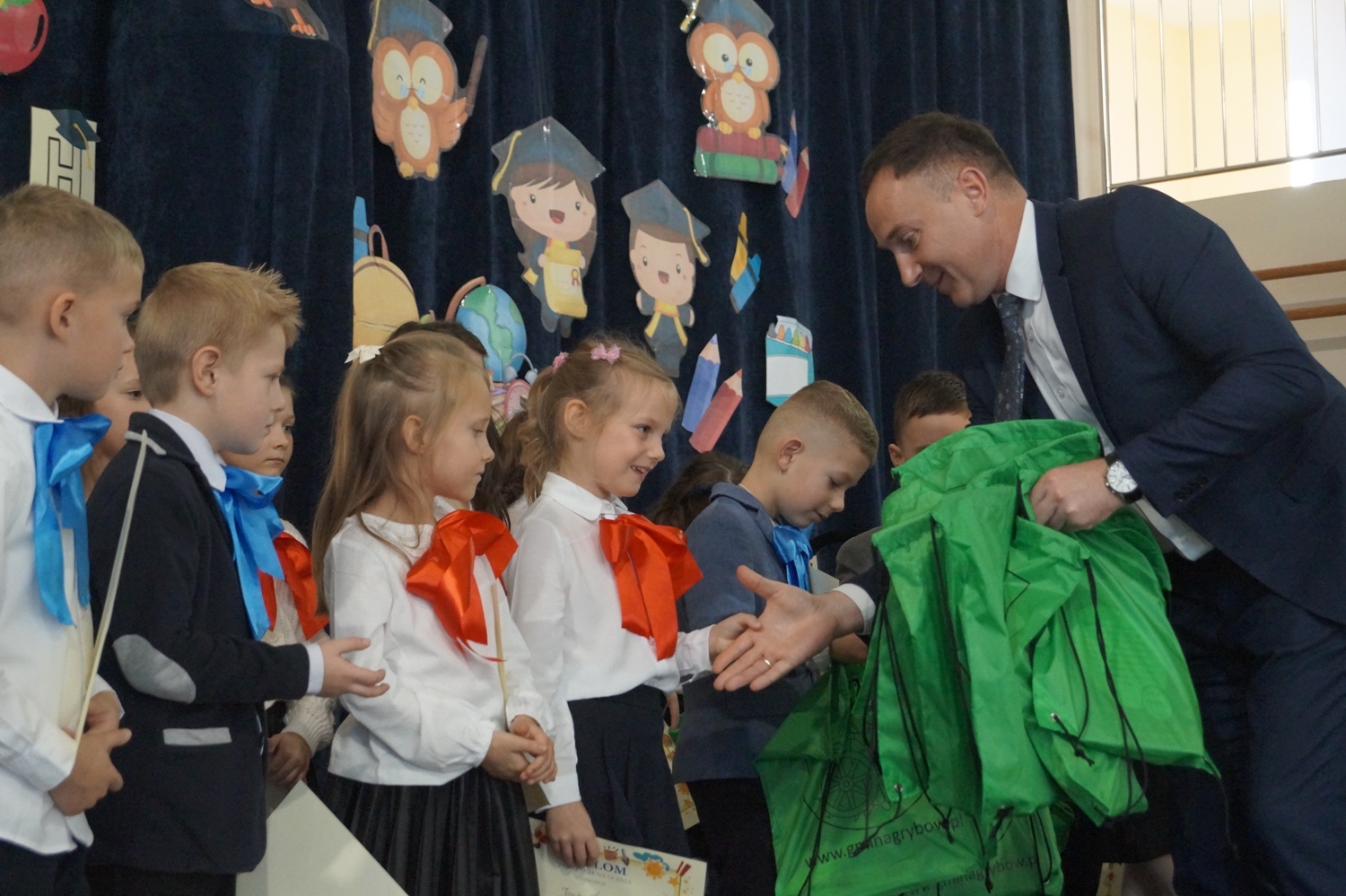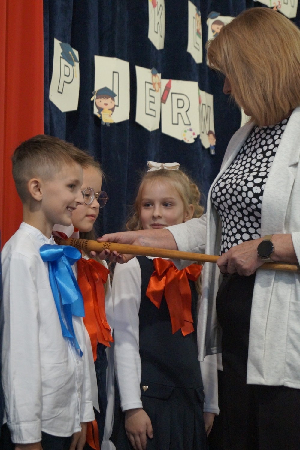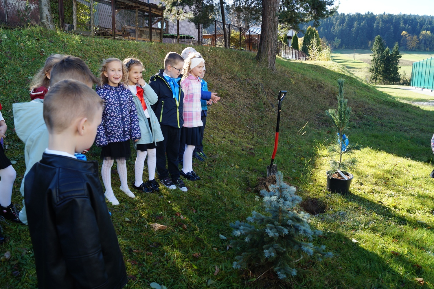 To wielkie wydarzenie rozpoczęła p. Dyrektor Urszula Ząber witając gości: Wójta Gminy Grybów p. Jacka Migacza, Grono Pedagogiczne, rodziców, społeczność szkolną oraz głównych bohaterów - Pierwszoklasistów. Obie klasy zaprezentowały swoje talenty recytatorskie, umiejętności wokalne i na sam koniec nie zabrakło żywiołowego tańca. Po tak obszernym i wymagającym zaprezentowaniu się z wielką radością dzieci zostały przyjęte do grona Uczniów Naszej Szkoły. Po uroczystym Ślubowaniu i Pasowaniu zaproszeni goście, rodzice i dzieci dokonali wspólnego sadzenia drzewa - symbolizującego Ich pobyt w szkole. Następnie udali się do sal i zasiedli z rodzicami do słodkiego poczęstunku.