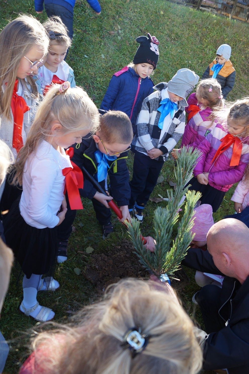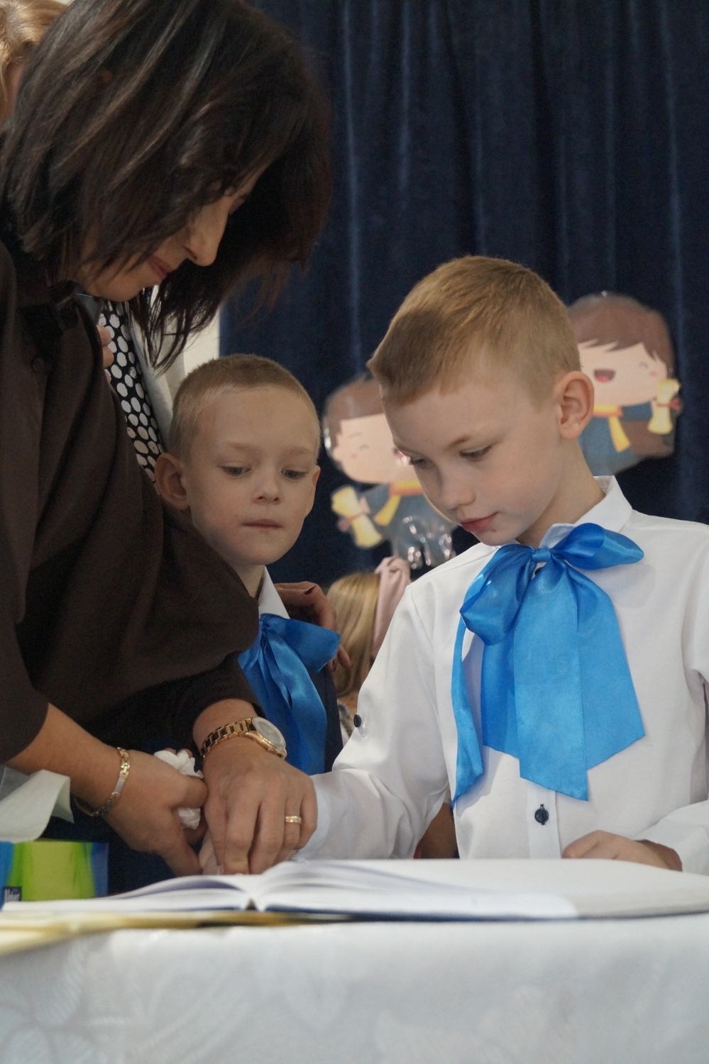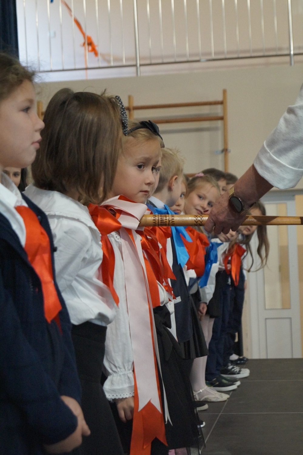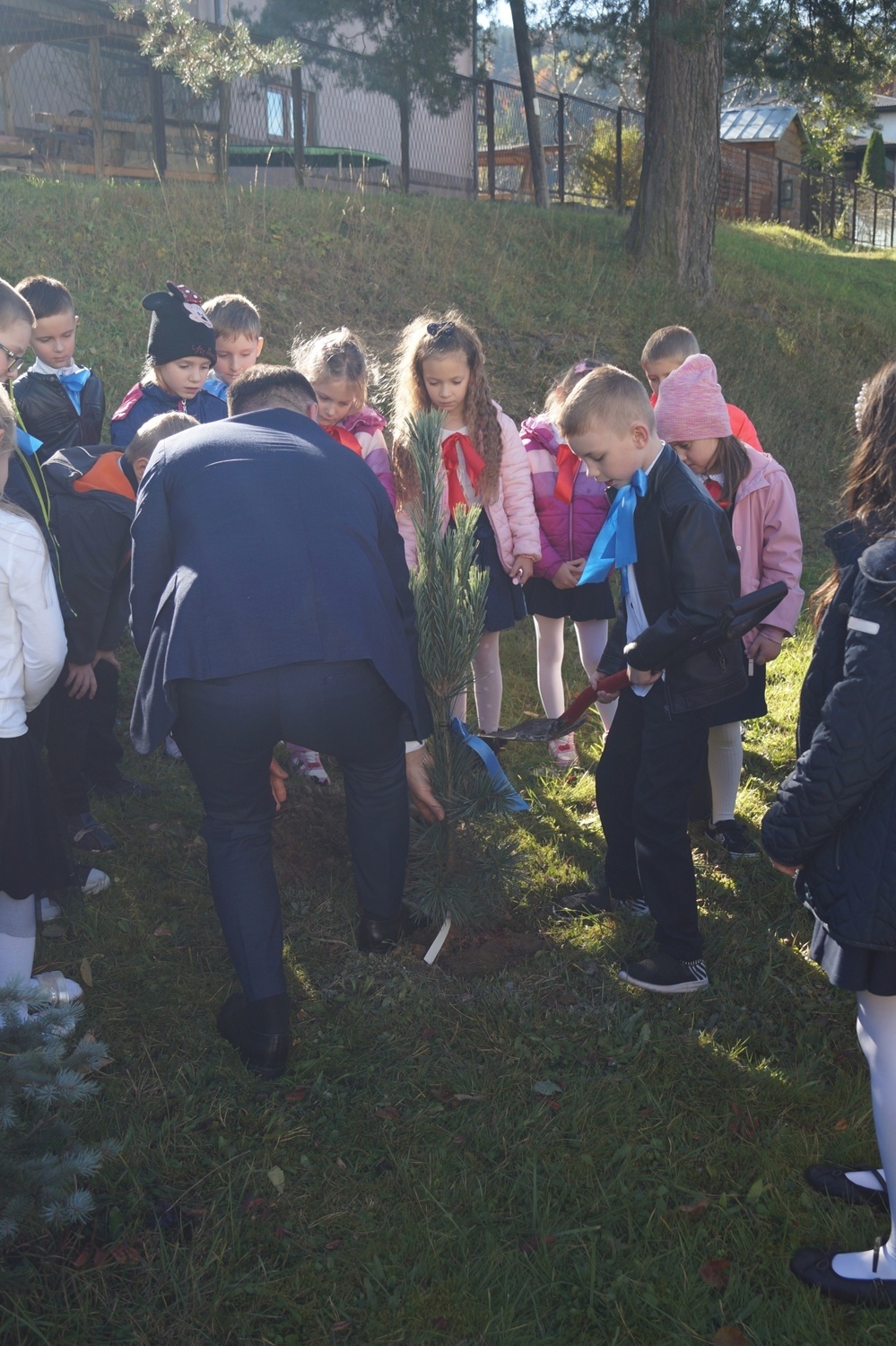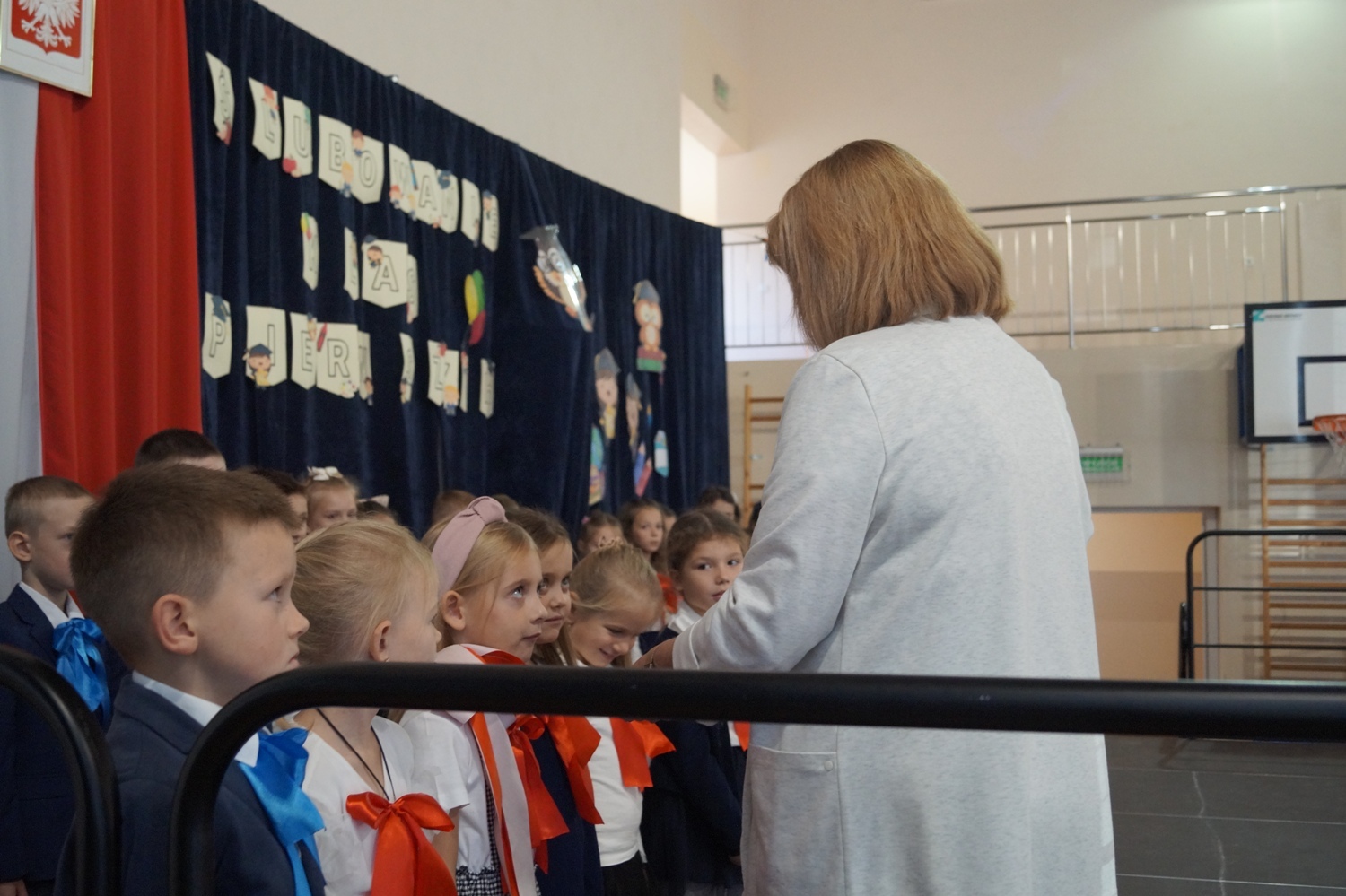 To wielkie wydarzenie rozpoczęła p. Dyrektor Urszula Ząber witając gości: Wójta Gminy Grybów p. Jacka Migacza, Grono Pedagogiczne, rodziców, społeczność szkolną oraz głównych bohaterów - Pierwszoklasistów. Obie klasy zaprezentowały swoje talenty recytatorskie, umiejętności wokalne i na sam koniec nie zabrakło żywiołowego tańca. Po tak obszernym i wymagającym zaprezentowaniu się z wielką radością dzieci zostały przyjęte do grona Uczniów Naszej Szkoły. Po uroczystym Ślubowaniu i Pasowaniu zaproszeni goście, rodzice i dzieci dokonali wspólnego sadzenia drzewa - symbolizującego Ich pobyt w szkole. Następnie udali się do sal i zasiedli z rodzicami do słodkiego poczęstunku.