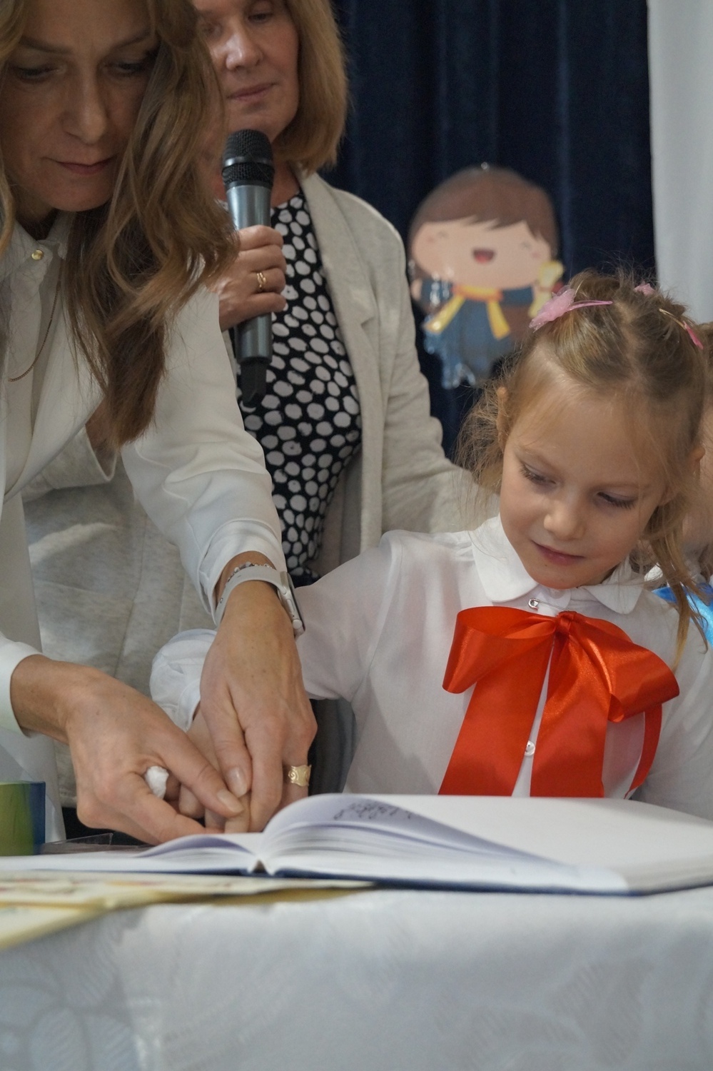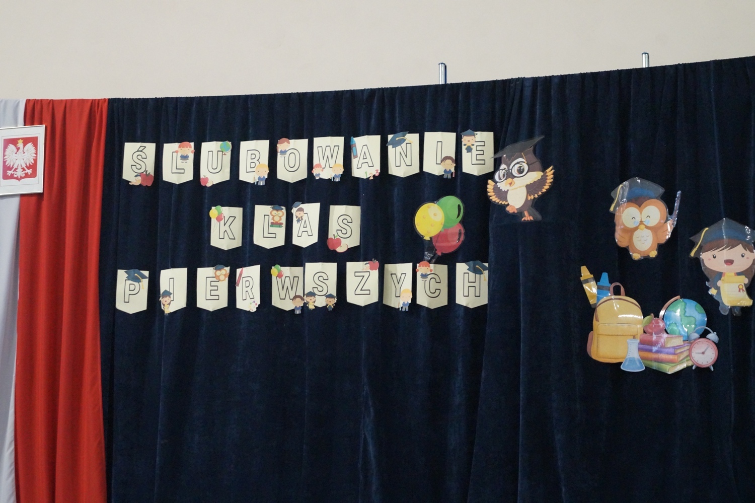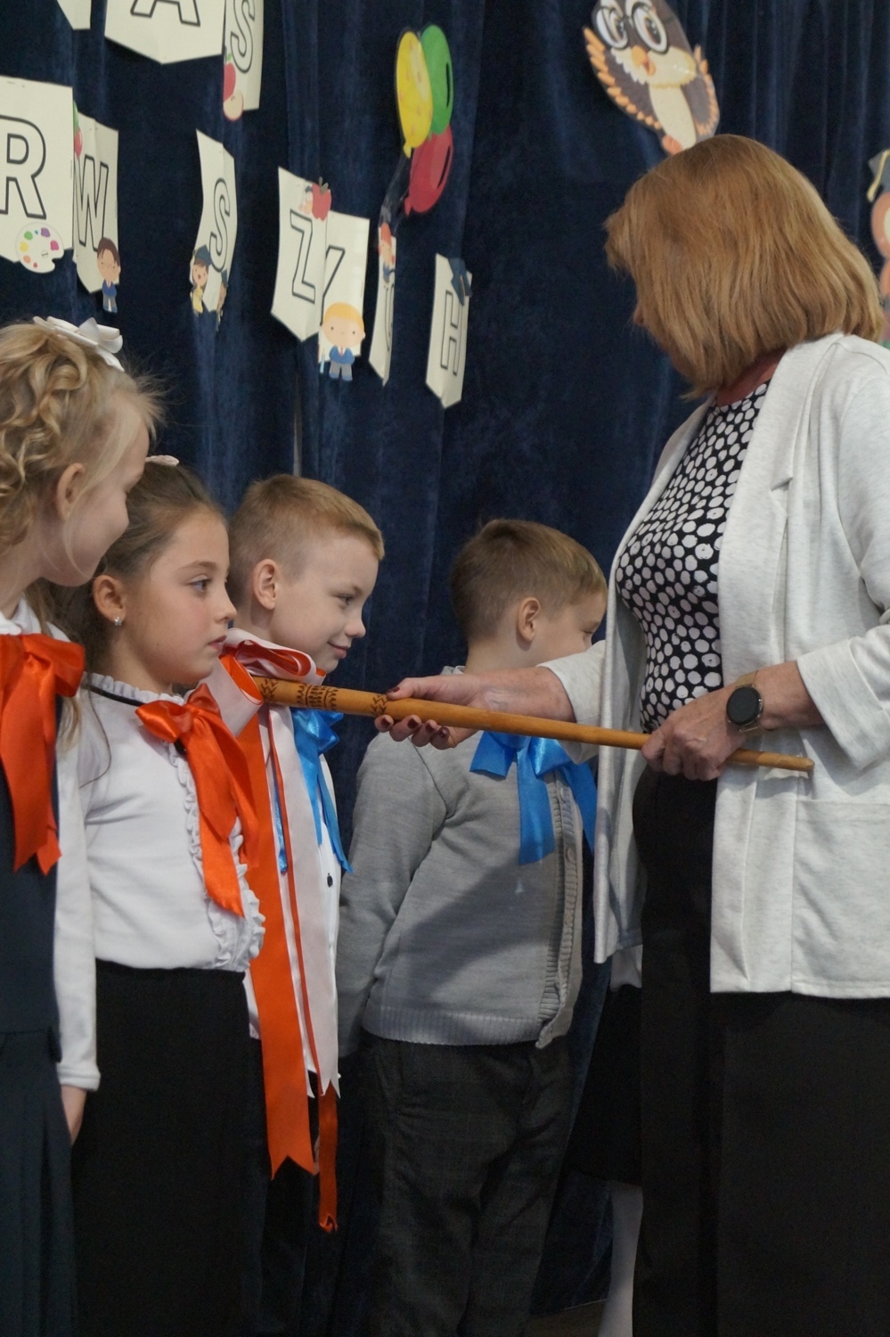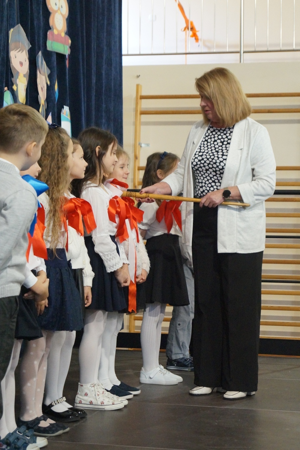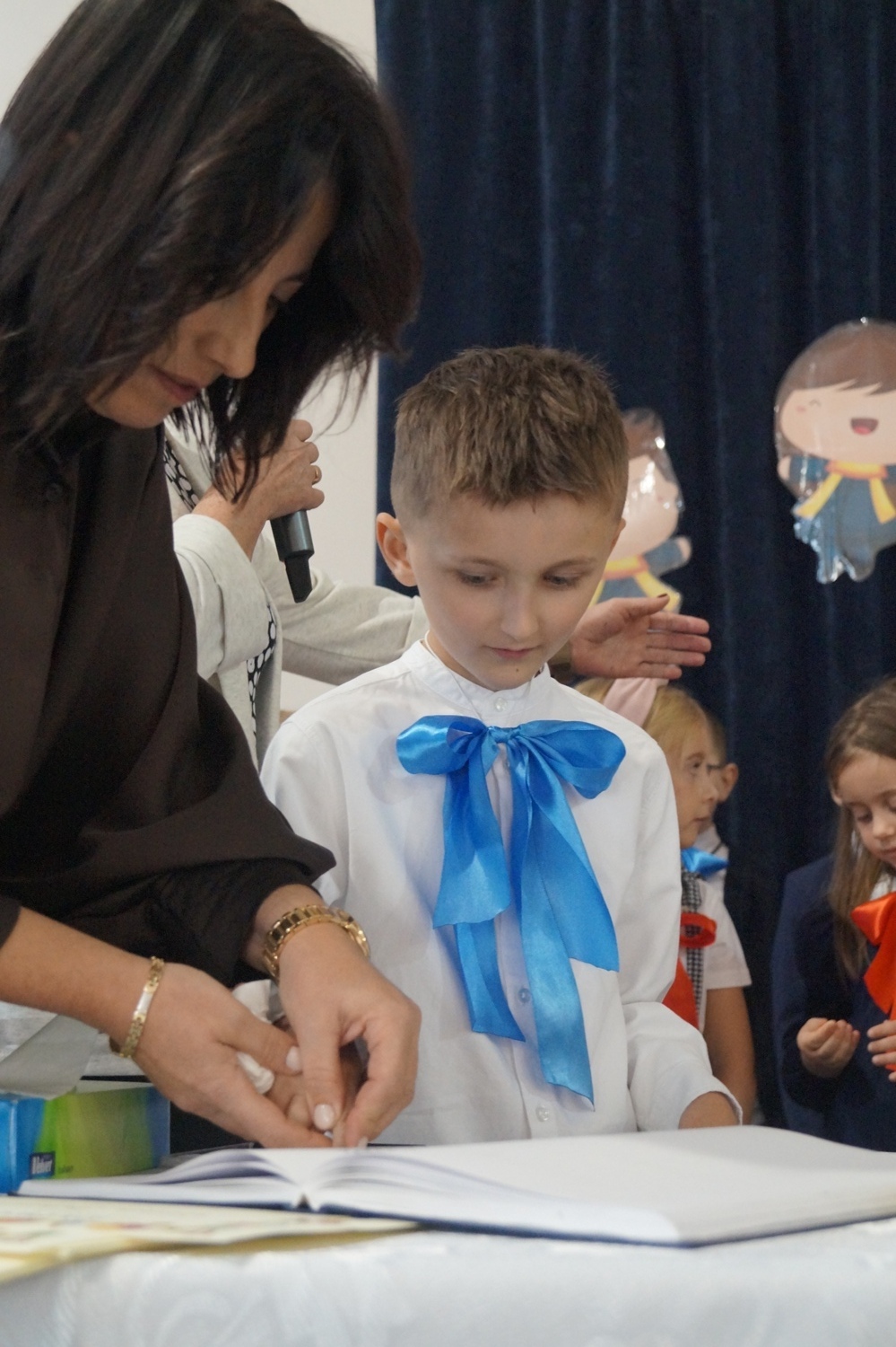 To wielkie wydarzenie rozpoczęła p. Dyrektor Urszula Ząber witając gości: Wójta Gminy Grybów p. Jacka Migacza, Grono Pedagogiczne, rodziców, społeczność szkolną oraz głównych bohaterów - Pierwszoklasistów. Obie klasy zaprezentowały swoje talenty recytatorskie, umiejętności wokalne i na sam koniec nie zabrakło żywiołowego tańca. Po tak obszernym i wymagającym zaprezentowaniu się z wielką radością dzieci zostały przyjęte do grona Uczniów Naszej Szkoły. Po uroczystym Ślubowaniu i Pasowaniu zaproszeni goście, rodzice i dzieci dokonali wspólnego sadzenia drzewa - symbolizującego Ich pobyt w szkole. Następnie udali się do sal i zasiedli z rodzicami do słodkiego poczęstunku.