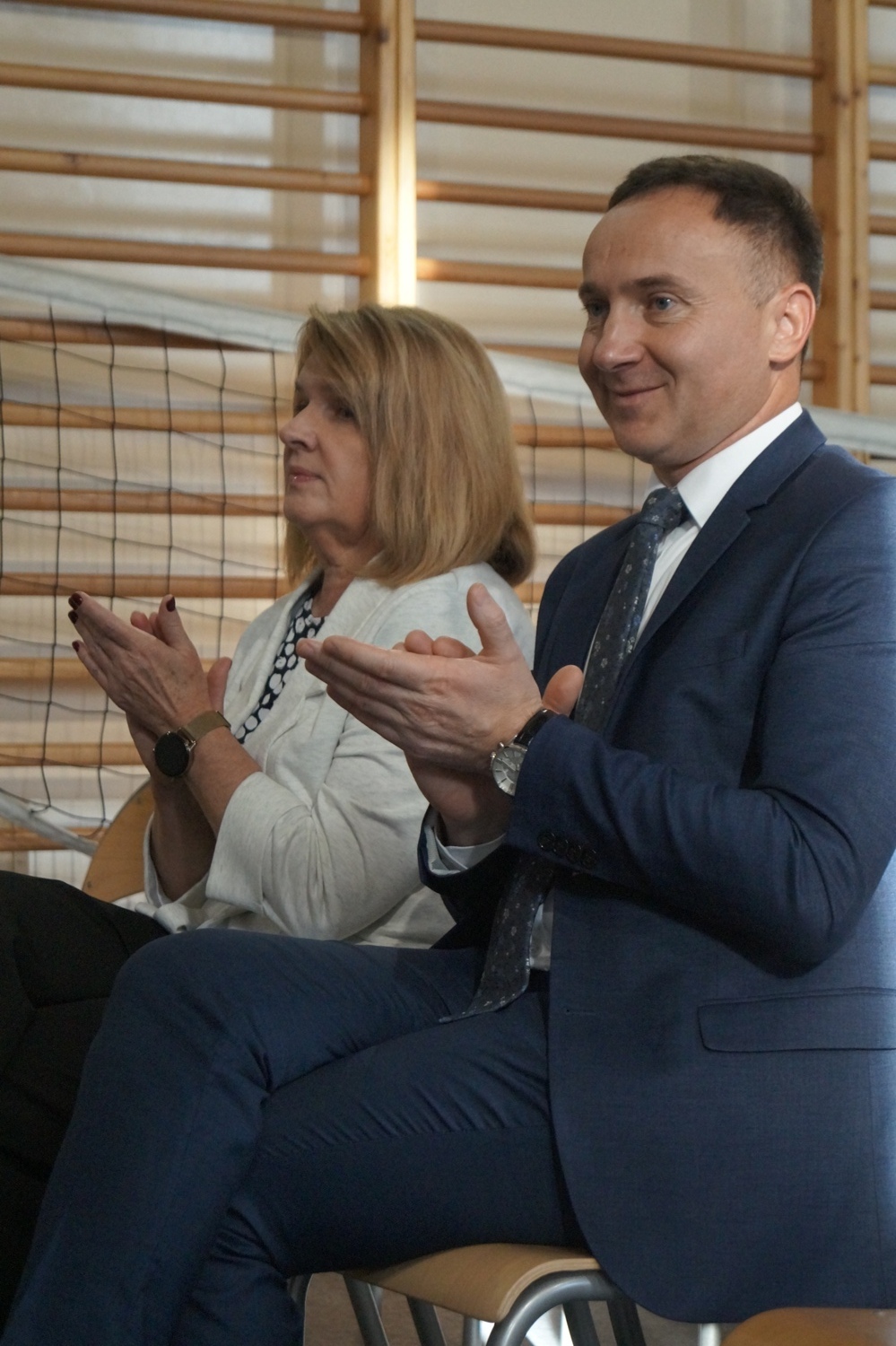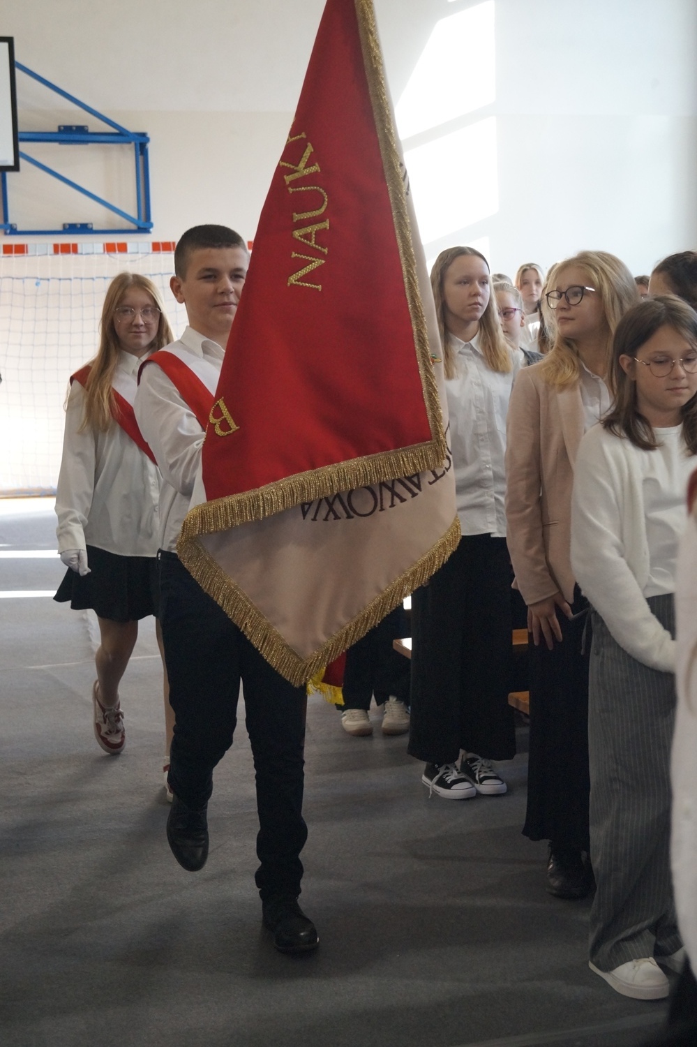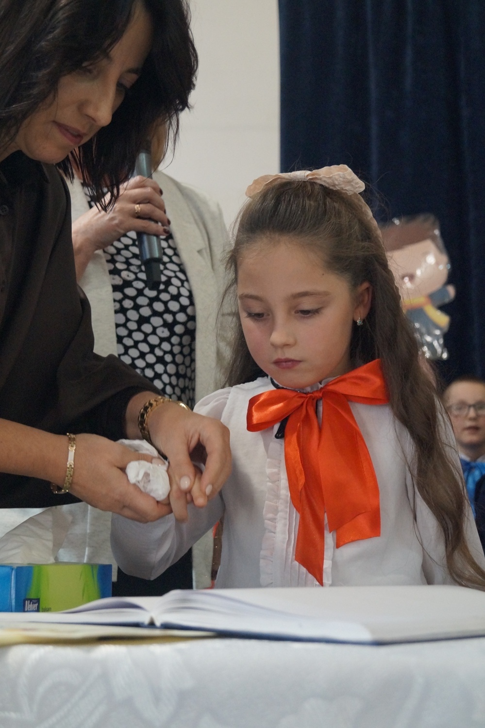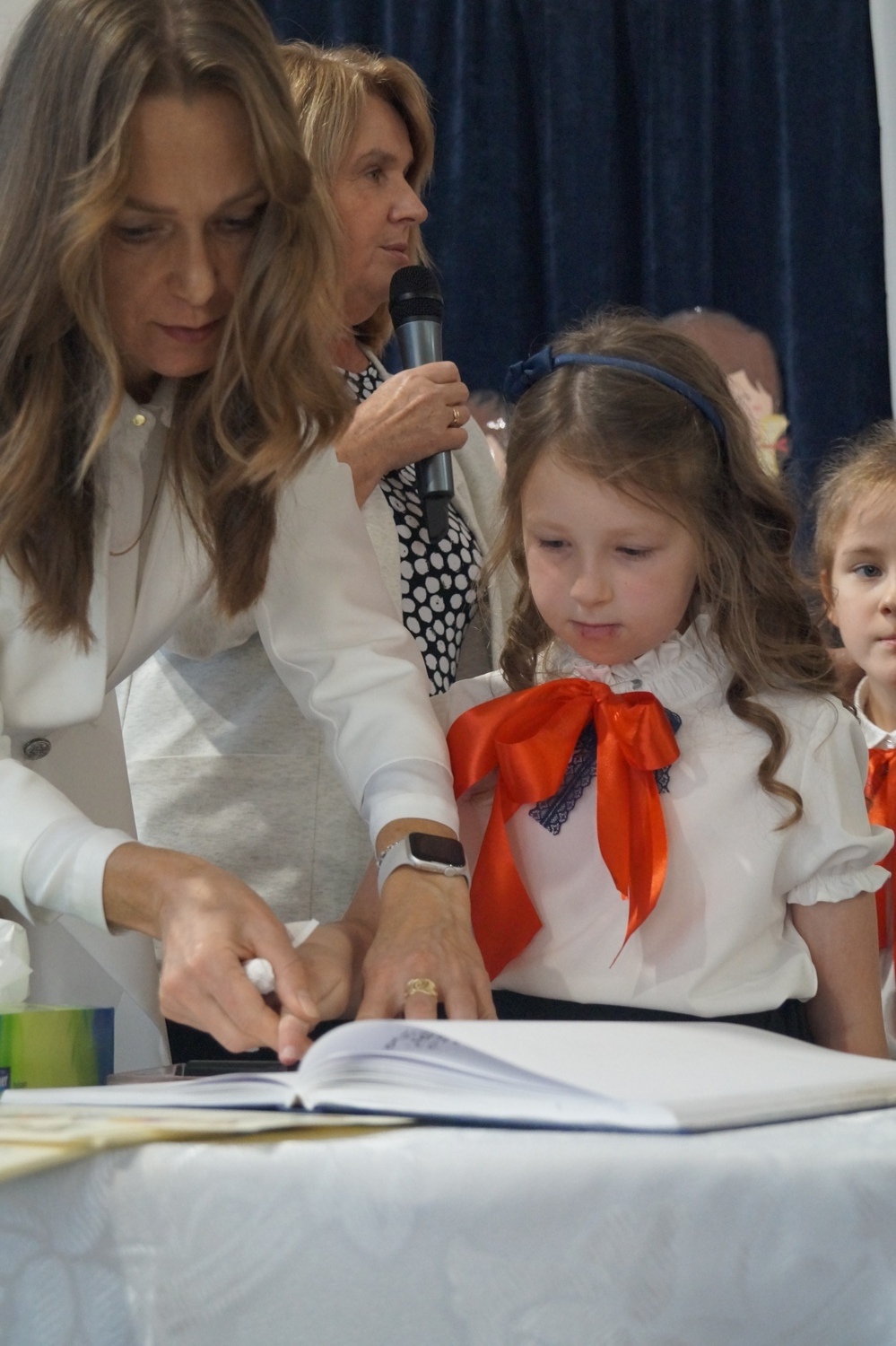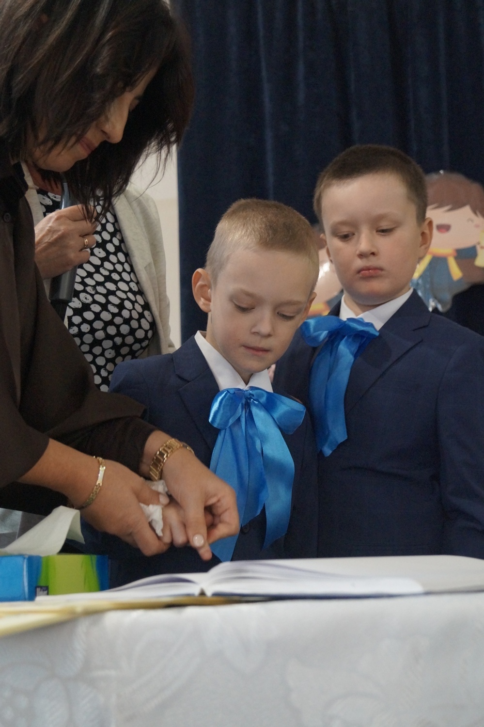 To wielkie wydarzenie rozpoczęła p. Dyrektor Urszula Ząber witając gości: Wójta Gminy Grybów p. Jacka Migacza, Grono Pedagogiczne, rodziców, społeczność szkolną oraz głównych bohaterów - Pierwszoklasistów. Obie klasy zaprezentowały swoje talenty recytatorskie, umiejętności wokalne i na sam koniec nie zabrakło żywiołowego tańca. Po tak obszernym i wymagającym zaprezentowaniu się z wielką radością dzieci zostały przyjęte do grona Uczniów Naszej Szkoły. Po uroczystym Ślubowaniu i Pasowaniu zaproszeni goście, rodzice i dzieci dokonali wspólnego sadzenia drzewa - symbolizującego Ich pobyt w szkole. Następnie udali się do sal i zasiedli z rodzicami do słodkiego poczęstunku.