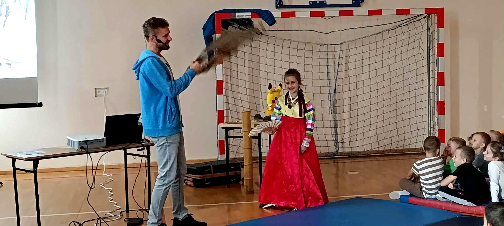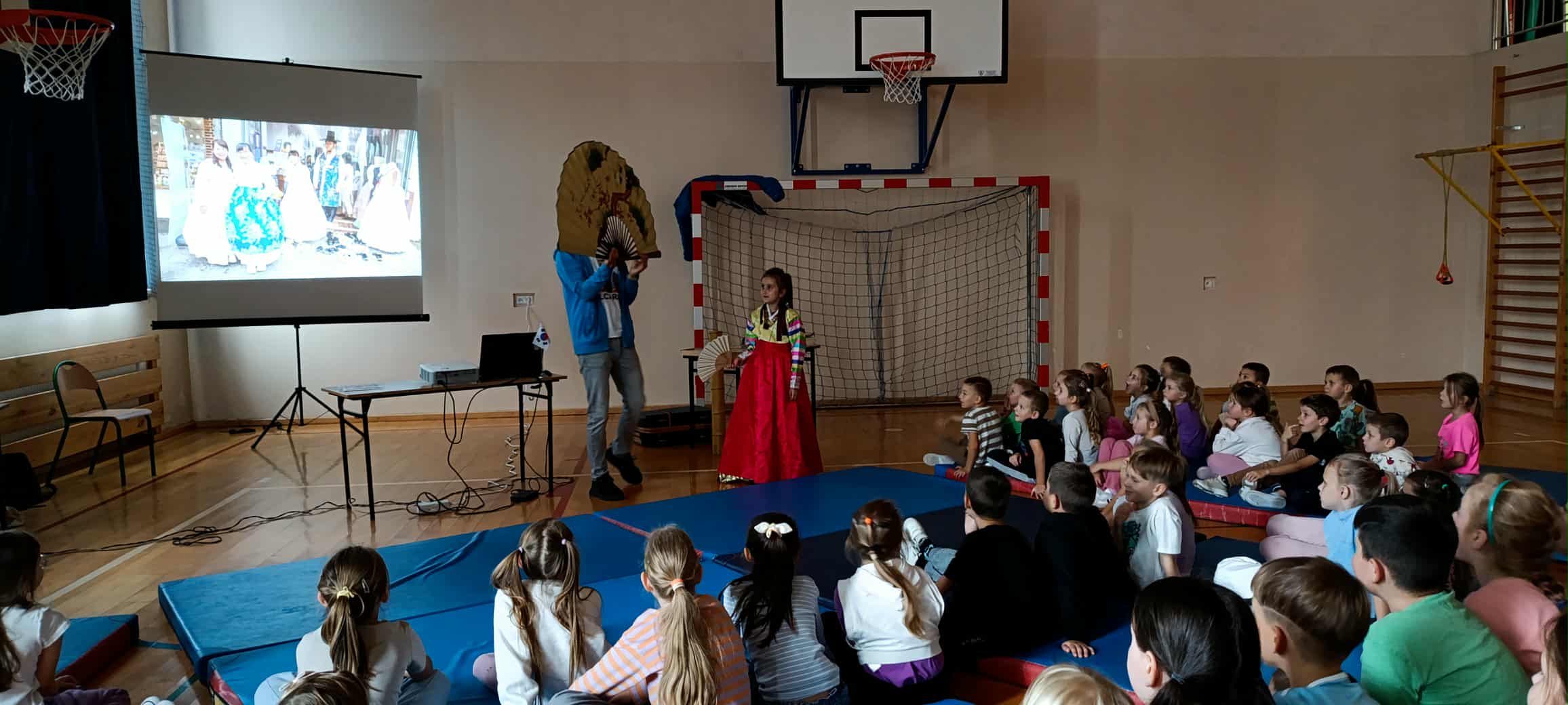Podczas spotkania dzieci mogły obejrzeć ciekawą prezentację multimedialną pełną zdjęć i opowieści o tym odległym kraju. Uczniowie poznali kulturę, tradycje i codzienne życie Koreańczyków. Dużą atrakcją okazała się możliwość przymierzenia tradycyjnego koreańskiego stroju – kilka uczennic poczuło się jak prawdziwe Koreanki.