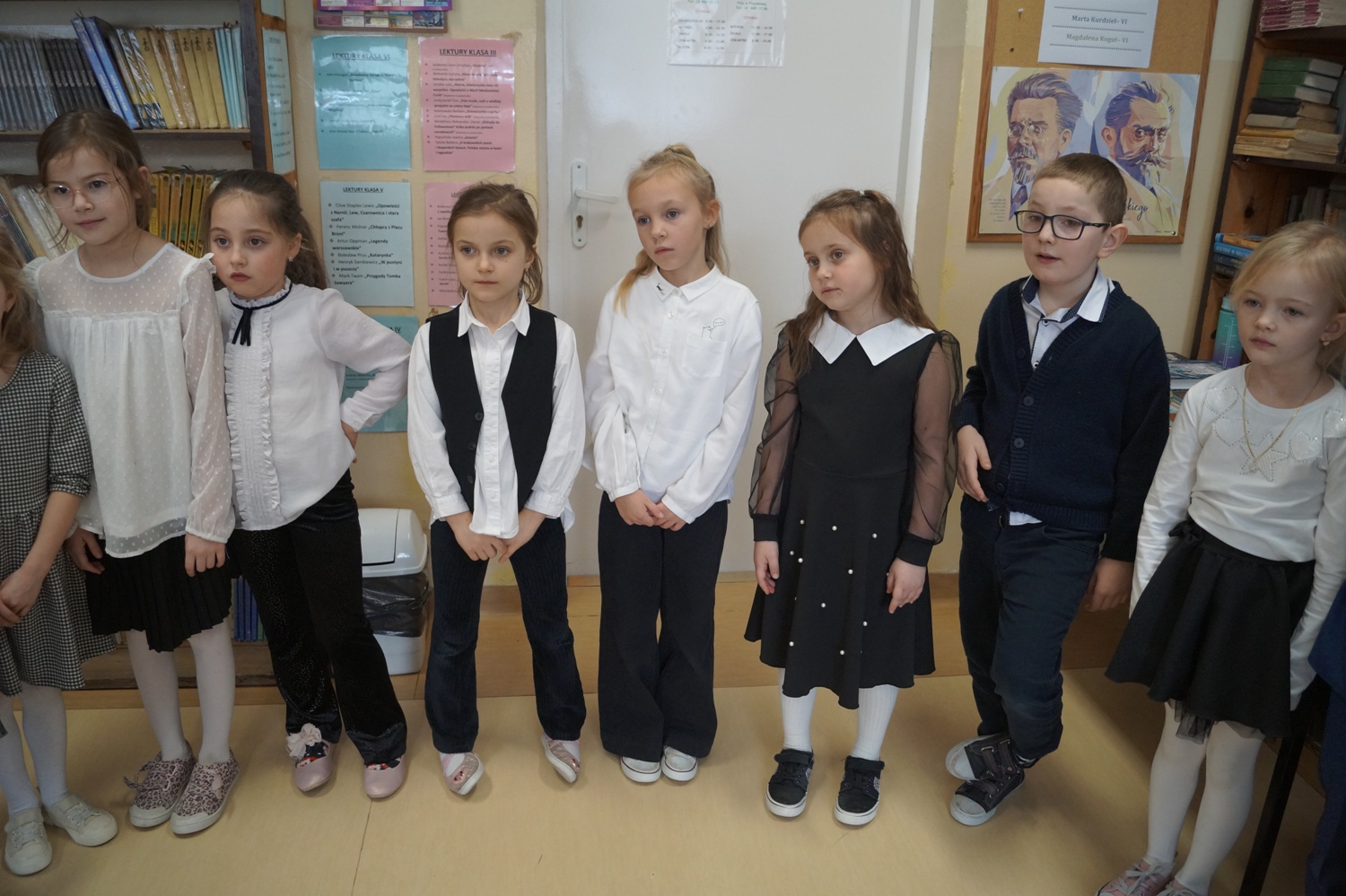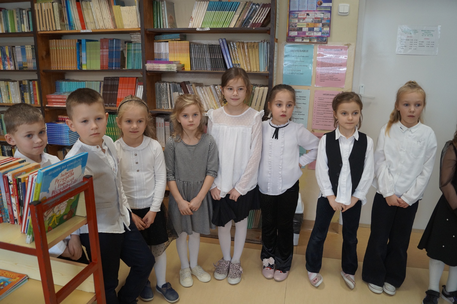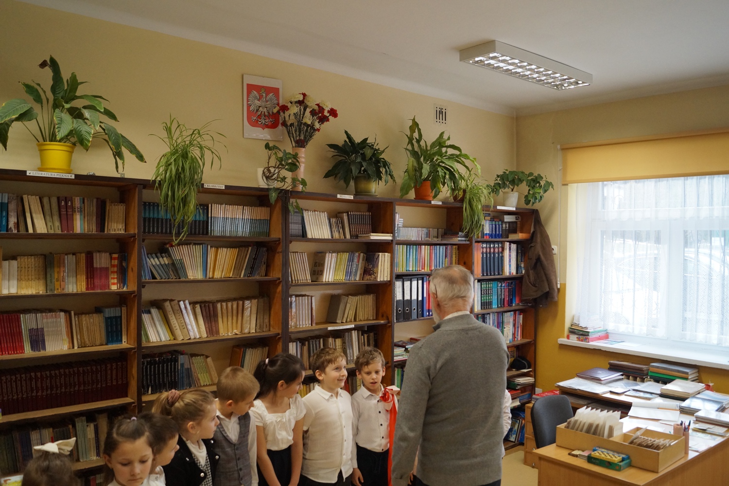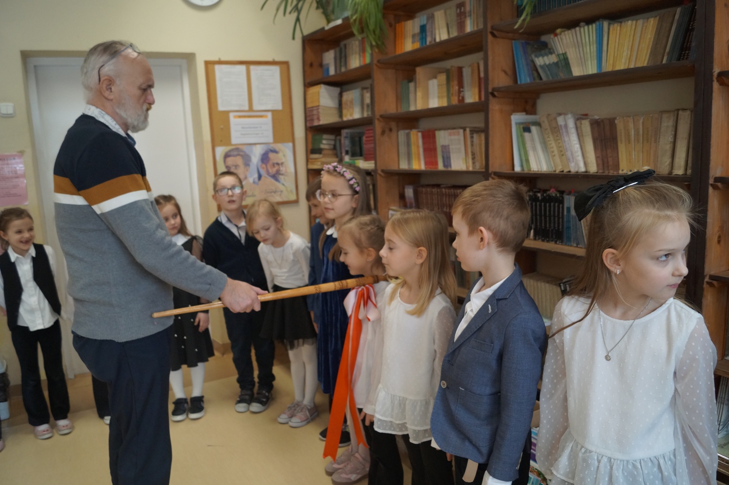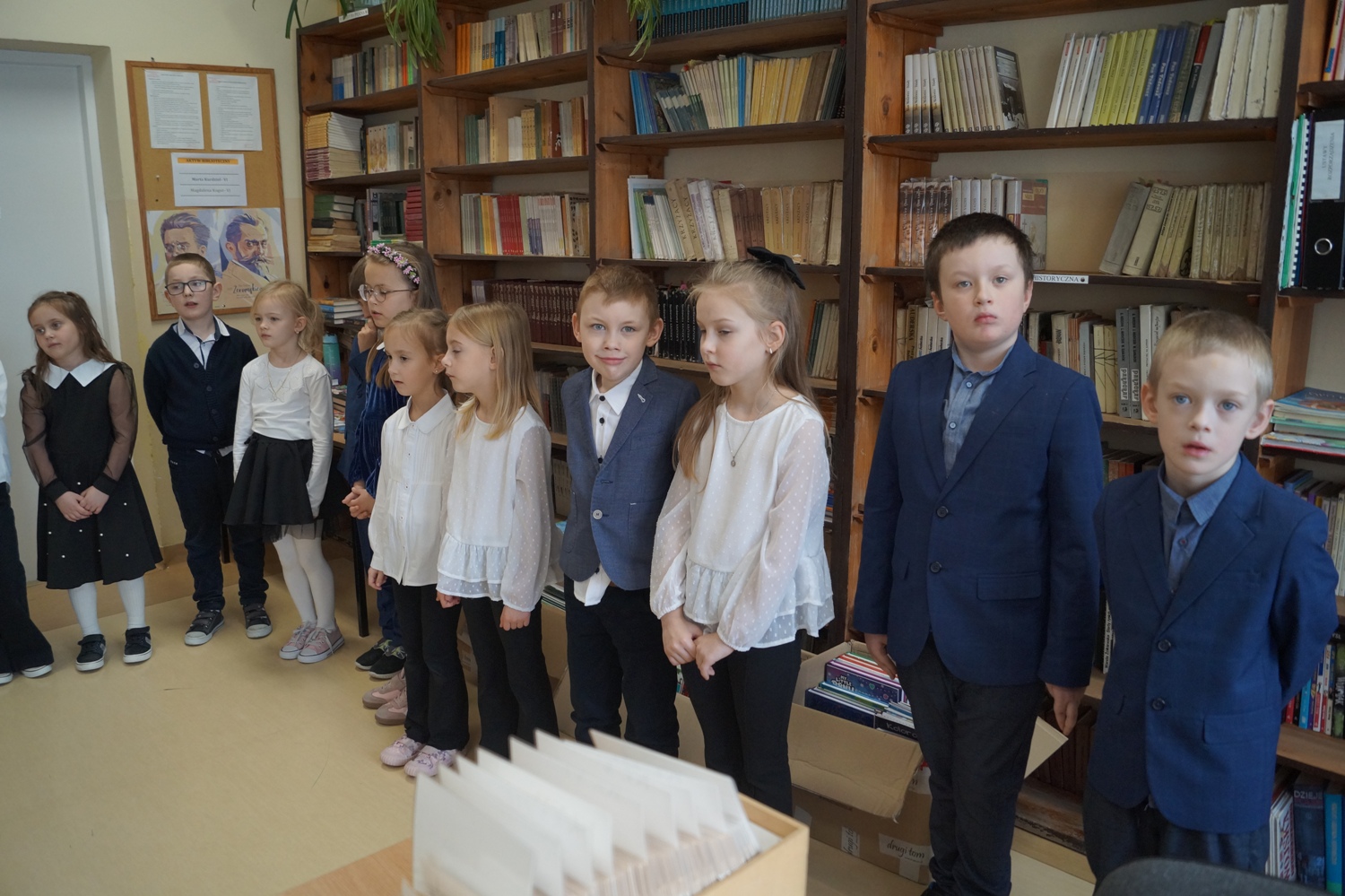 Uczniowie klasy Ib i Ia przybyli do biblioteki odświętnie ubrani wraz ze swoimi wychowawczyniami: p. Małgorzatą Siwiak i p. Beatą Rodak. Na korytarzu przywitał ich bibliotekarz szkolny, p. Wiesław Łaś.