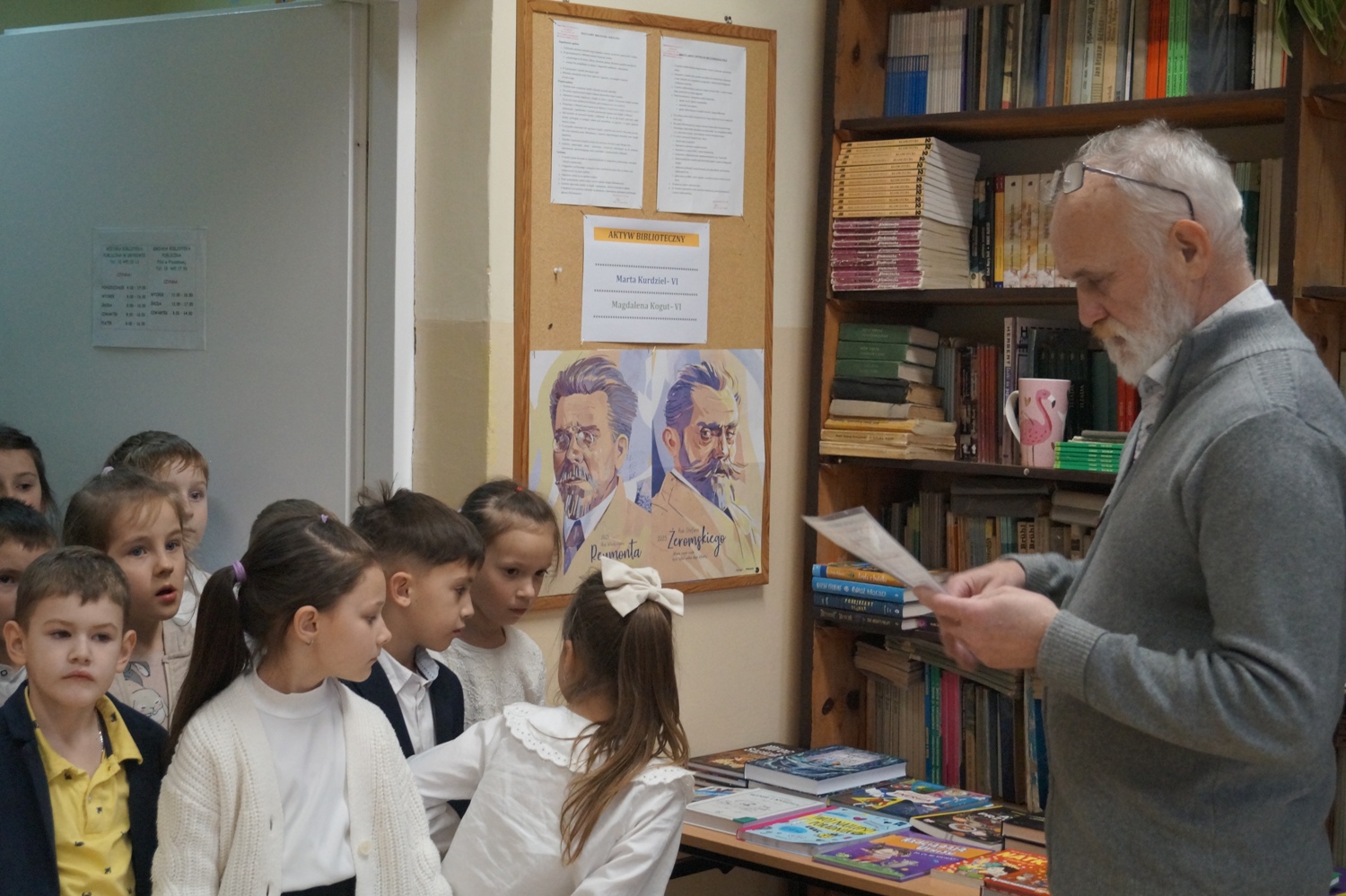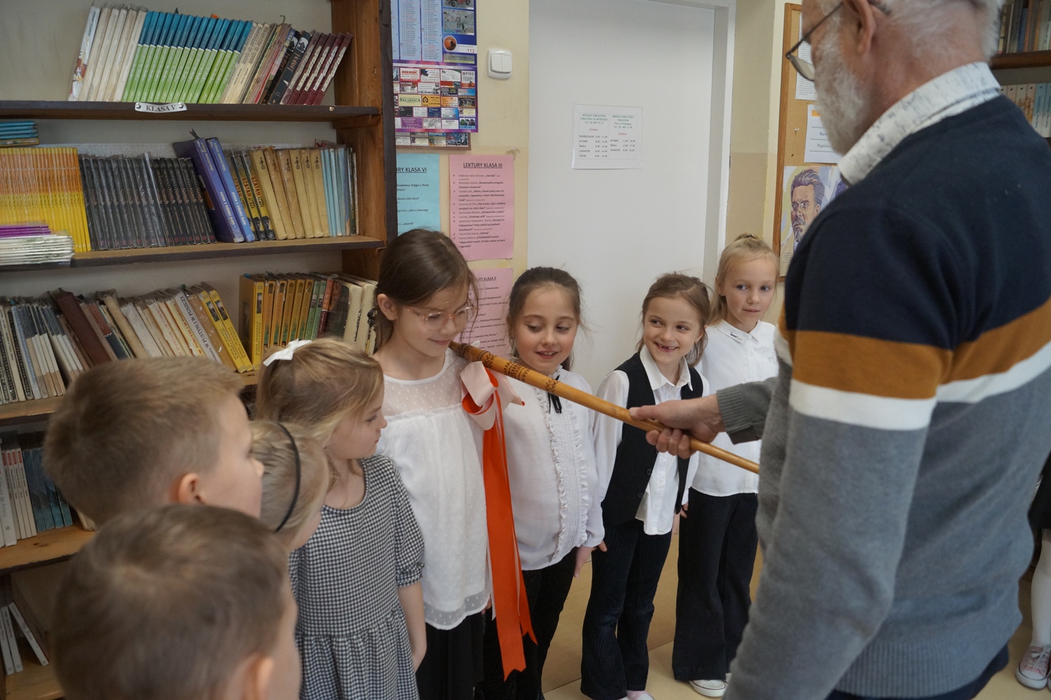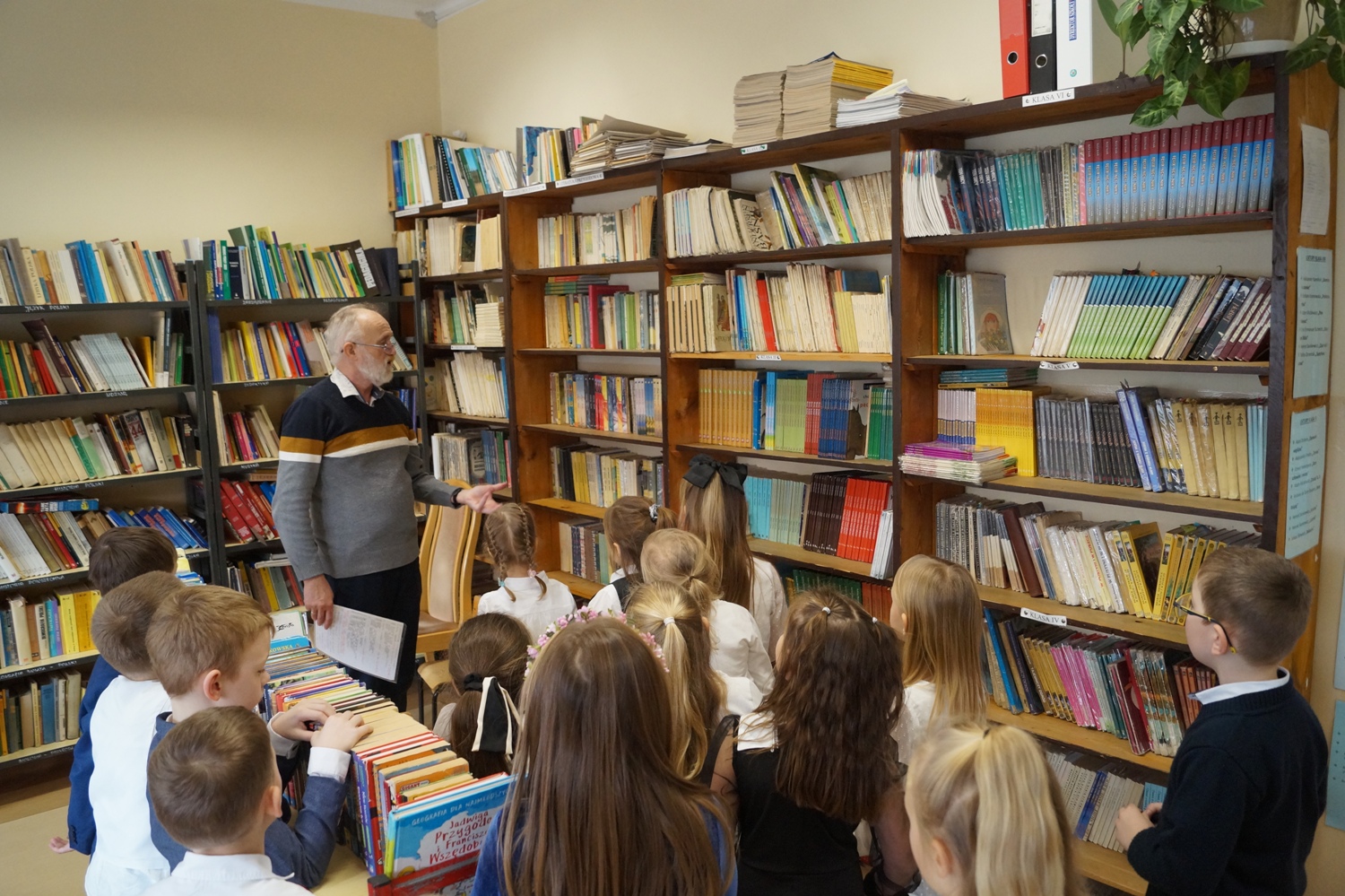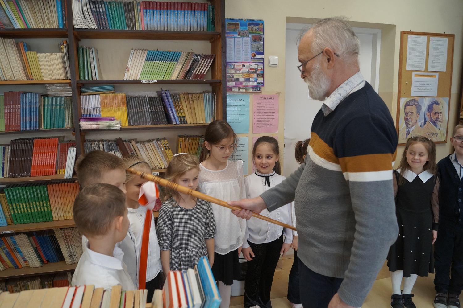 Uczniowie klasy Ib i Ia przybyli do biblioteki odświętnie ubrani wraz ze swoimi wychowawczyniami: p. Małgorzatą Siwiak i p. Beatą Rodak. Na korytarzu przywitał ich bibliotekarz szkolny, p. Wiesław Łaś.