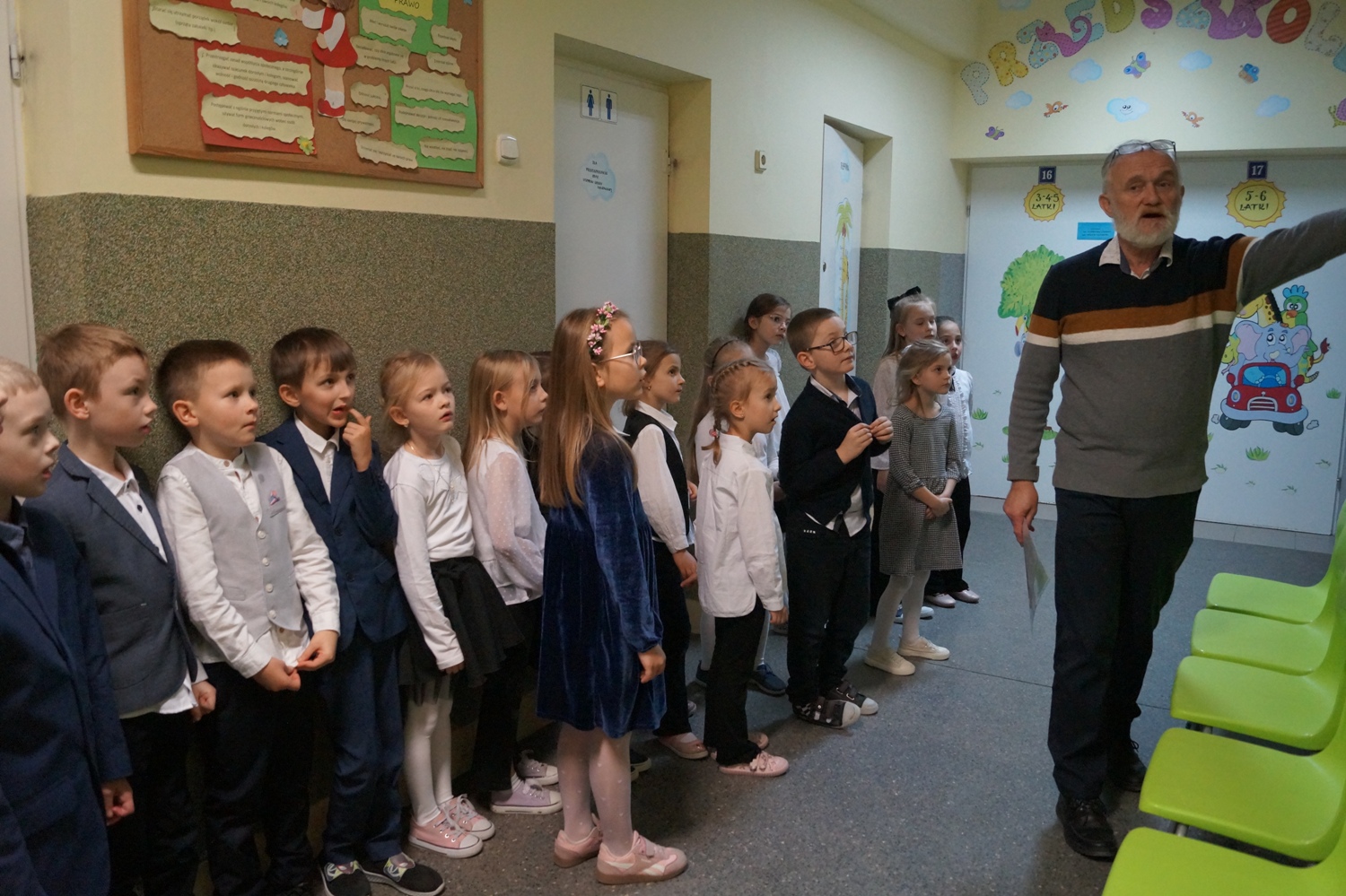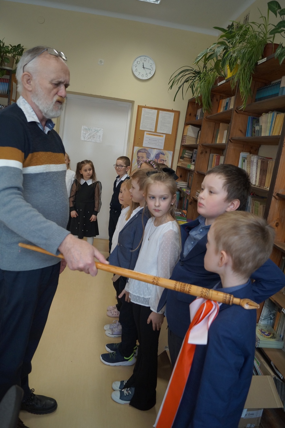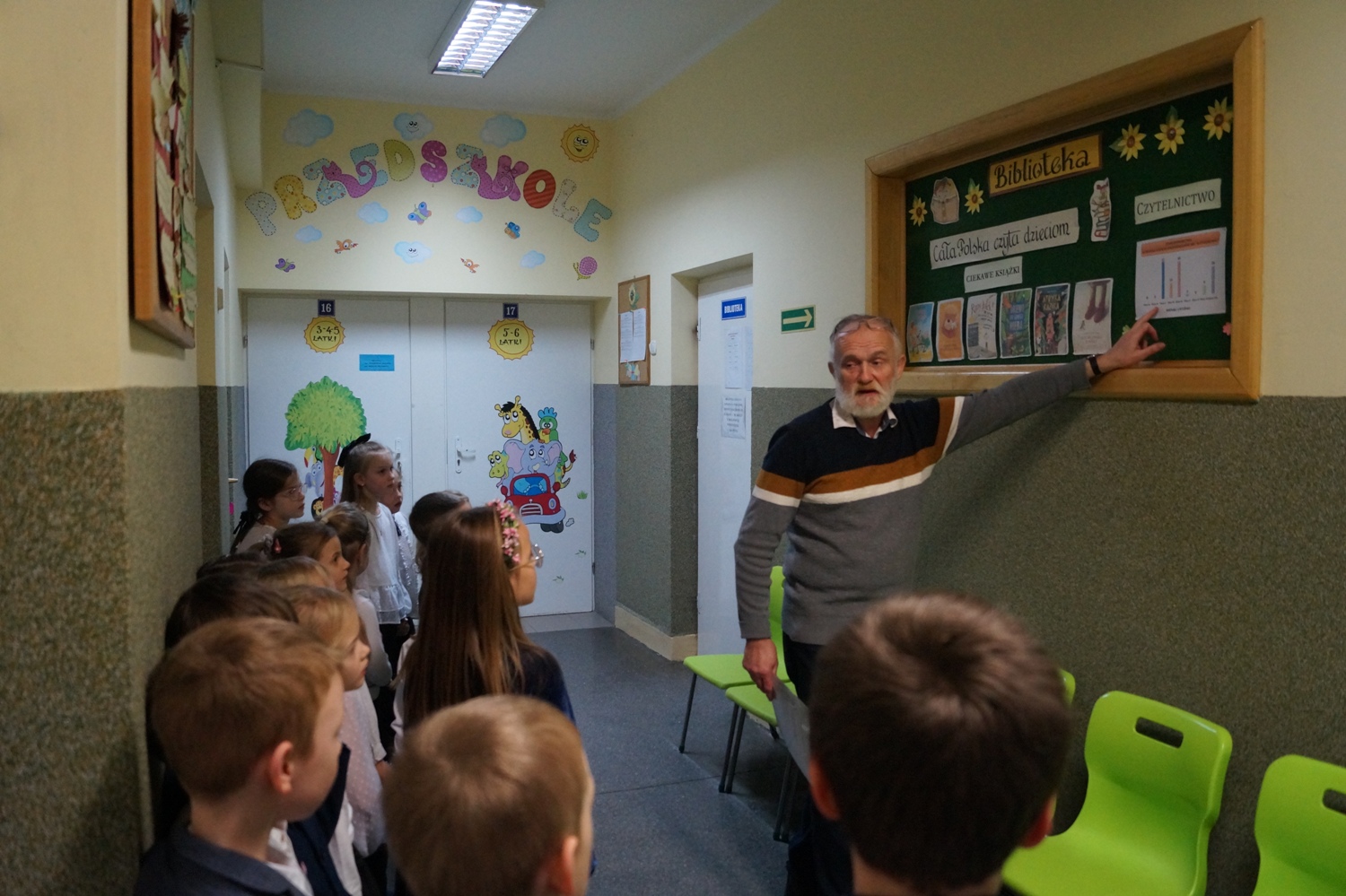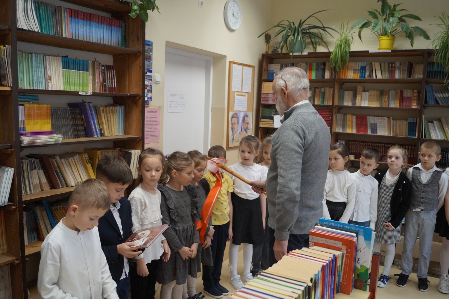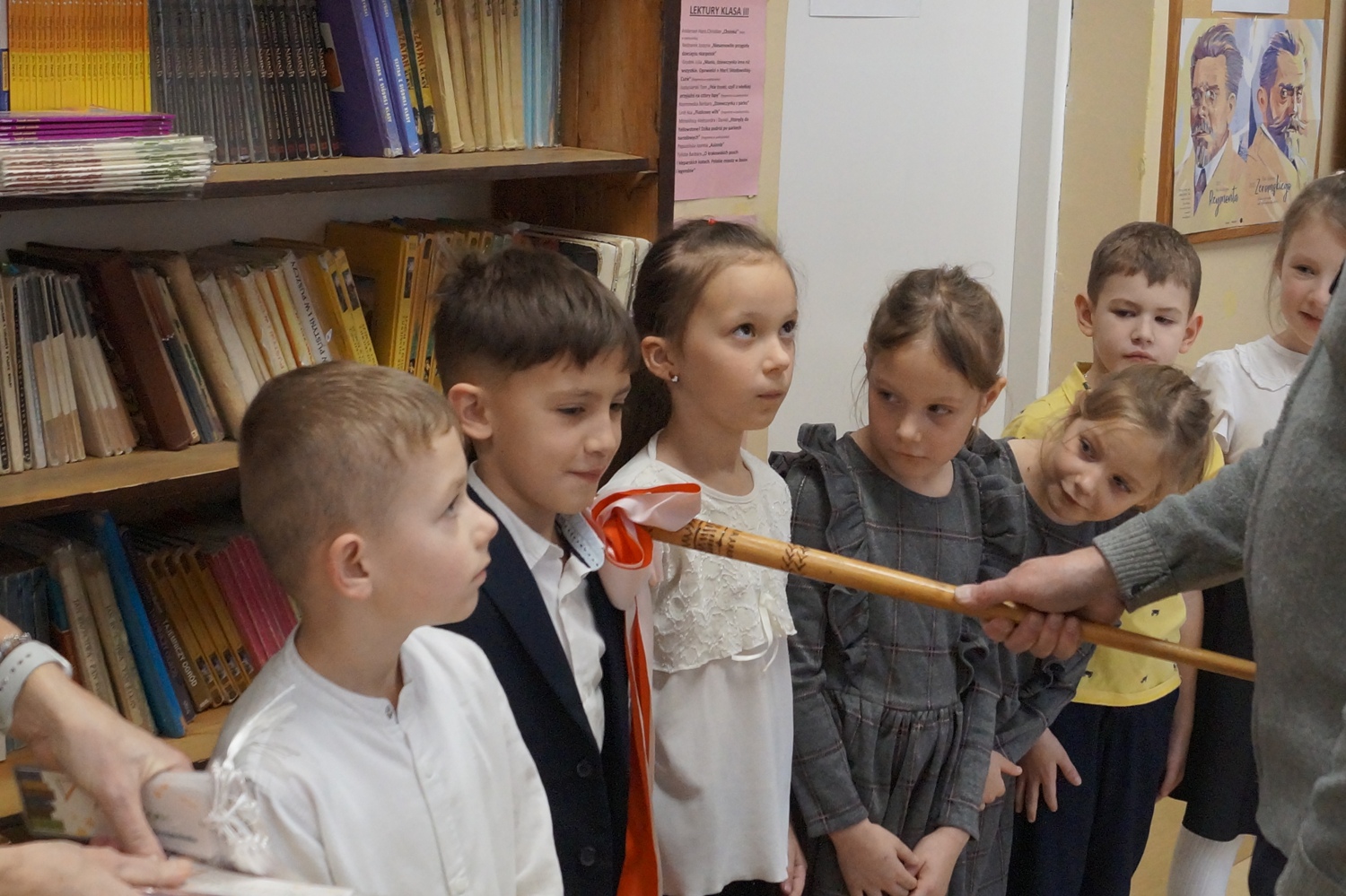Uczniowie klasy Ib i Ia przybyli do biblioteki odświętnie ubrani wraz ze swoimi wychowawczyniami: p. Małgorzatą Siwiak i p. Beatą Rodak. Na korytarzu przywitał ich bibliotekarz szkolny, p. Wiesław Łaś.