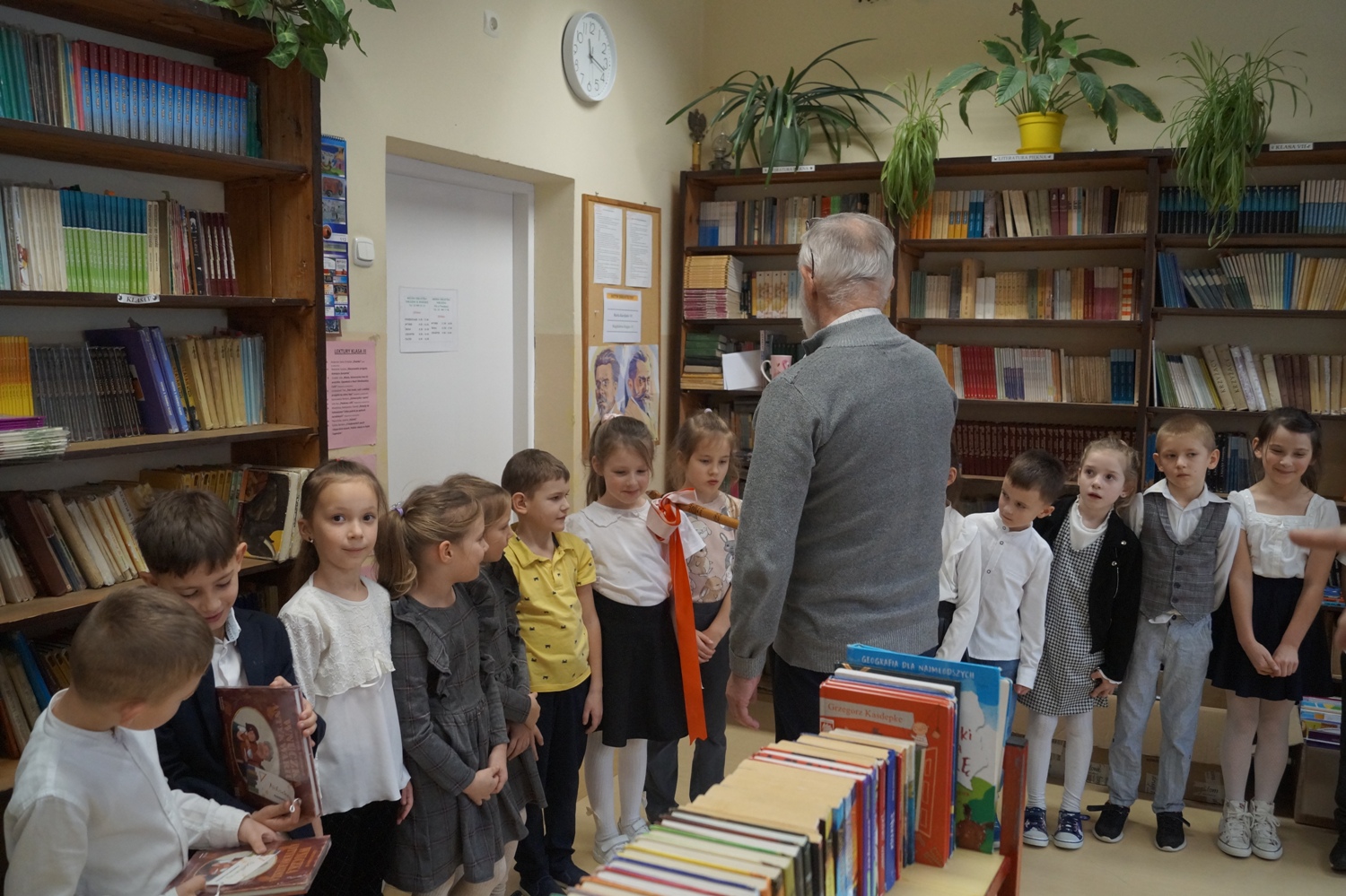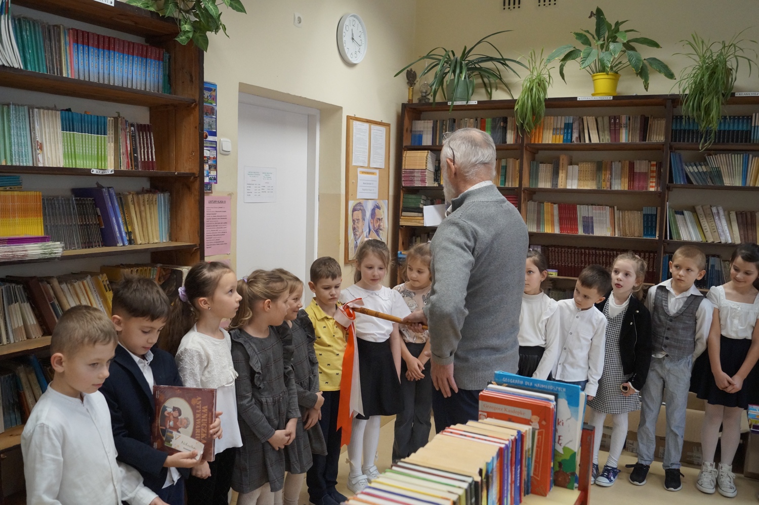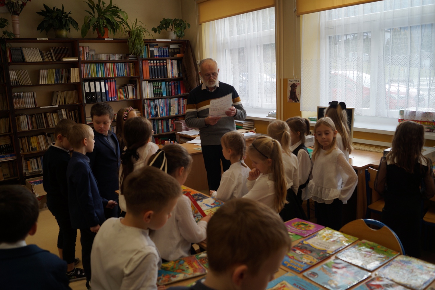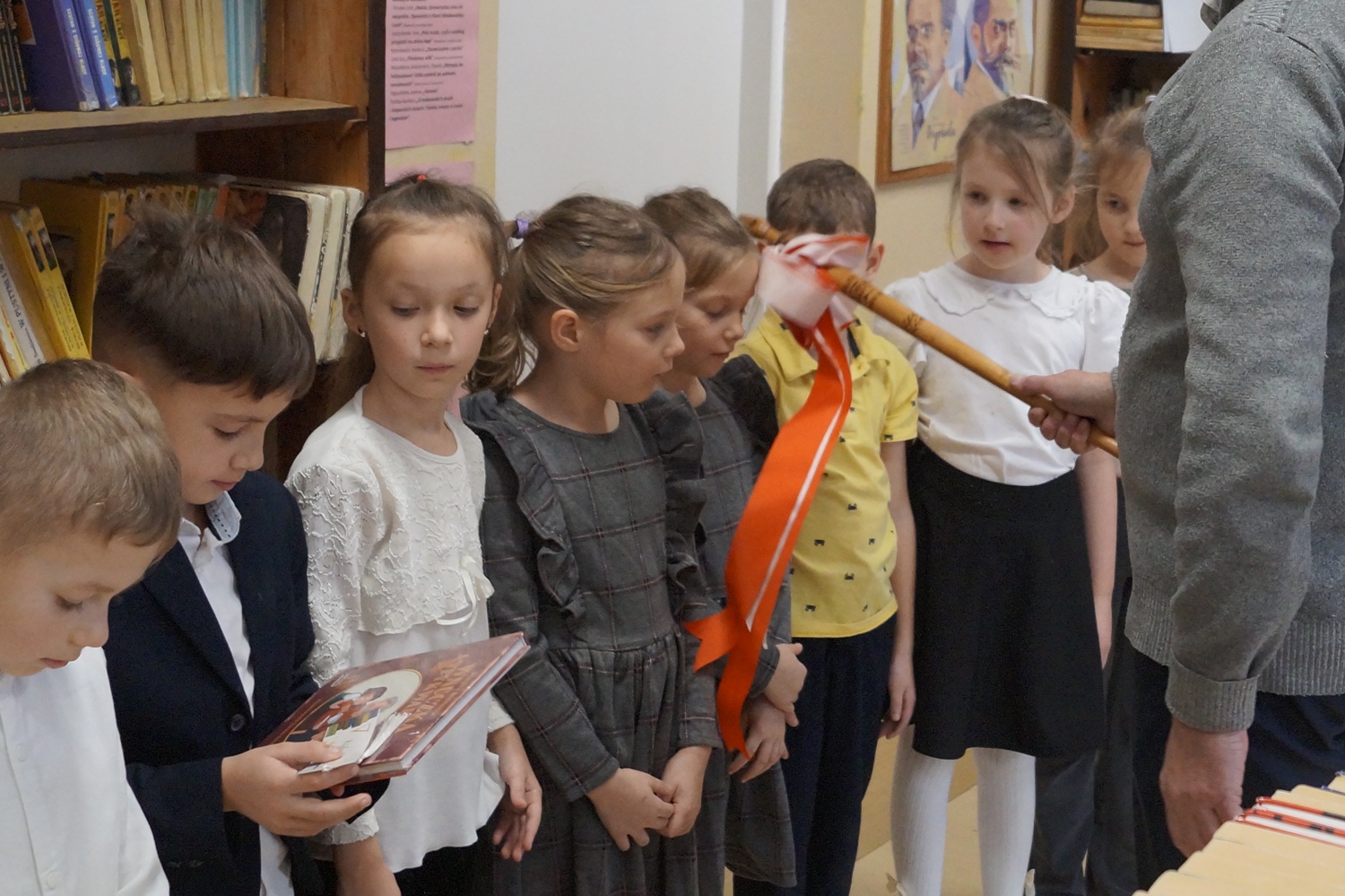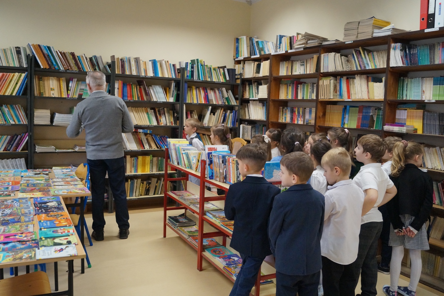 Uczniowie klasy Ib i Ia przybyli do biblioteki odświętnie ubrani wraz ze swoimi wychowawczyniami: p. Małgorzatą Siwiak i p. Beatą Rodak. Na korytarzu przywitał ich bibliotekarz szkolny, p. Wiesław Łaś.