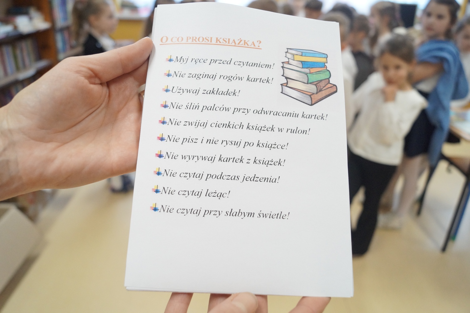 Następnie zapoznał ich z regulaminem biblioteki oraz jej zbiorami, ze szczególnym uwzględnieniem pozycji dla nich przeznaczonych. Później zaprezentował dzieciom karty czytelnika i kartę książki oraz przeprowadził pogadankę na temat tego, o co prosi książka. W dalszej kolejności rozdał im kartki z prośbami książki, które potem wkleili do swoich zeszytów.