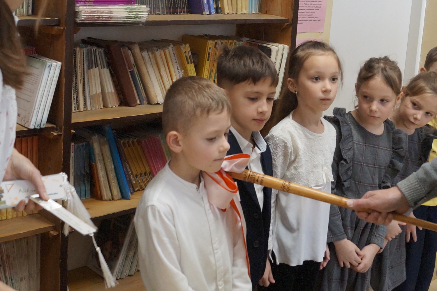 Po zakończeniu tej czynności uczniowie zostali ustawieni w szeregu i bibliotekarz dokonał aktu pasowania na czytelnika symbolicznym piórem. Na pamiątkę tej doniosłej chwili pierwszoklasiści otrzymali od przedstawiciela SU piękne zakładki.