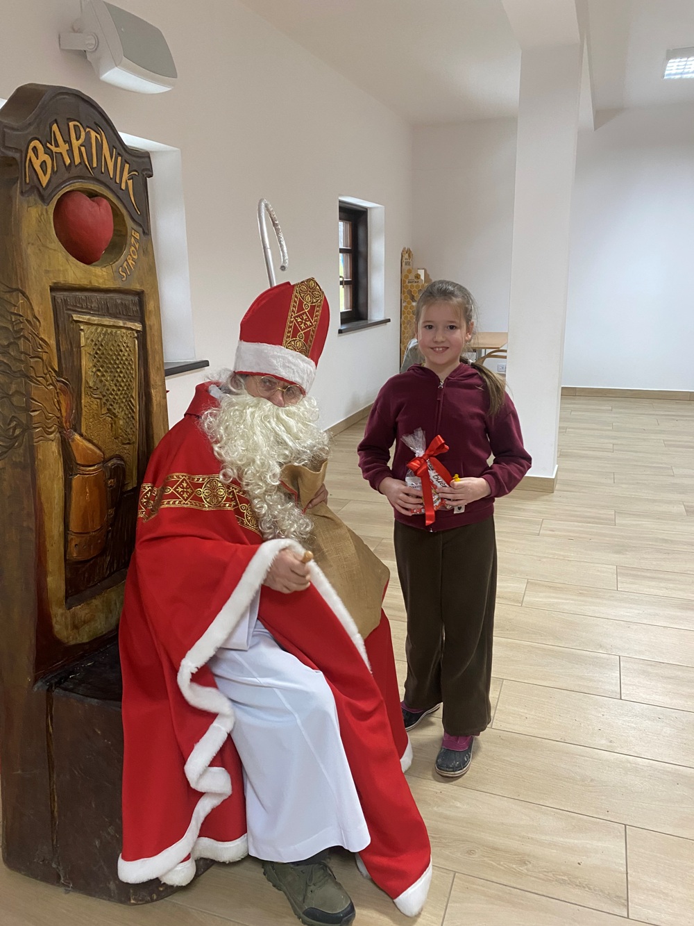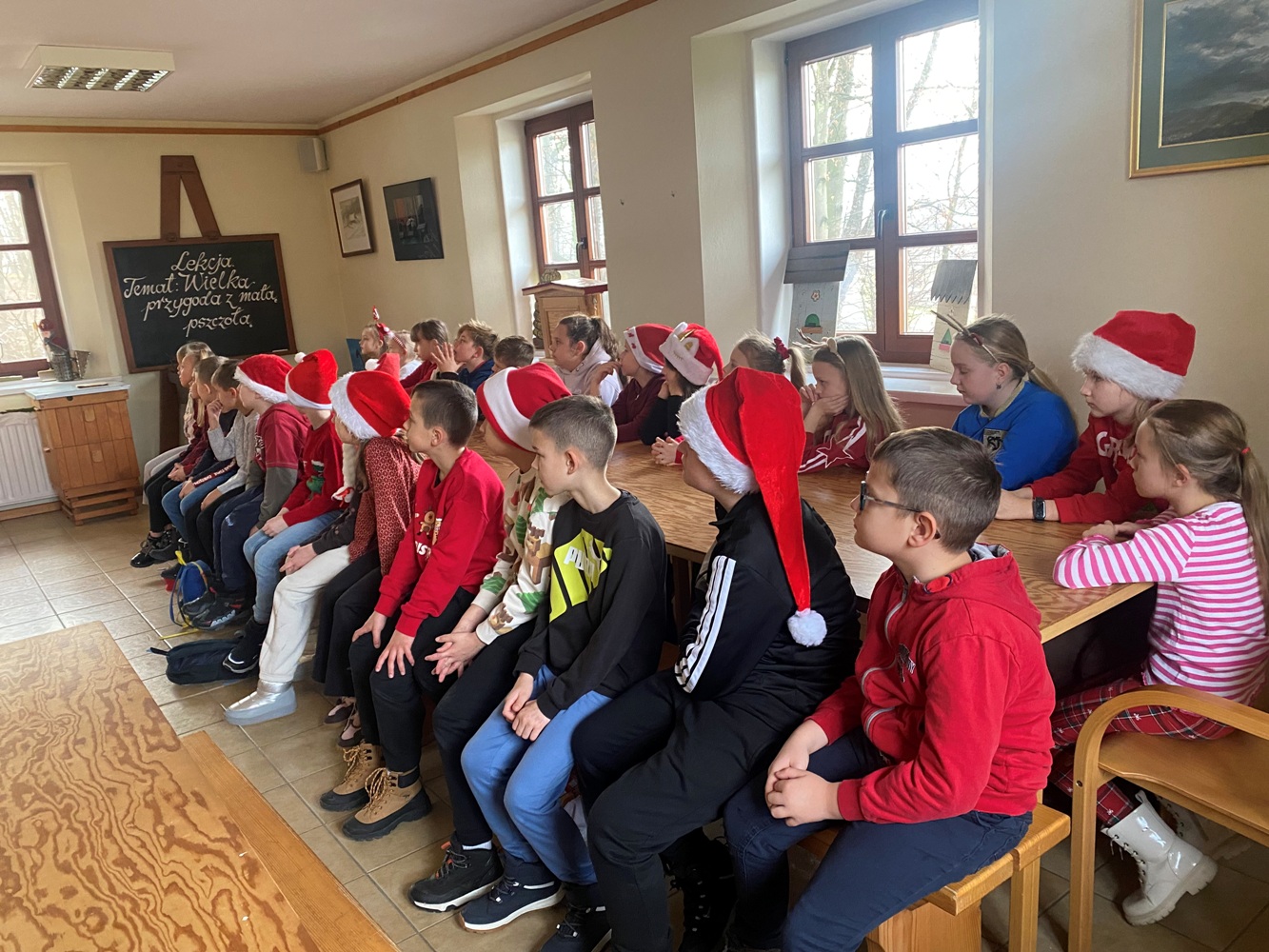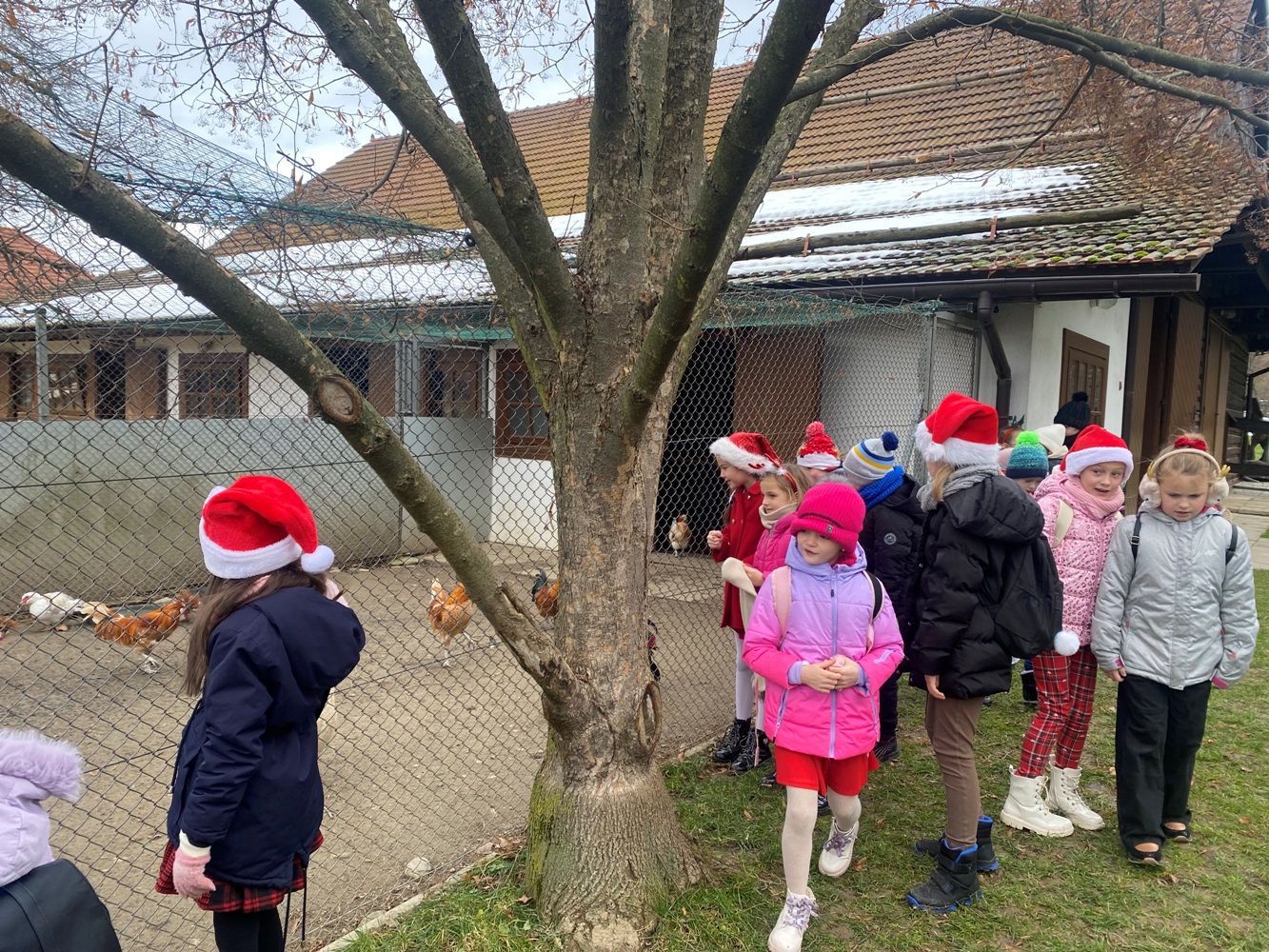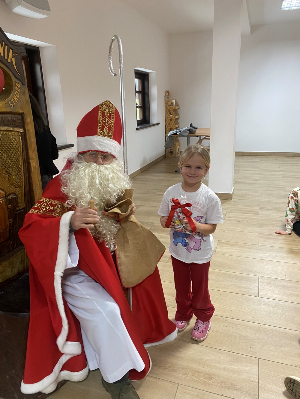 5 grudnia 2025 r. uczniowie klasy 1A oraz 3, zaproszeni przez samego Św. Mikołaja, wybrali się do „Sądeckiego Bartnika” w Stróżach. Pobyt rozpoczęli od wysłuchania pięknej historii o Św. Mikołaju i warsztatów piernikowych. Następnie pani przewodnik zaprosiła wszystkich do zwiedzania „Gospodarskiej Zagrody”, w której dzieci miały okazję z bliska przyjrzeć się kozom, koniom i osiołkom oraz pooglądać różnego gatunku ptactwo domowe. Miały również możliwość karmić kozy oraz skosztować sera koziego. W dalszej części pobytu uczniowie obejrzeli teatrzyk pt. „Pszczółka i Przyjaciele” – barwny, wesoły i bardzo pouczający oraz wzięli udział w mikołajkowych zabawach i grach animacyjnych…, aż nadszedł wyczekiwany przez dzieci moment – spotkanie ze Św. Mikołajem. Każdy z uczestników wycieczki otrzymując prezent od Św. Mikołaja miał okazję z nim porozmawiać oraz zrobić pamiątkowe zdjęcie.