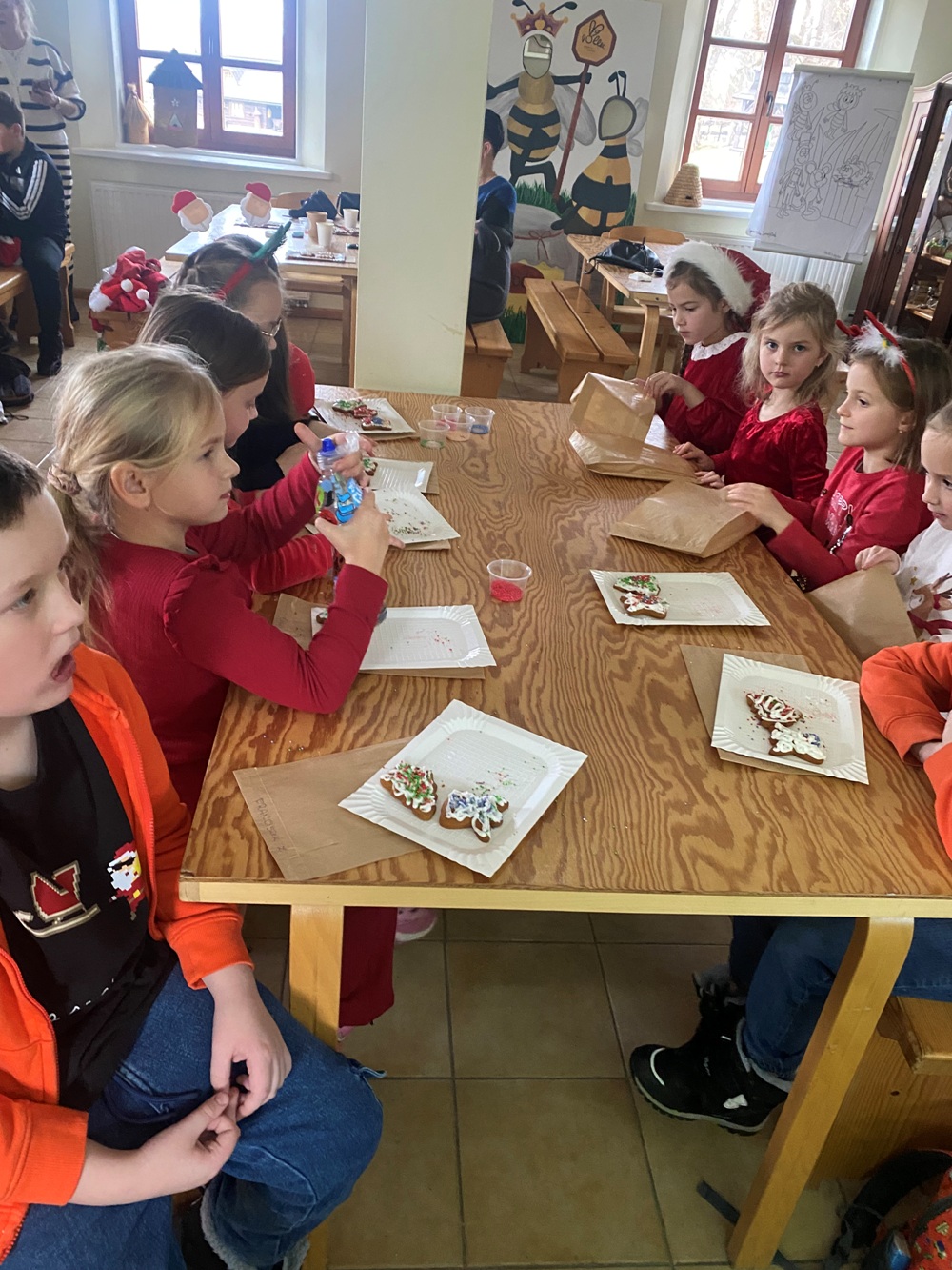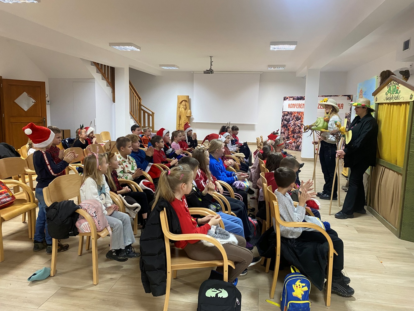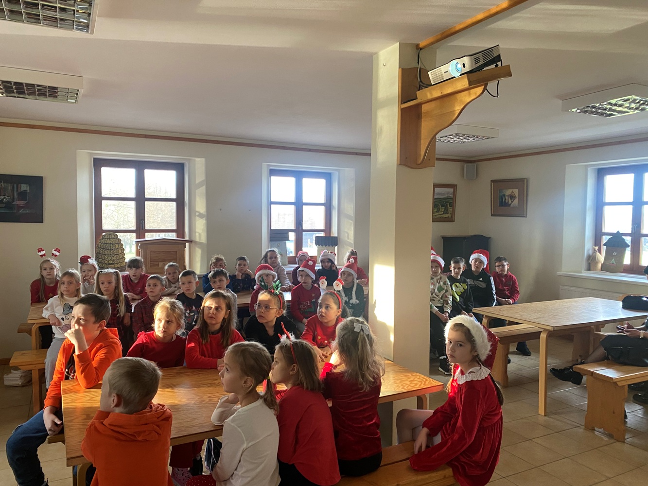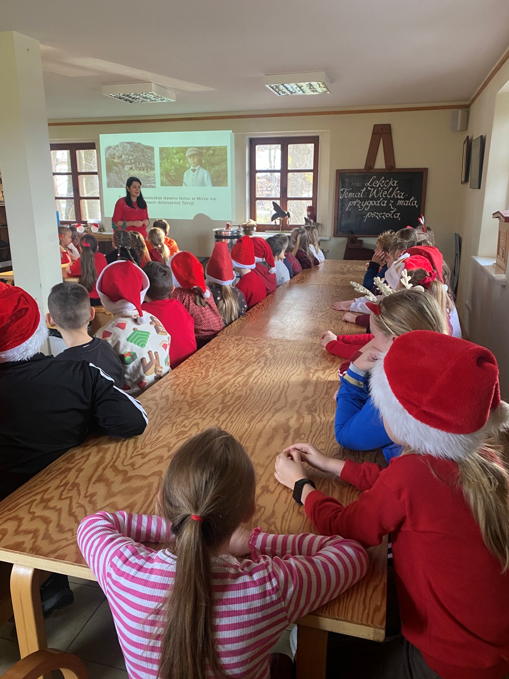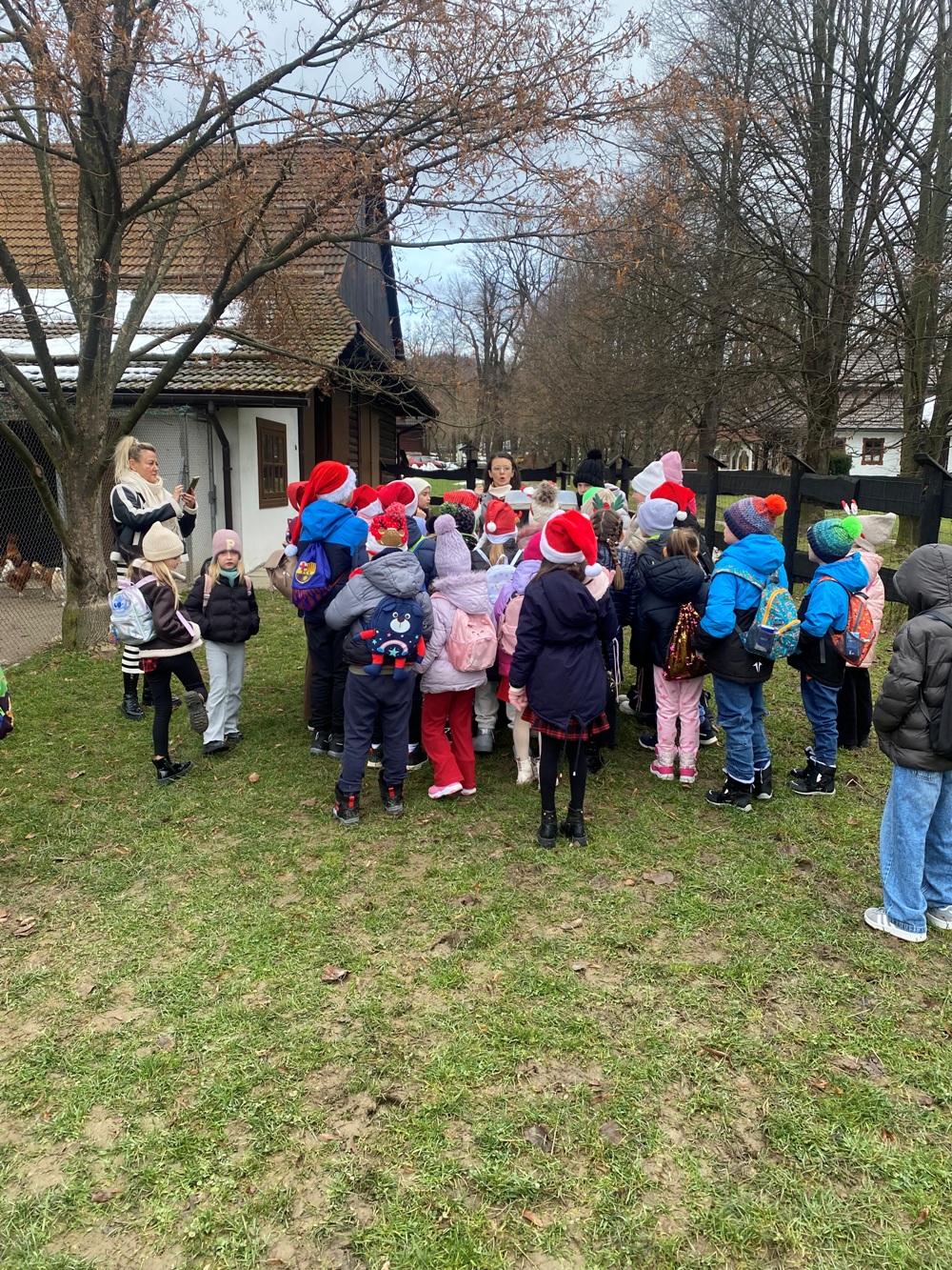 5 grudnia 2025 r. uczniowie klasy 1A oraz 3, zaproszeni przez samego Św. Mikołaja, wybrali się do „Sądeckiego Bartnika” w Stróżach. Pobyt rozpoczęli od wysłuchania pięknej historii o Św. Mikołaju i warsztatów piernikowych. Następnie pani przewodnik zaprosiła wszystkich do zwiedzania „Gospodarskiej Zagrody”, w której dzieci miały okazję z bliska przyjrzeć się kozom, koniom i osiołkom oraz pooglądać różnego gatunku ptactwo domowe. Miały również możliwość karmić kozy oraz skosztować sera koziego. W dalszej części pobytu uczniowie obejrzeli teatrzyk pt. „Pszczółka i Przyjaciele” – barwny, wesoły i bardzo pouczający oraz wzięli udział w mikołajkowych zabawach i grach animacyjnych…, aż nadszedł wyczekiwany przez dzieci moment – spotkanie ze Św. Mikołajem. Każdy z uczestników wycieczki otrzymując prezent od Św. Mikołaja miał okazję z nim porozmawiać oraz zrobić pamiątkowe zdjęcie.