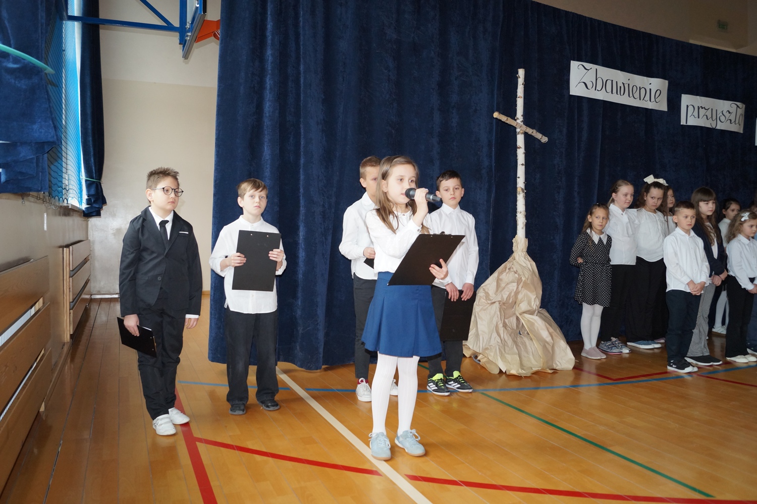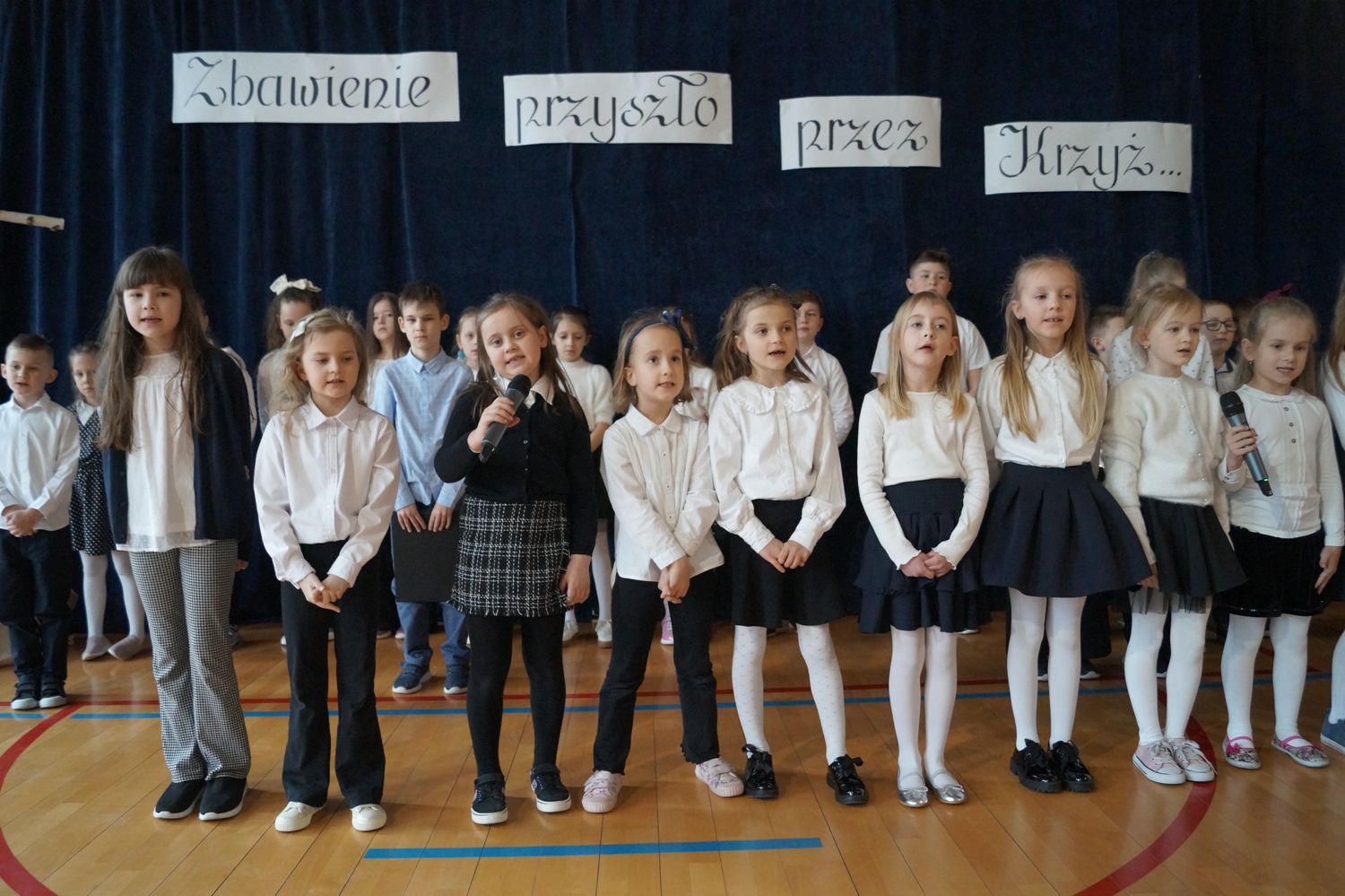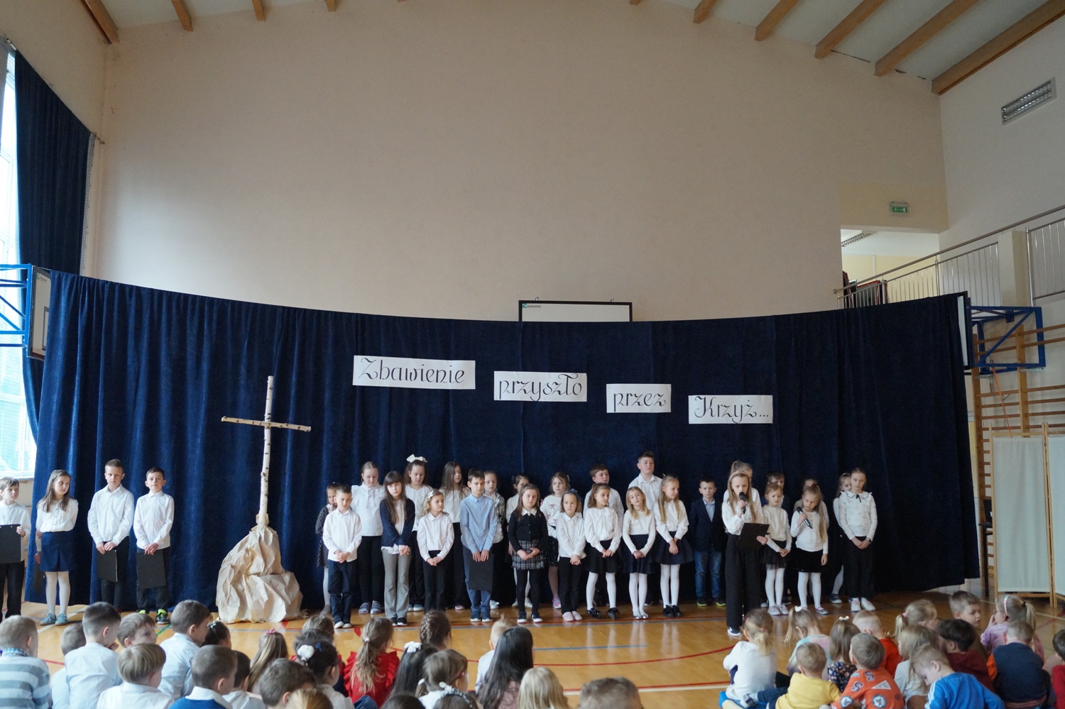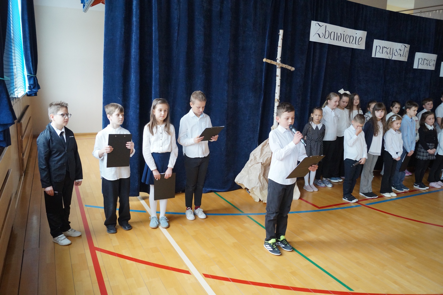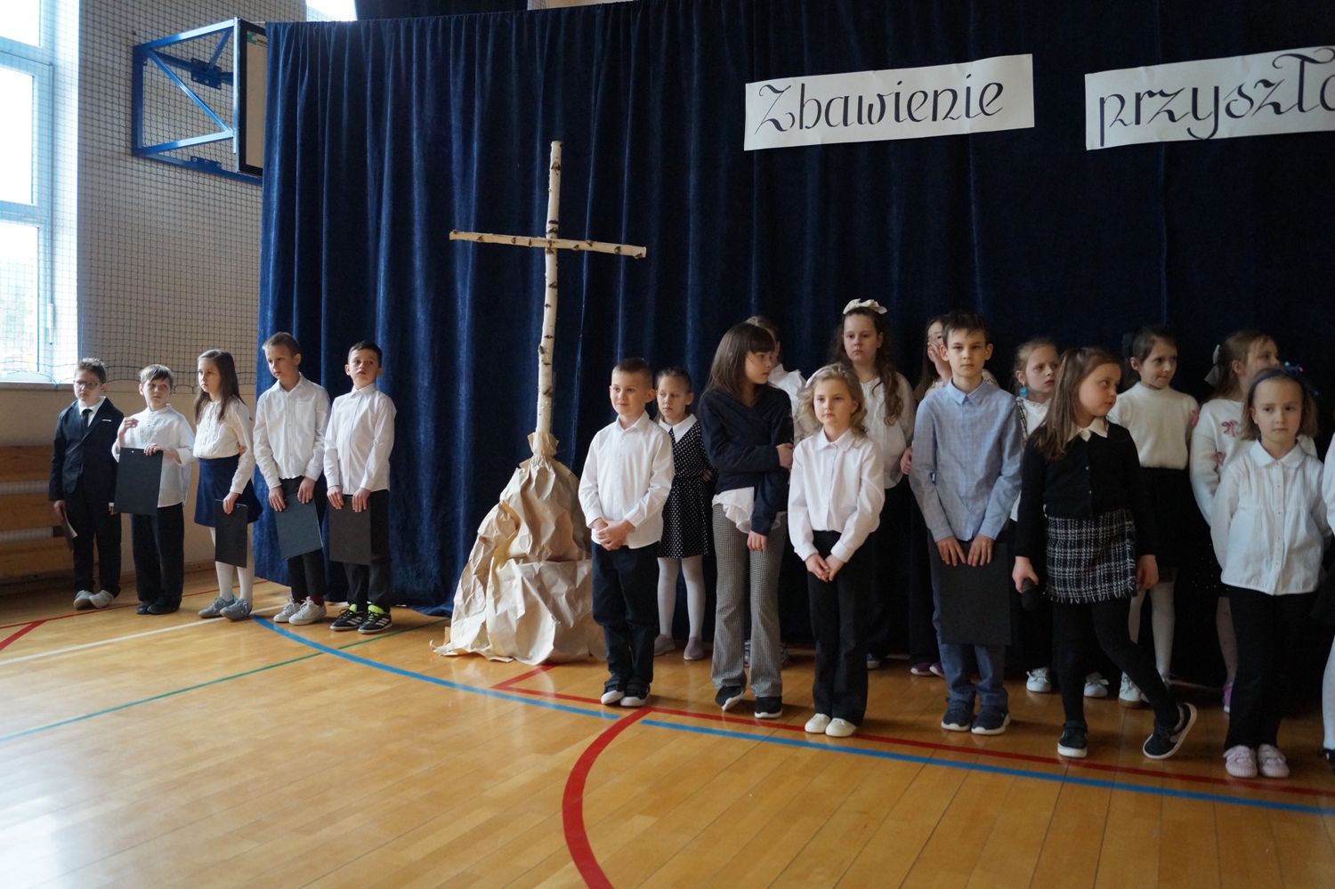 "Zbawienie przyszło przez krzyż" - pod takim tytułem uczniowie klasy Ia i klasy III w dniu 1 kwietnia 2026 roku podczas uroczystej akademii wprowadzili nas w klimat świąt paschalnych. Zebrani na uroczystym apelu mogli pogłębić ducha swojej wiary i w zadumie nad własnym życiem, przygotować się do przeżywania świąt Zmartwychwstania Pańskiego. Scenariusz wielkanocnego montażu słowno-muzycznego wzbogaciły piękne pieśni wielkopostne zaśpiewane przez naszych wspaniałych artystów.