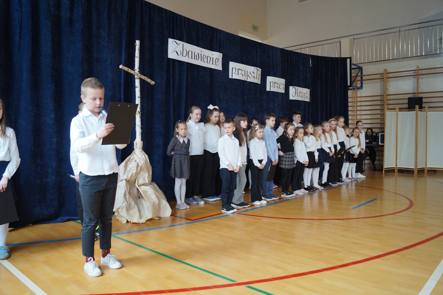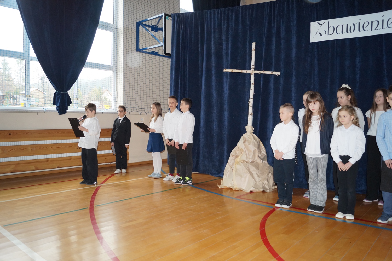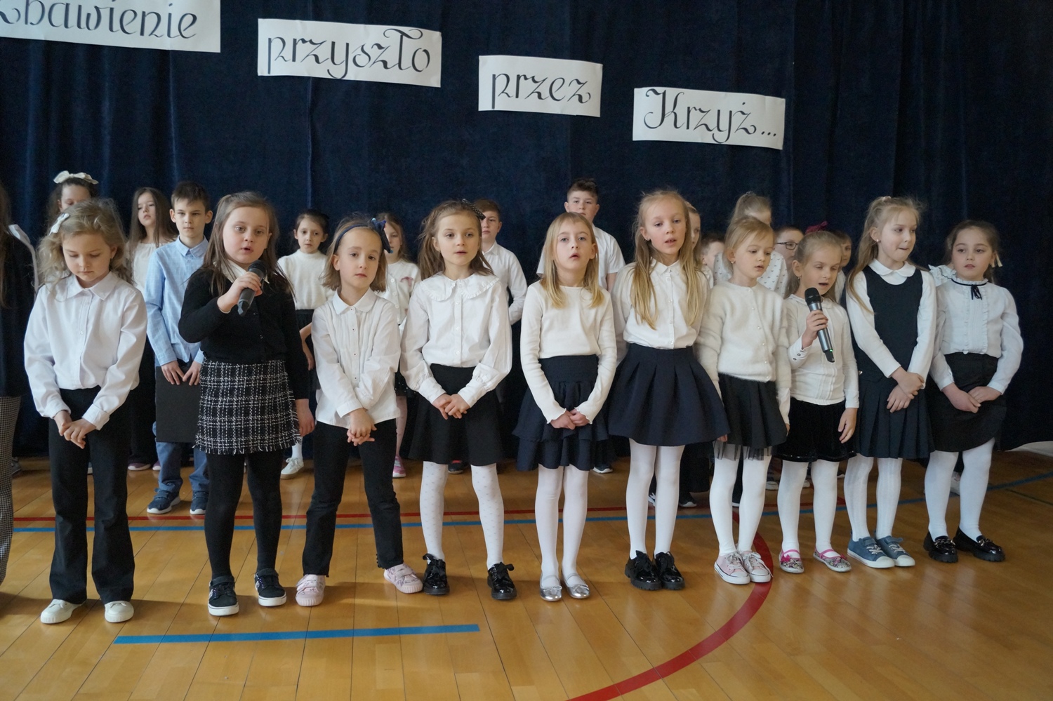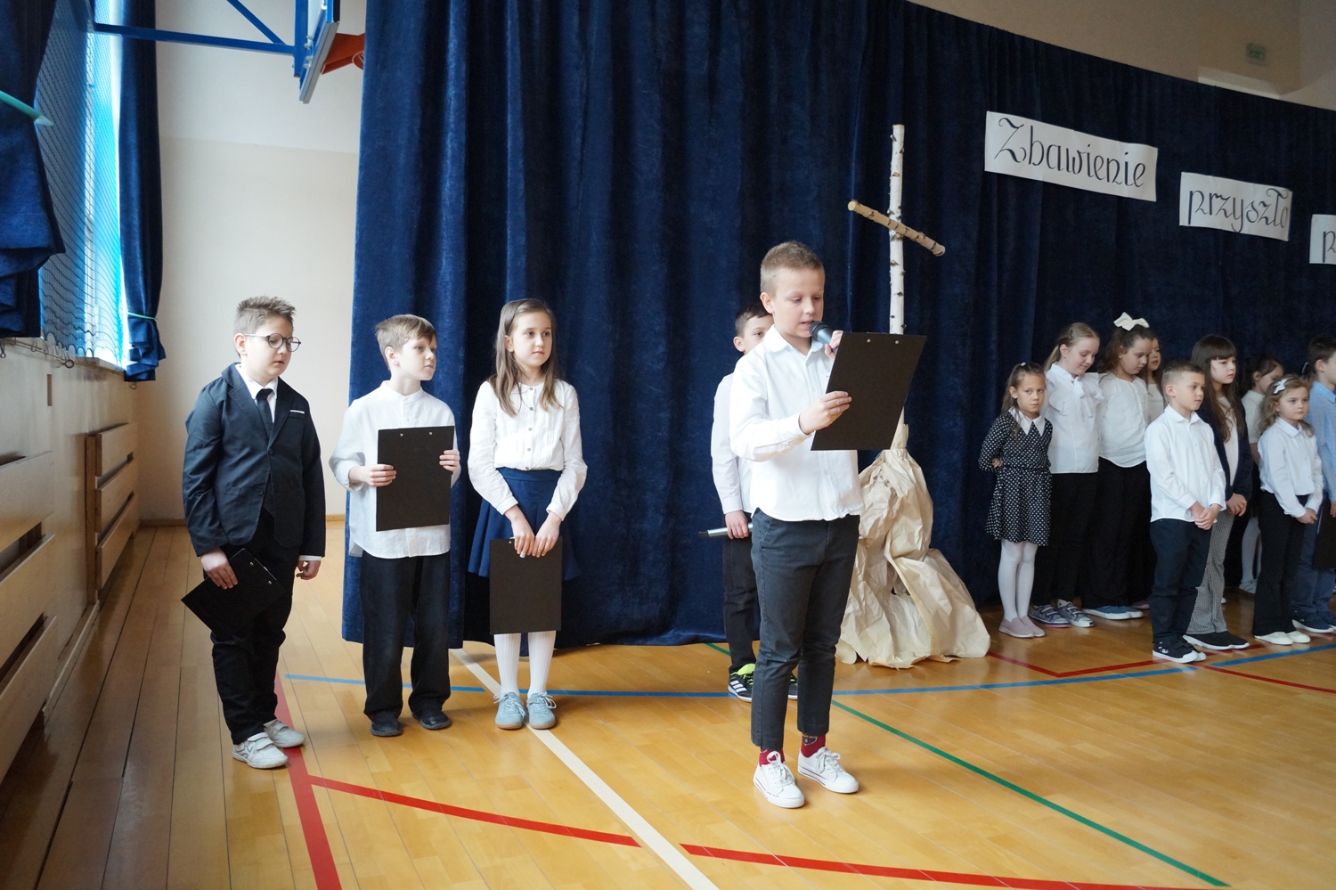 "Zbawienie przyszło przez krzyż" - pod takim tytułem uczniowie klasy Ia i klasy III w dniu 1 kwietnia 2026 roku podczas uroczystej akademii wprowadzili nas w klimat świąt paschalnych. Zebrani na uroczystym apelu mogli pogłębić ducha swojej wiary i w zadumie nad własnym życiem, przygotować się do przeżywania świąt Zmartwychwstania Pańskiego. Scenariusz wielkanocnego montażu słowno-muzycznego wzbogaciły piękne pieśni wielkopostne zaśpiewane przez naszych wspaniałych artystów.