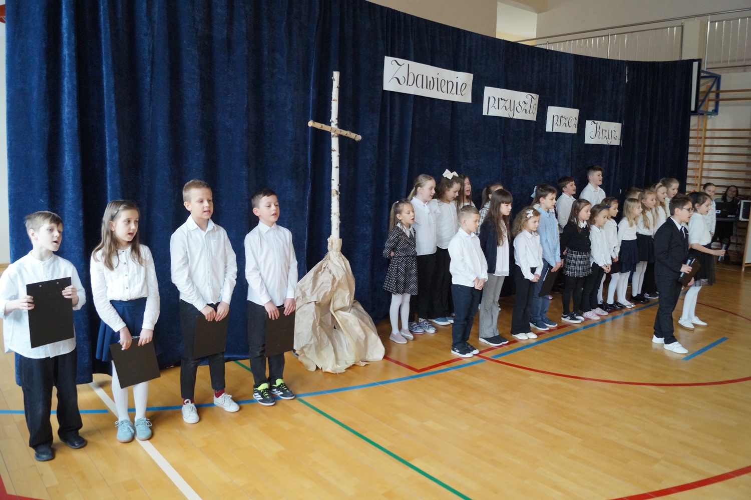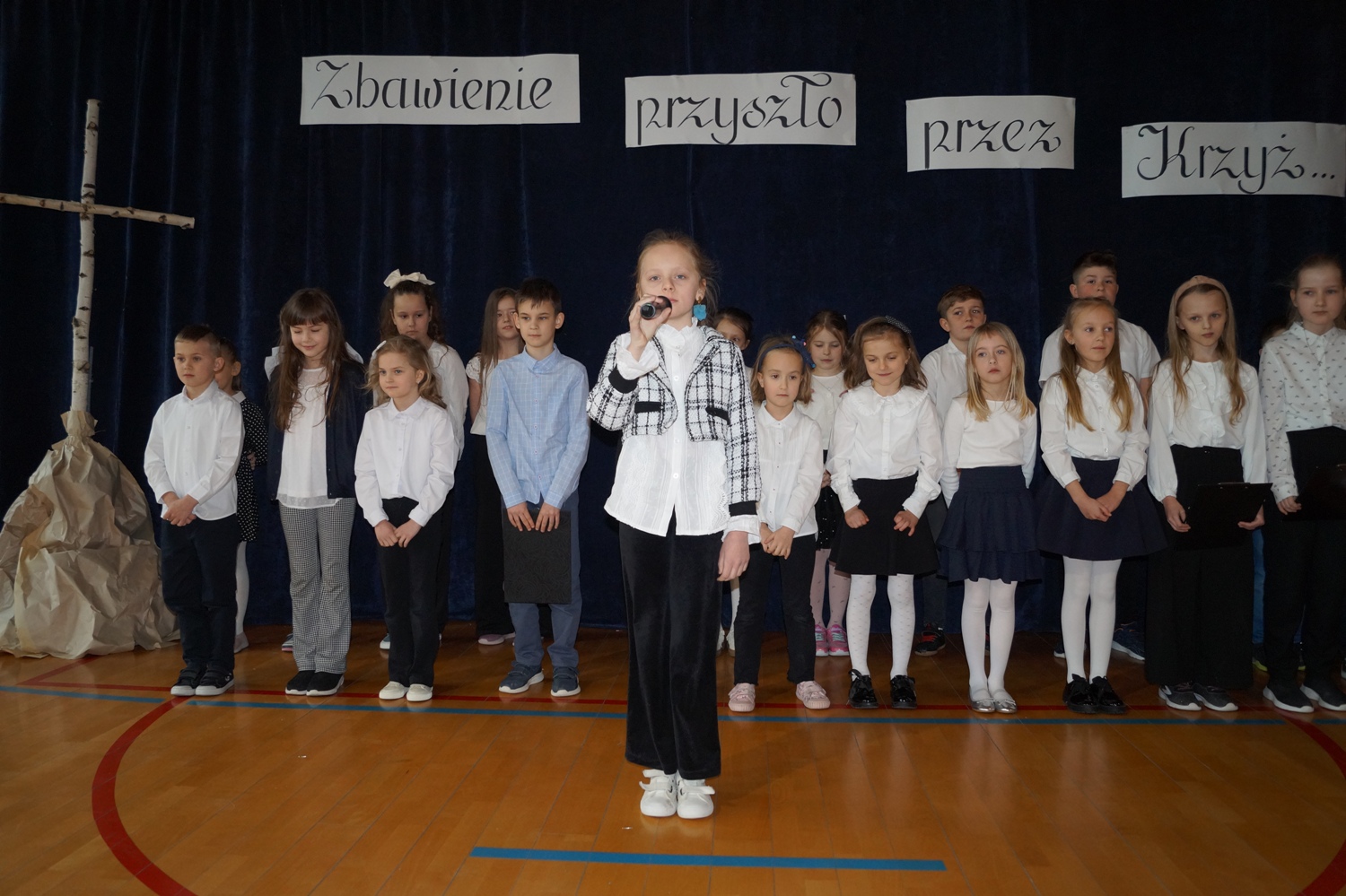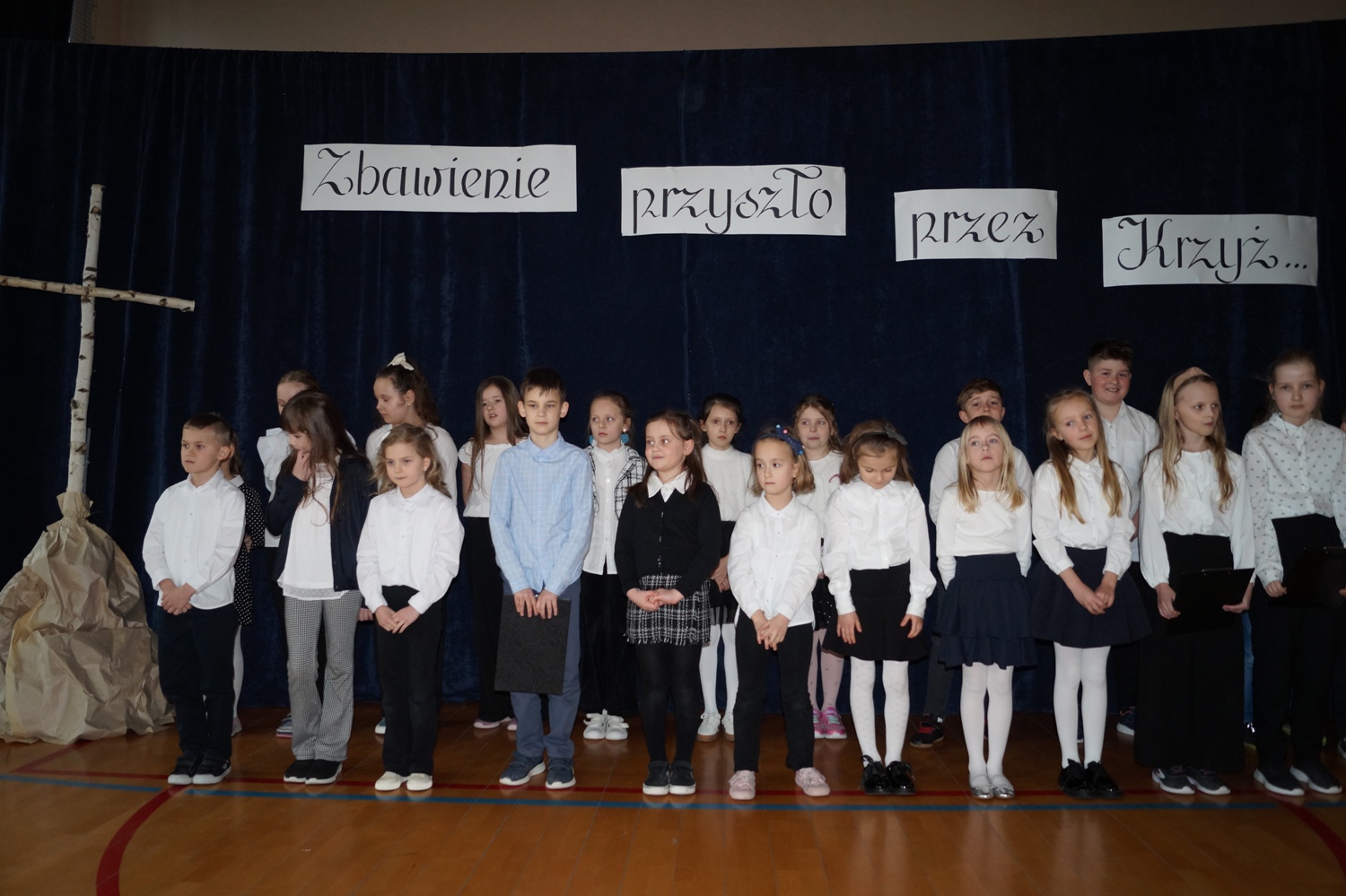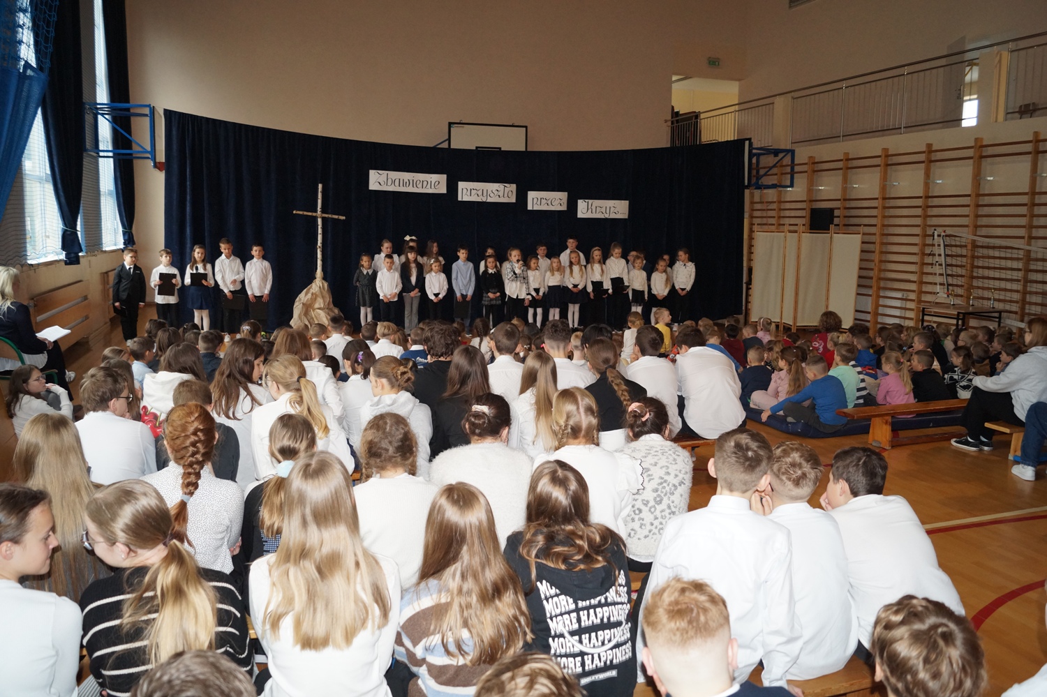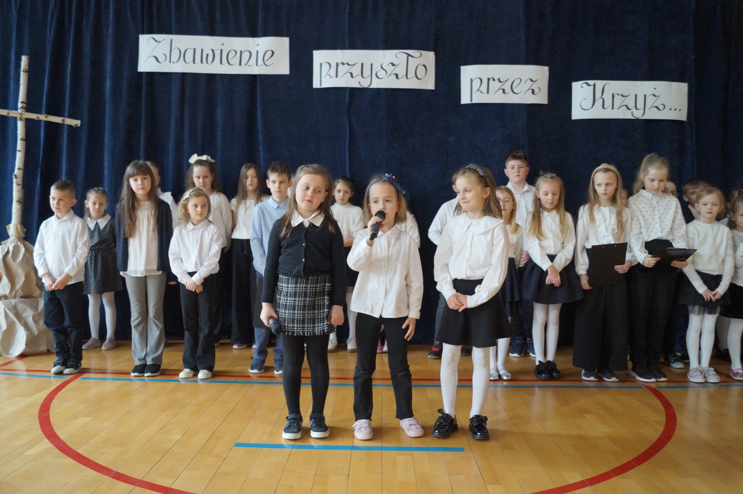 "Zbawienie przyszło przez krzyż" - pod takim tytułem uczniowie klasy Ia i klasy III w dniu 1 kwietnia 2026 roku podczas uroczystej akademii wprowadzili nas w klimat świąt paschalnych. Zebrani na uroczystym apelu mogli pogłębić ducha swojej wiary i w zadumie nad własnym życiem, przygotować się do przeżywania świąt Zmartwychwstania Pańskiego. Scenariusz wielkanocnego montażu słowno-muzycznego wzbogaciły piękne pieśni wielkopostne zaśpiewane przez naszych wspaniałych artystów.