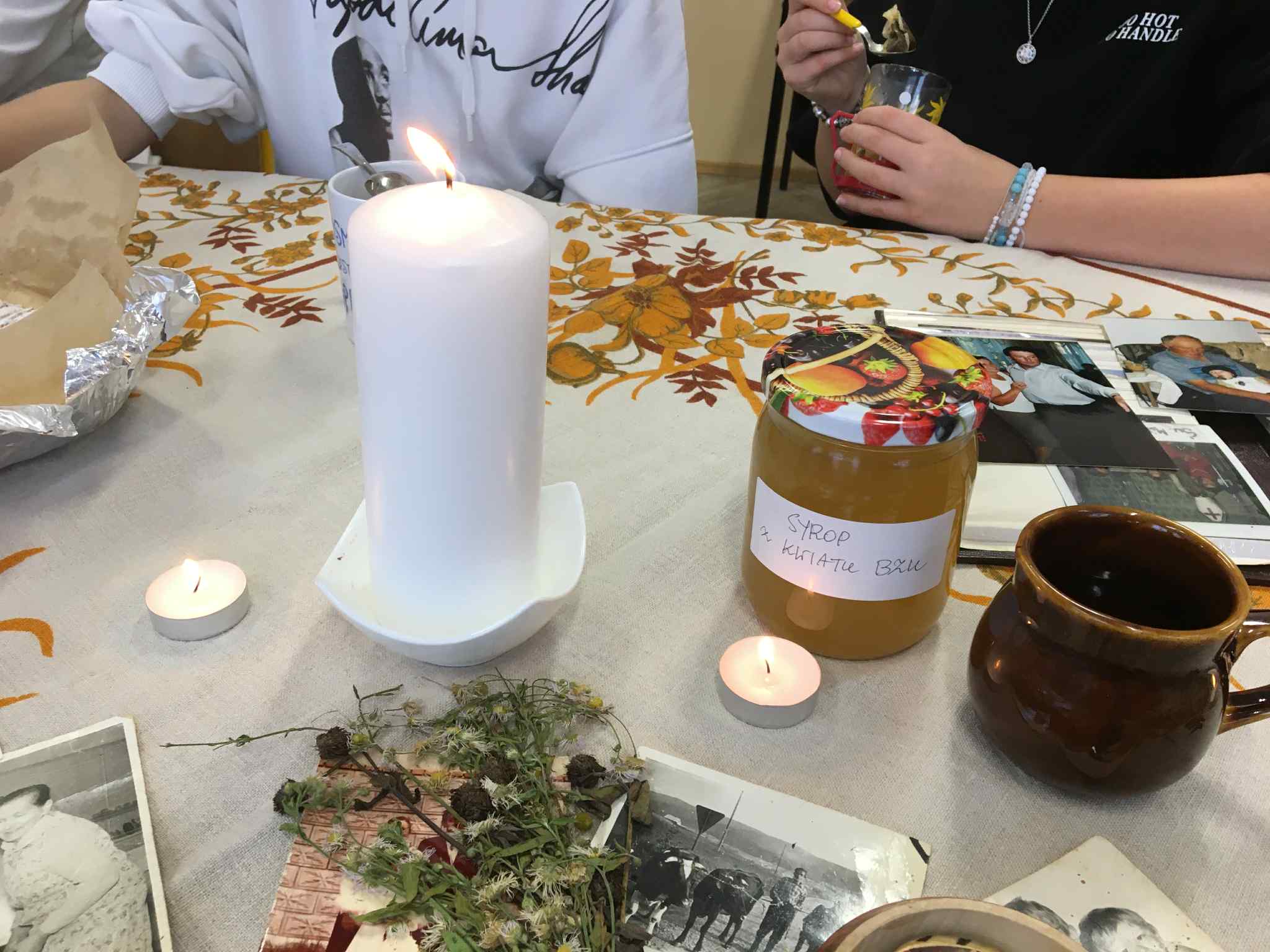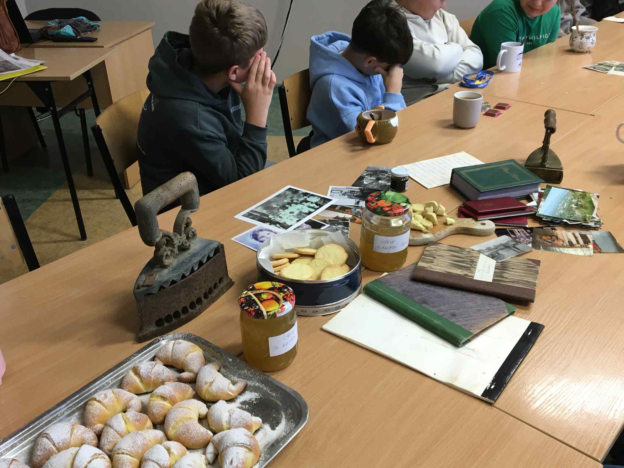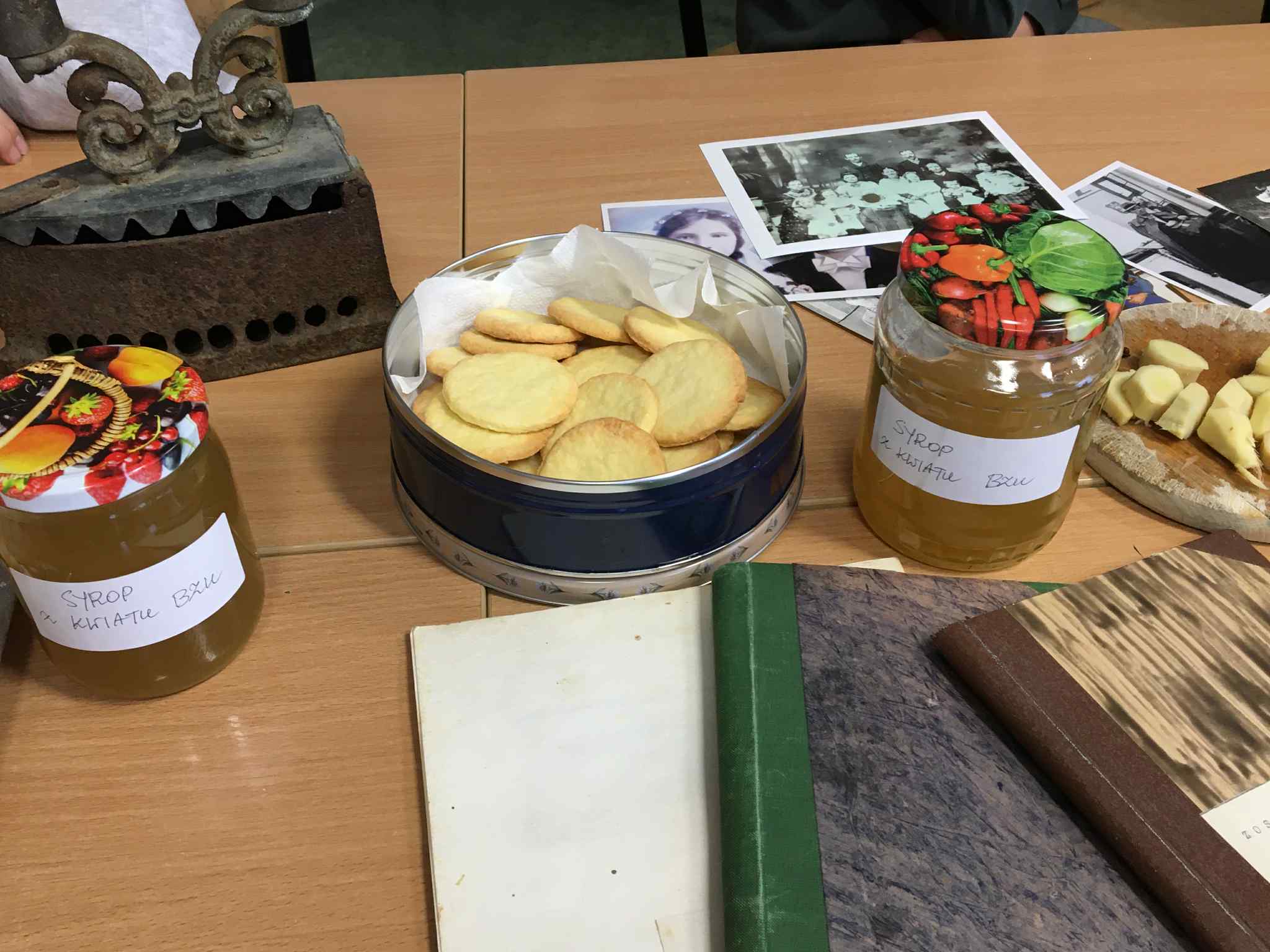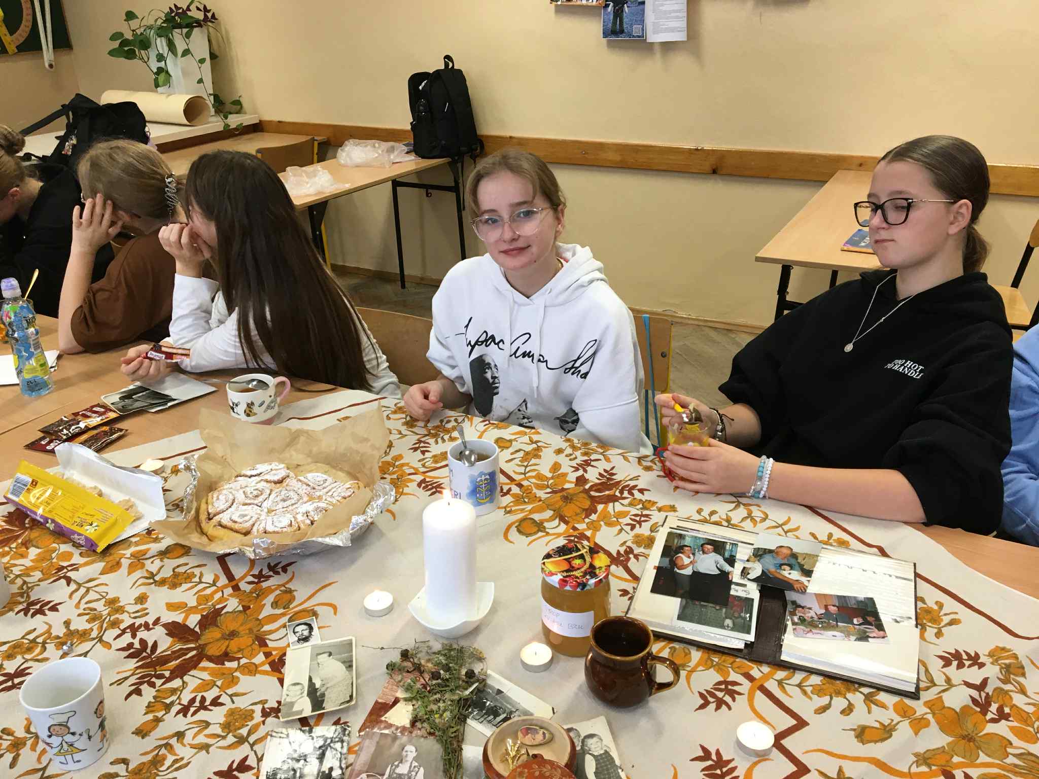 Uczniowie klasy VII i VIII rozpoczęli przygotowania do tych lekcji już pod koniec ubiegłego roku szkolnego. Wtedy to w pobliżu szkoły zrywali do wiklinowych koszyków kwiaty czarnego bzu, aby zrobić z niego leczniczy syrop wspierający odporność w sposób naturalny, według receptury naszych babć. Wraz z nastaniem jesiennej deszczowej aury młodzież postanowiła uatrakcyjnić zajęcia pyszną herbatką z dodatkiem syropu z kwiatu bzu, cytryną, imbirem i goździkami. Uczennice o zdolnościach kulinarnych zaserwowały ciasteczka, cynamonki i rogaliki według tradycyjnych receptur sprzed lat. Ponadto każdy uczeń zaprezentował pamiątki rodzinne, a wśród nich przedmioty codziennego użytku, jak żelazka na duszę, biżuterię, banknoty i dokumenty z czasów II wojny światowej, odznaczenia, pamiętniki i ogromną ilość fotografii z albumów rodzinnych. Prezentacji tych bezcennych rodzinnych źródeł historycznych towarzyszyły ciekawe opowieści, których na próżno byłoby szukać w szkolnych podręcznikach. Nie zabrakło też uzdolnionych muzycznie instrumentalistów, którzy na akordeonie, skrzypcach i klarnecie grali pieśni patriotyczne, a także regionalne utwory biesiadne. Jak się okazuje, historia to nie tylko daty, bitwy i inne ważne wydarzenia polityczne z minionych wieków. To także łączenie pokoleń, powrót do natury, muzyka, biesiada i przyjemność :)