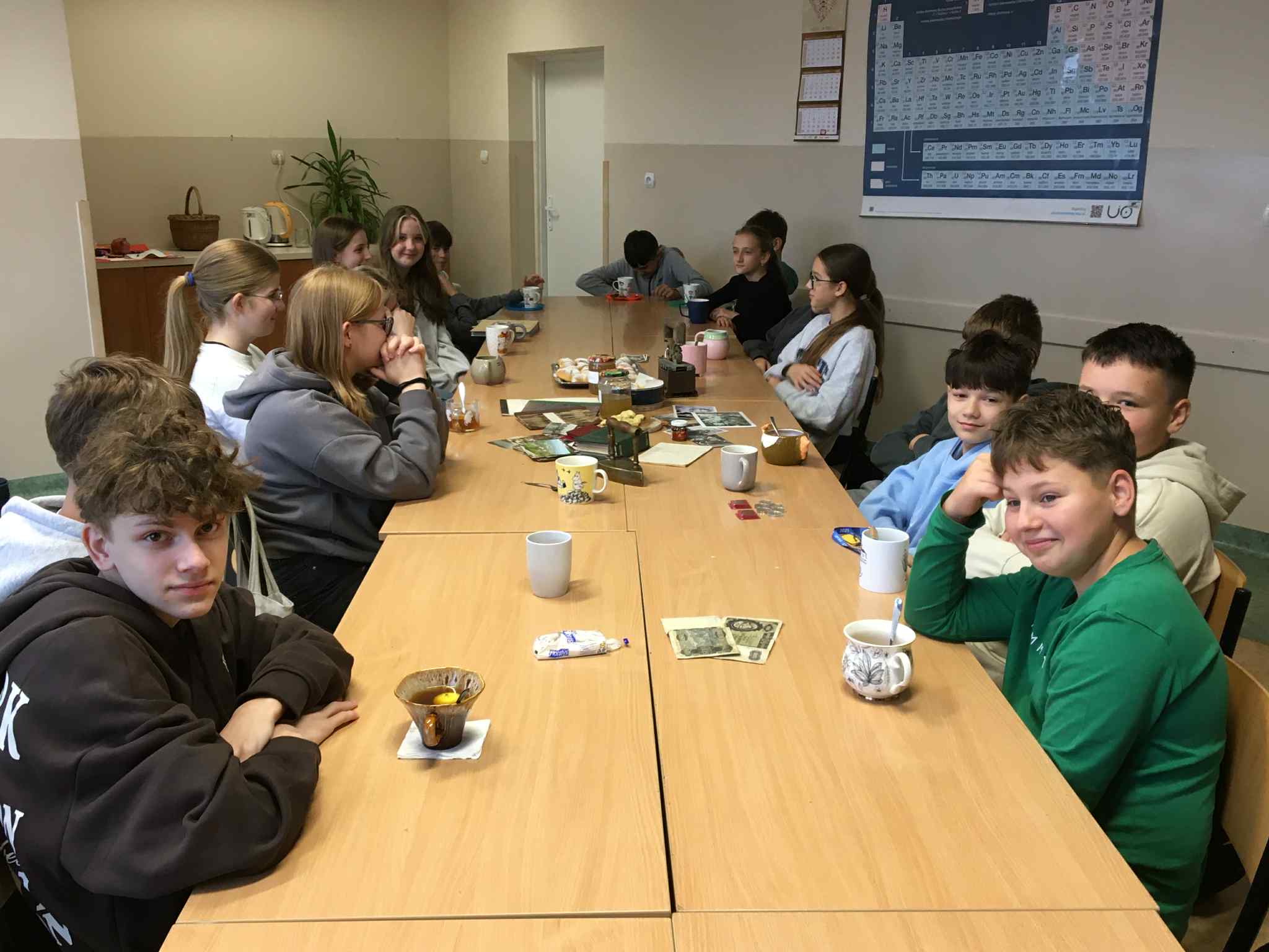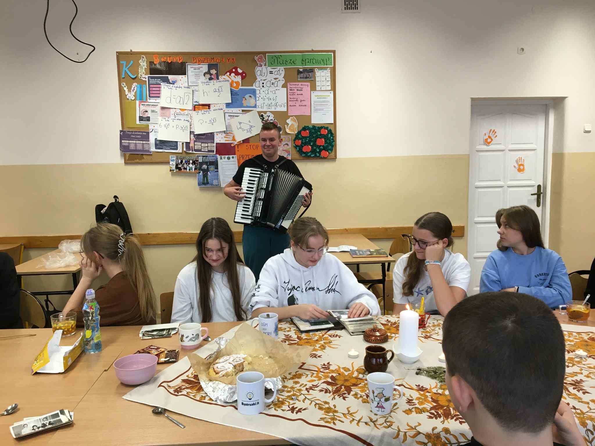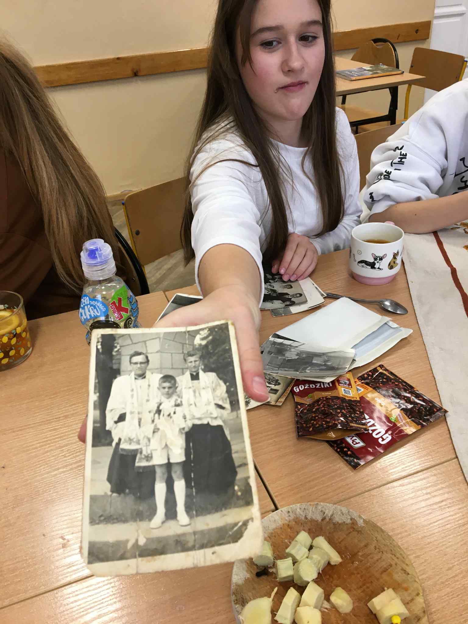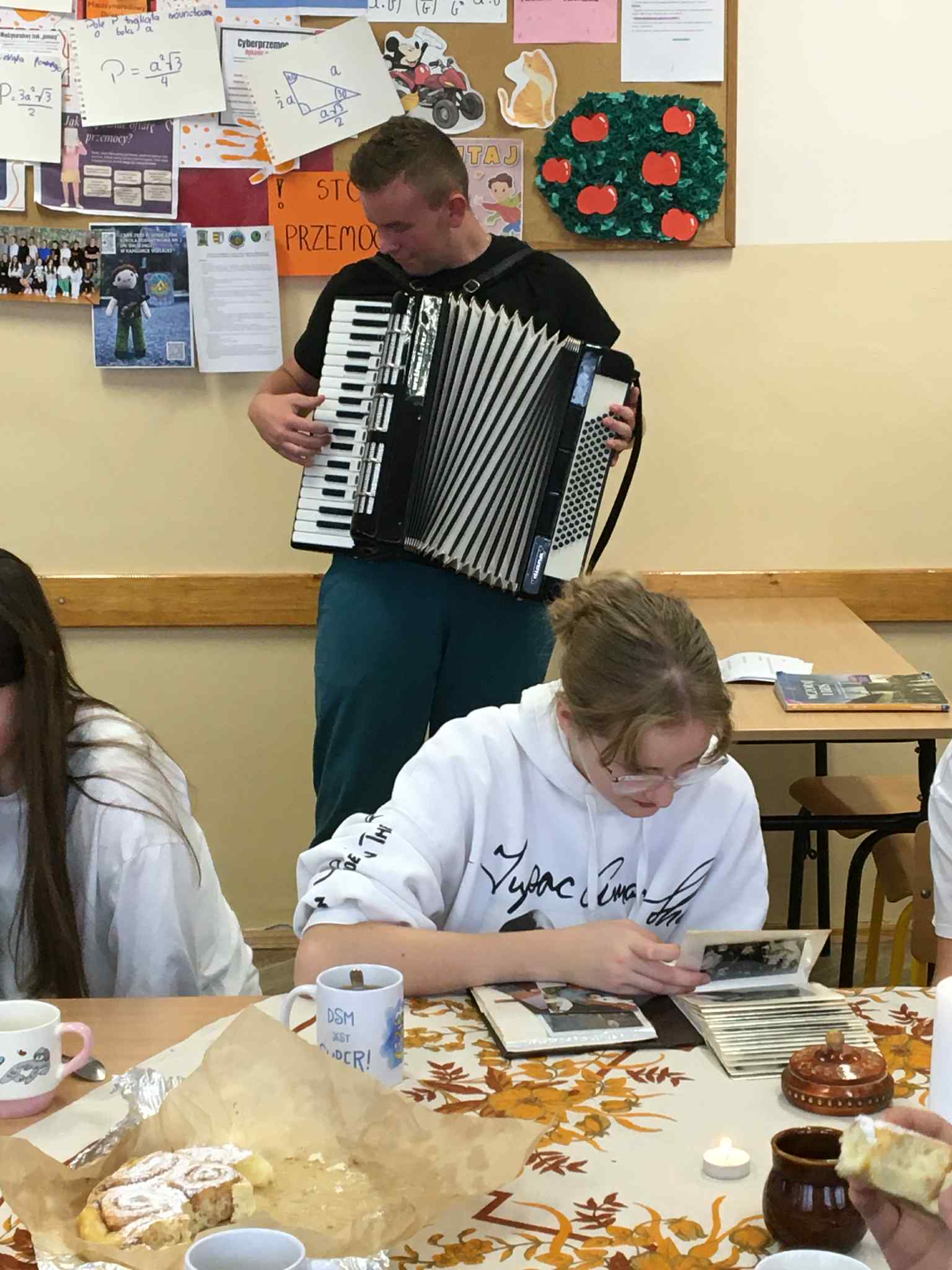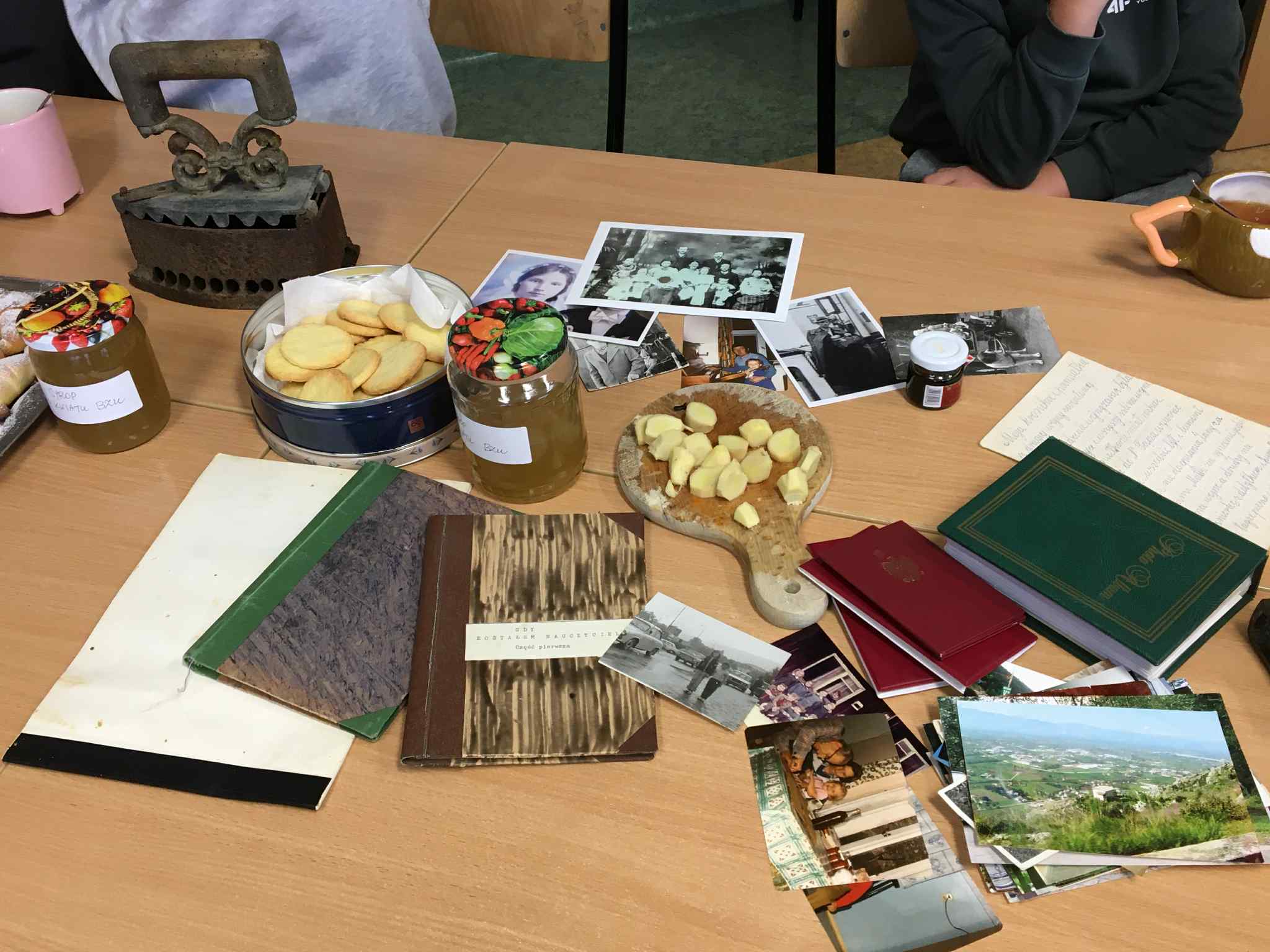 Uczniowie klasy VII i VIII rozpoczęli przygotowania do tych lekcji już pod koniec ubiegłego roku szkolnego. Wtedy to w pobliżu szkoły zrywali do wiklinowych koszyków kwiaty czarnego bzu, aby zrobić z niego leczniczy syrop wspierający odporność w sposób naturalny, według receptury naszych babć. Wraz z nastaniem jesiennej deszczowej aury młodzież postanowiła uatrakcyjnić zajęcia pyszną herbatką z dodatkiem syropu z kwiatu bzu, cytryną, imbirem i goździkami. Uczennice o zdolnościach kulinarnych zaserwowały ciasteczka, cynamonki i rogaliki według tradycyjnych receptur sprzed lat. Ponadto każdy uczeń zaprezentował pamiątki rodzinne, a wśród nich przedmioty codziennego użytku, jak żelazka na duszę, biżuterię, banknoty i dokumenty z czasów II wojny światowej, odznaczenia, pamiętniki i ogromną ilość fotografii z albumów rodzinnych. Prezentacji tych bezcennych rodzinnych źródeł historycznych towarzyszyły ciekawe opowieści, których na próżno byłoby szukać w szkolnych podręcznikach. Nie zabrakło też uzdolnionych muzycznie instrumentalistów, którzy na akordeonie, skrzypcach i klarnecie grali pieśni patriotyczne, a także regionalne utwory biesiadne. Jak się okazuje, historia to nie tylko daty, bitwy i inne ważne wydarzenia polityczne z minionych wieków. To także łączenie pokoleń, powrót do natury, muzyka, biesiada i przyjemność :)